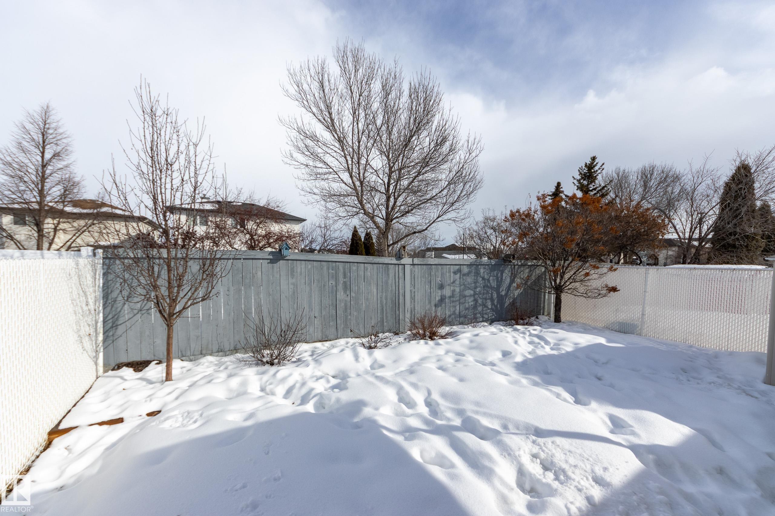 Thoughtfully designed half duplex is tucked into a quiet cul-de-sac in family friendly Elsinore! Just minutes from the Henday, schools, parks, and everyday amenities, this home offers both comfort and convenience. Stay cool all summer with full air conditioning and enjoy the ease of central vacuum. The main floor features rich hardwood and wide-plank laminate, a bright nook, and a stunning dining space with arched entry and custom maple hutch. The spacious primary bedroom includes a walk-in closet and 3-piece ensuite, while a second bedroom, full bath, and main-floor laundry add everyday ease. The partially finished basement offers a cozy bonus room with custom maple bar, plush carpet, 3-piece bath, plus ample storage--ideal for a bedroom, home office, gym, or movie nights. Outside, enjoy a fenced yard backing onto green space, a private patio perfect for summer BBQs, double attached garage, newer sump pump, and new humidifier. Warm, welcoming, and move-in ready!