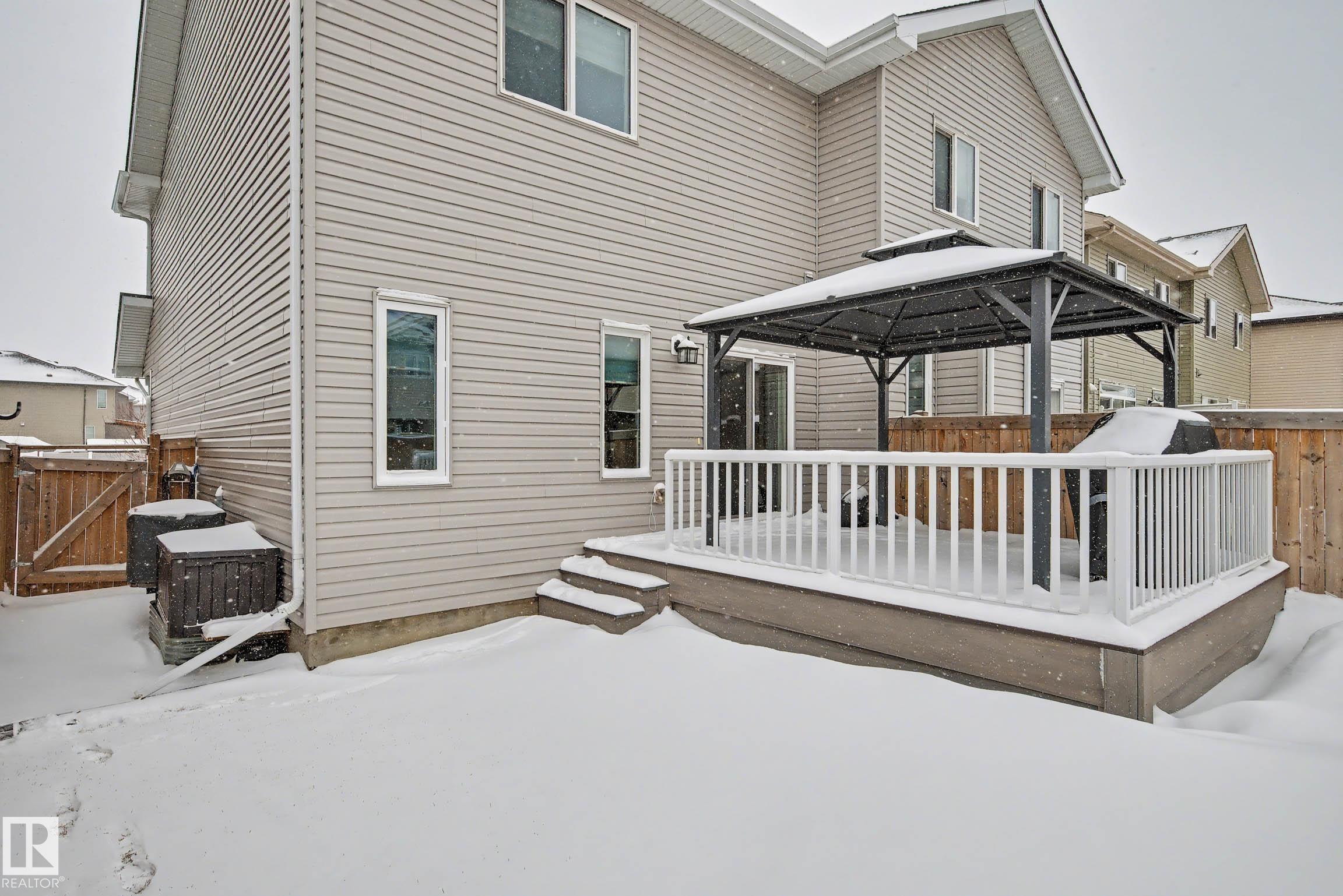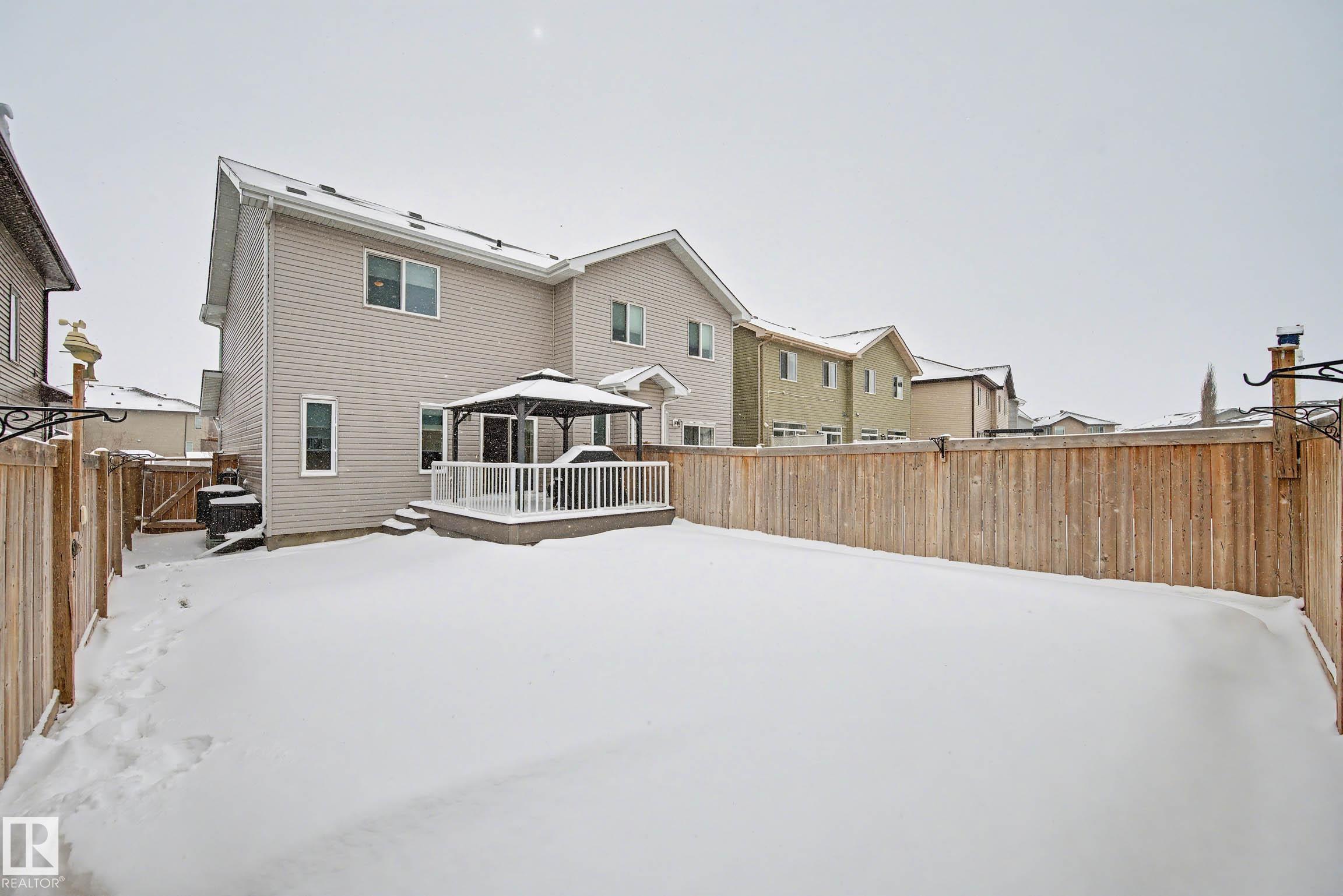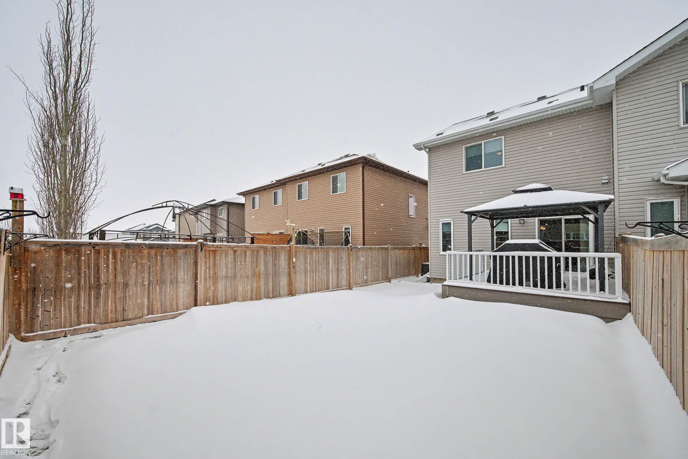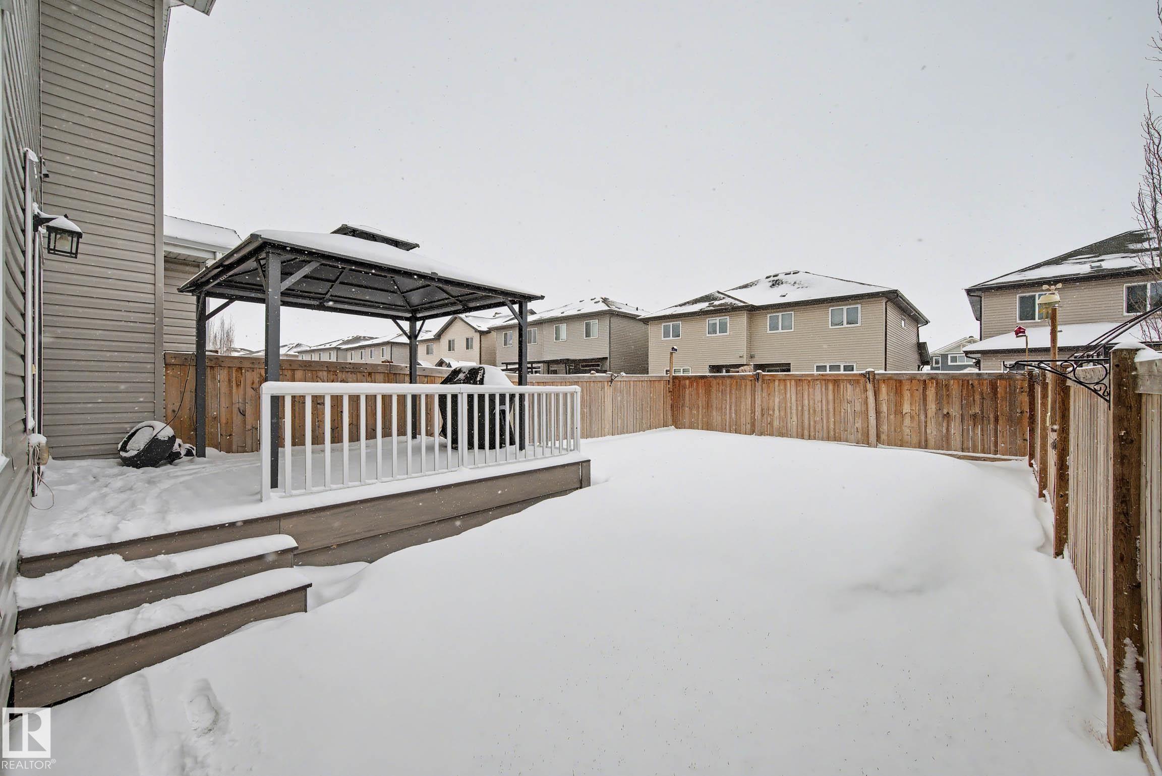 Beautifully finished 2-storey half-duplex offering 3 bedrooms and 3 bathrooms, complete with a single attached garage. The main floor features impressive 9' ceilings and an open-concept layout with laminate flooring throughout. The kitchen is well-appointed with maple cabinetry, a central island with eating ledge, and a convenient walk-through pantry, flowing into a spacious dining nook with patio doors leading to the backyard. Outside, enjoy the durable and low-maintenance composite deck & the front porch/steps are also finished in matching composite decking for added curb appeal and longevity. A stylish half bath with pedestal sink completes the main level. Upstairs, you'll find a convenient laundry area, a primary suite with walk-in closet and 4-piece ensuite, plus two additional well-sized bedrooms and a full bathroom. The unfinished basement offers endless potential for future development. This home offers plenty of outdoor space and is ideally located near parks with quick access to the Henday!