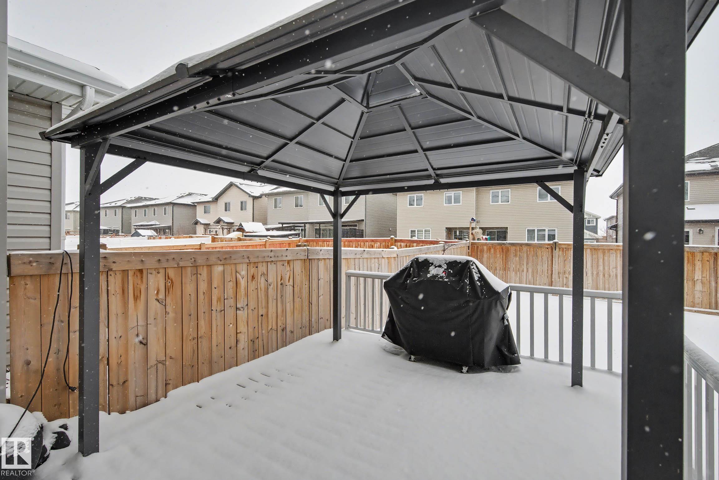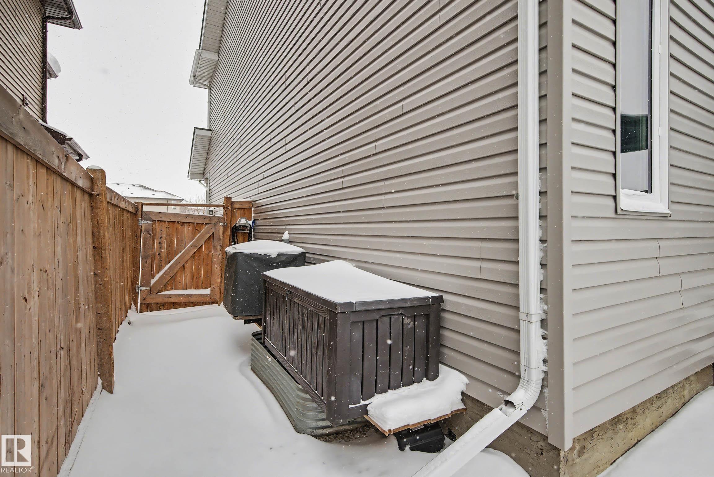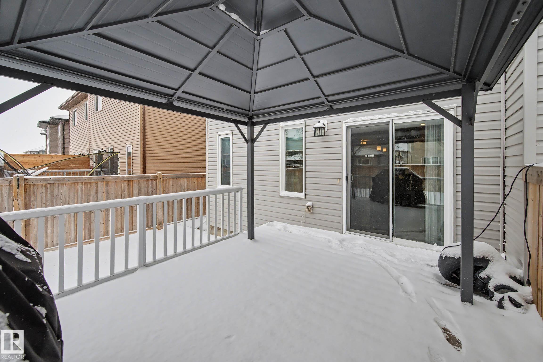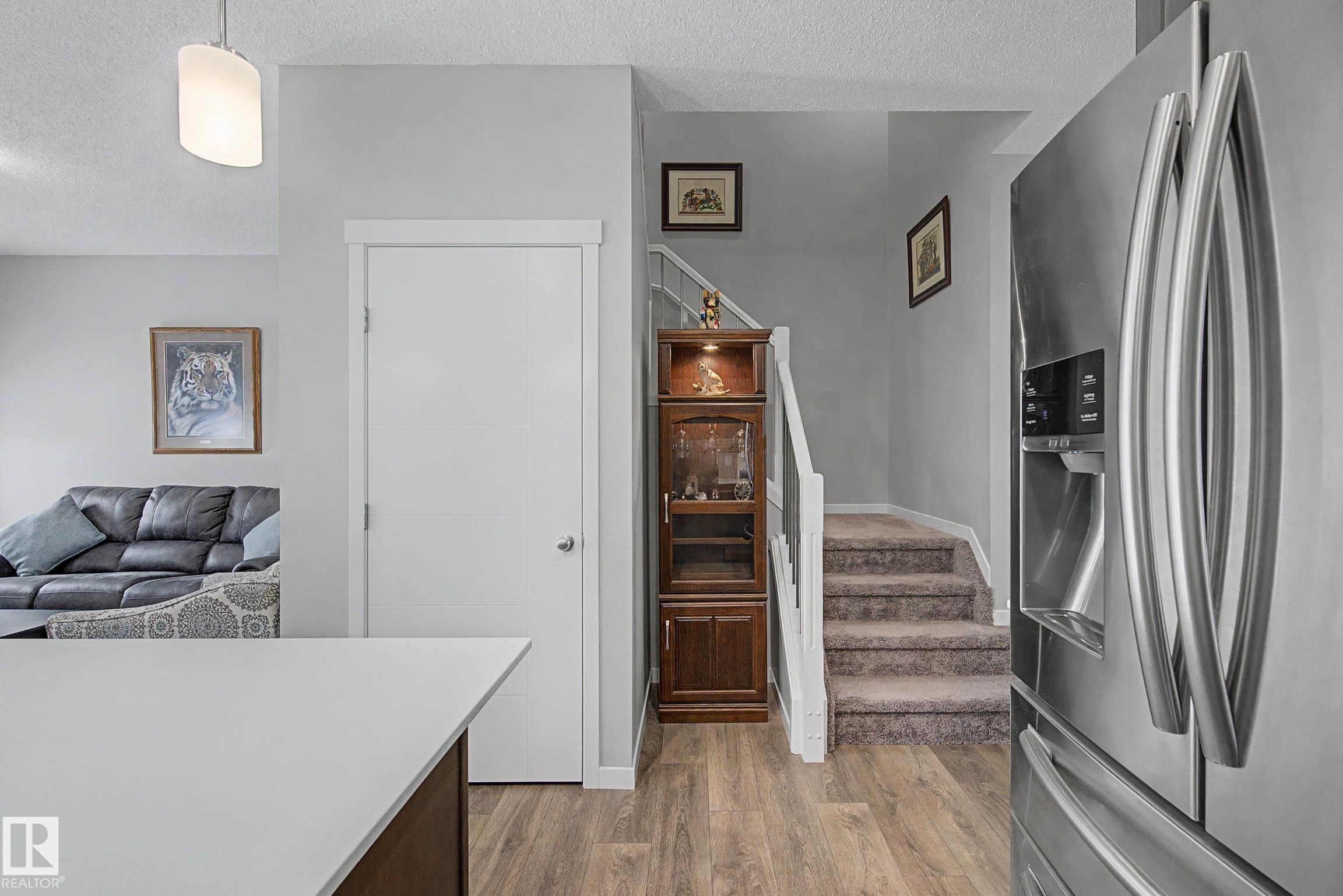 Beautifully finished 2-storey half-duplex offering 3 bedrooms and 3 bathrooms, complete with a single attached garage. The main floor features impressive 9' ceilings and an open-concept layout with laminate flooring throughout. The kitchen is well-appointed with maple cabinetry, a central island with eating ledge, and a convenient walk-through pantry, flowing into a spacious dining nook with patio doors leading to the backyard. Outside, enjoy the durable and low-maintenance composite deck & the front porch/steps are also finished in matching composite decking for added curb appeal and longevity. A stylish half bath with pedestal sink completes the main level. Upstairs, you'll find a convenient laundry area, a primary suite with walk-in closet and 4-piece ensuite, plus two additional well-sized bedrooms and a full bathroom. The unfinished basement offers endless potential for future development. This home offers plenty of outdoor space and is ideally located near parks with quick access to the Henday!