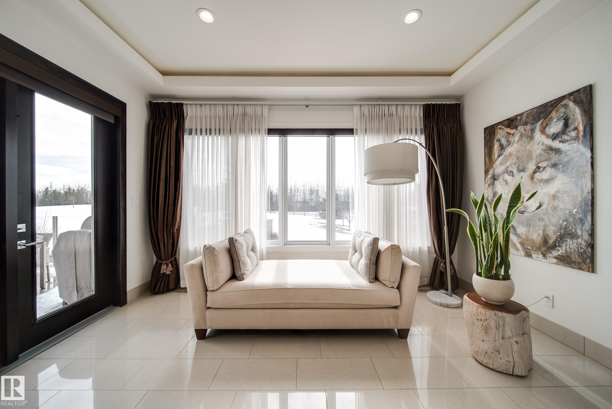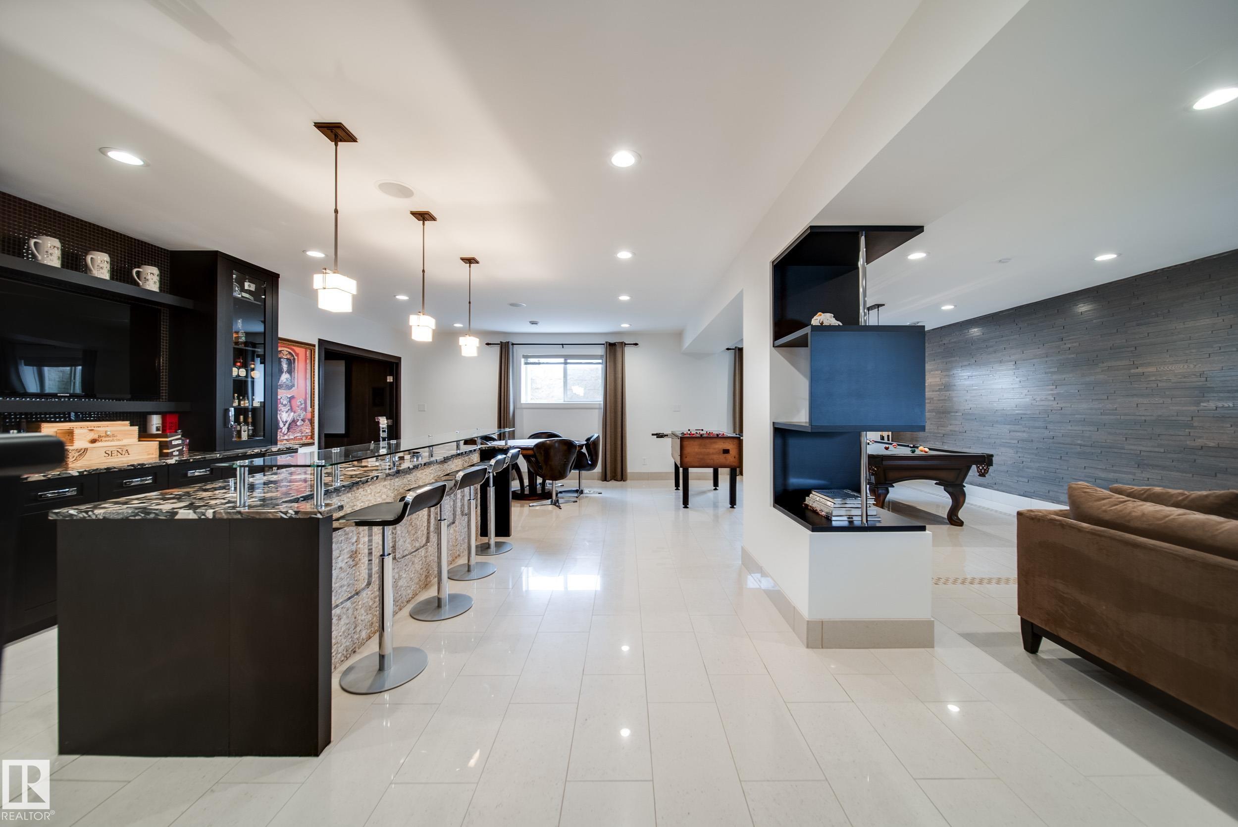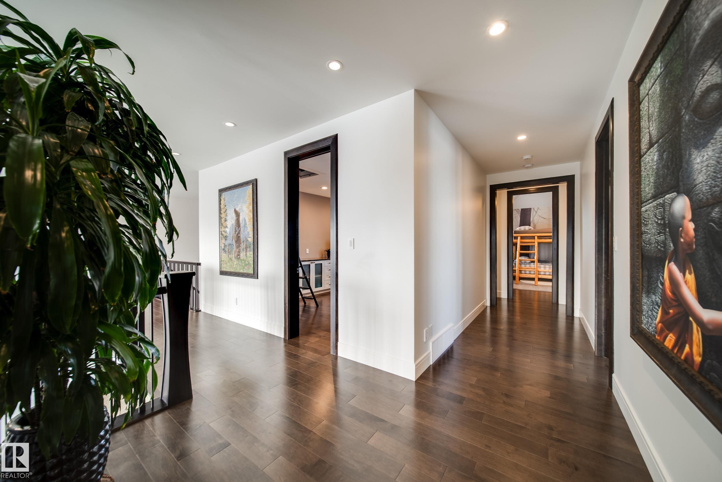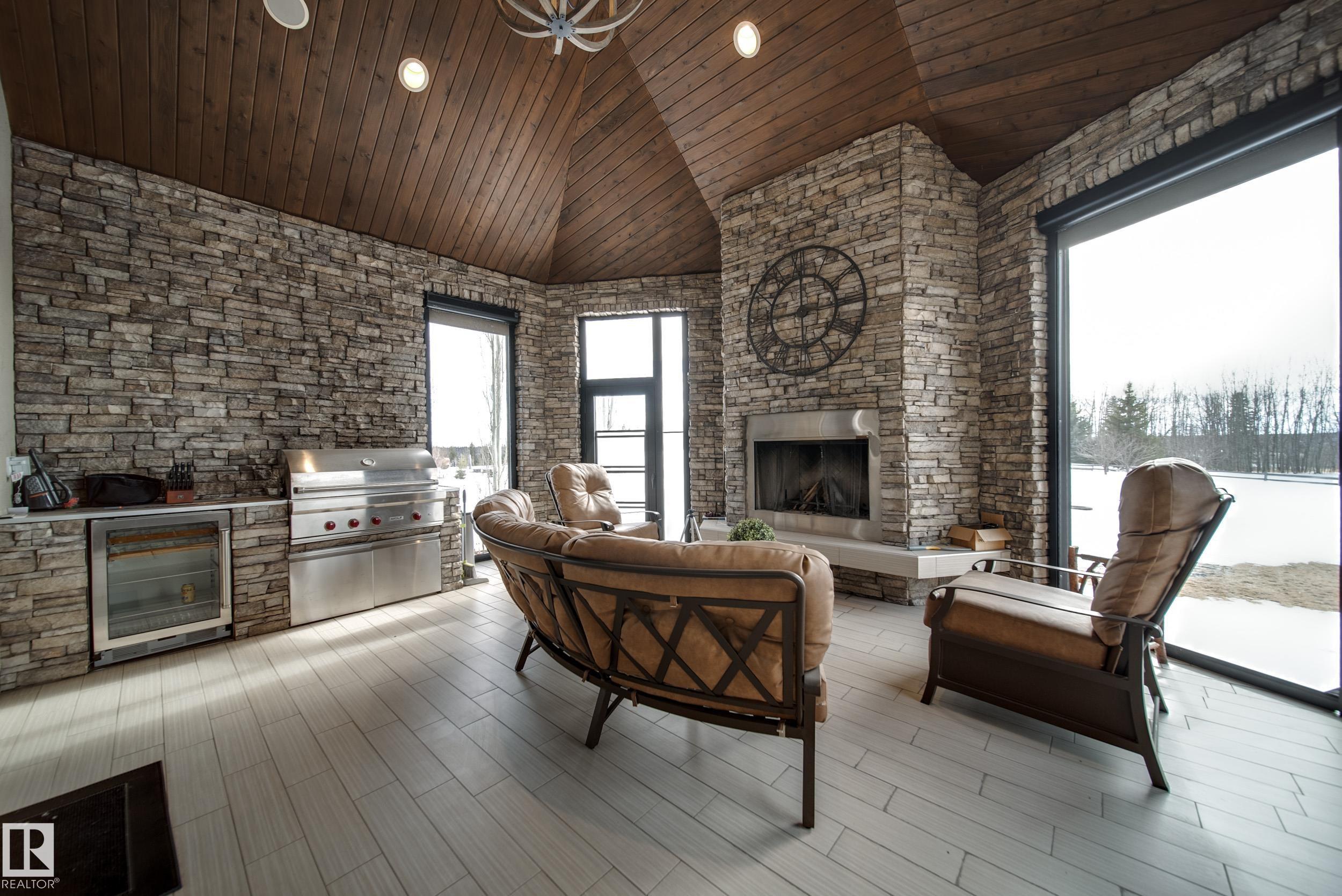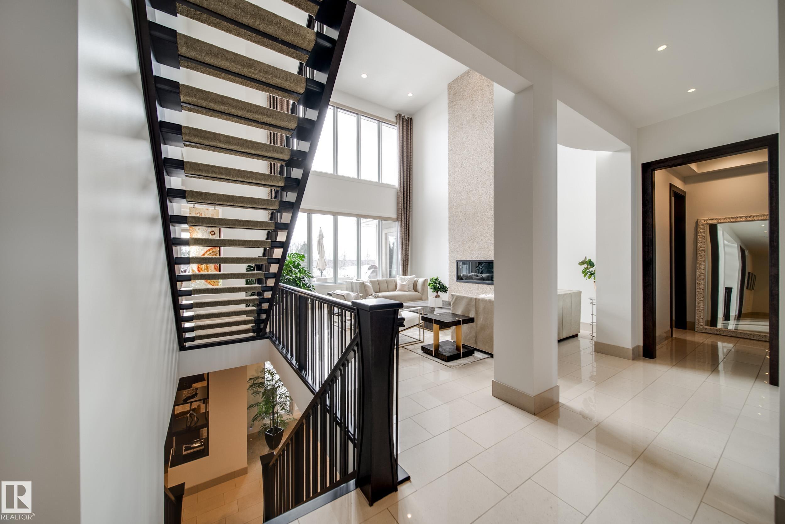 Luxury living in prestigious Blackhawk Estates, just 15 minutes southwest of Edmonton. Situated on a beautifully landscaped 1-acre lot, this exceptional two-storey home backs onto the North Saskatchewan River and fronts the 4th fairway of the renowned Blackhawk Golf Club--hop in your golf cart and head to the course. Offering over 9,000 sq ft of living space with 6,041 sq ft above grade, the home features a main-floor primary retreat with spa-inspired ensuite and dual walk-in closets, plus a private office. Expansive living areas include a chef's kitchen with dining area and cozy living room. A formal great room, wine cellar, and five fireplaces, including a wood-burning fireplace in the three-season room, add warmth and elegance. Upstairs offers 3 bedrooms plus a flex room, while the basement includes a theatre, gym, games area with mini hockey rink, rec room, and bedroom. A true car enthusiast's dream, the 2,400 sq ft garage features vaulted ceilings and a wash bay. This is the best of acreage living!