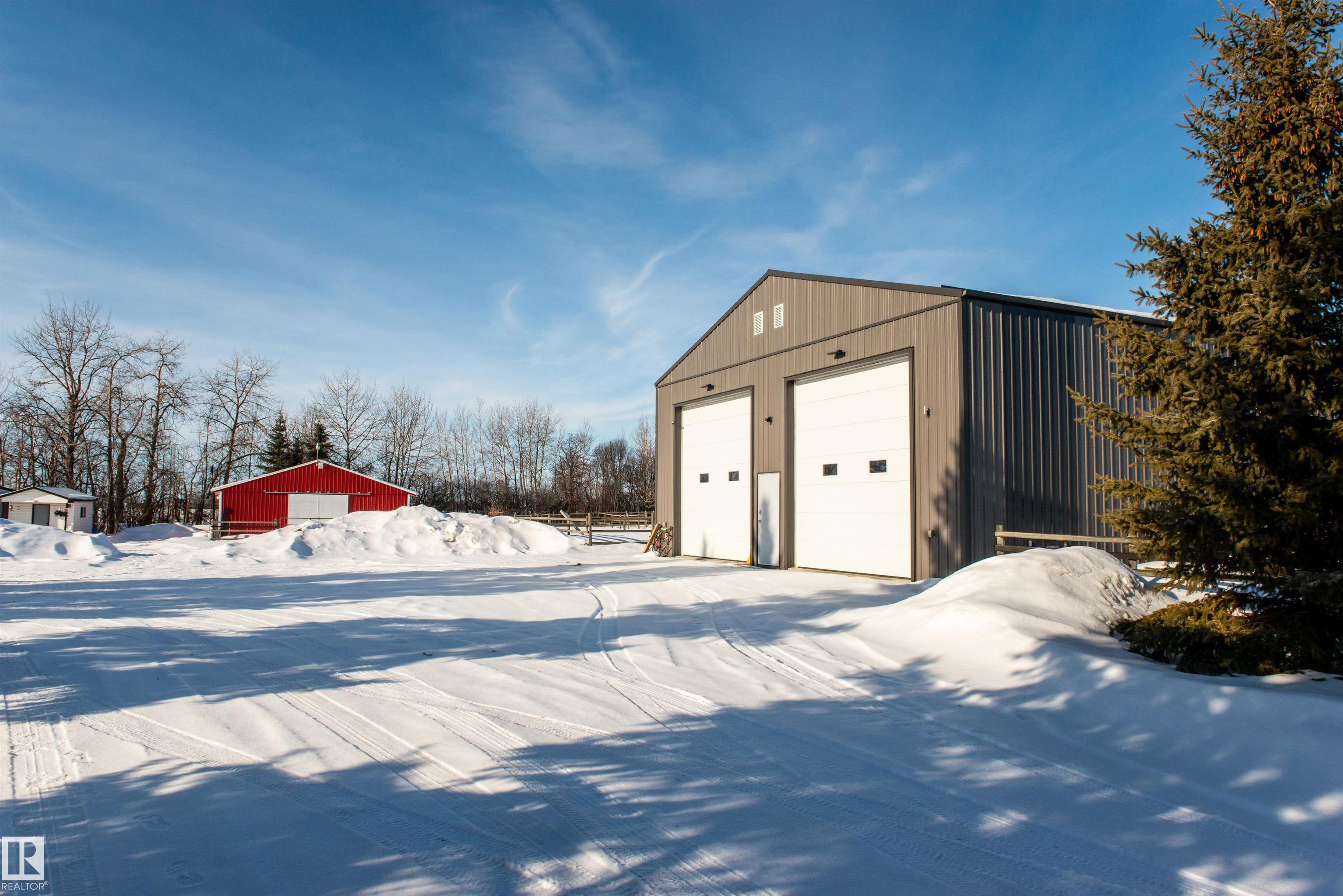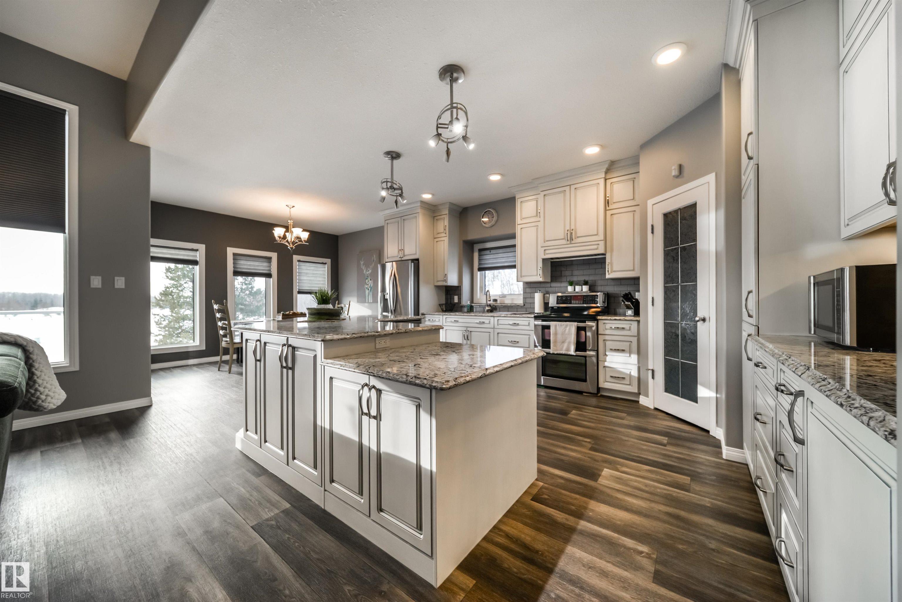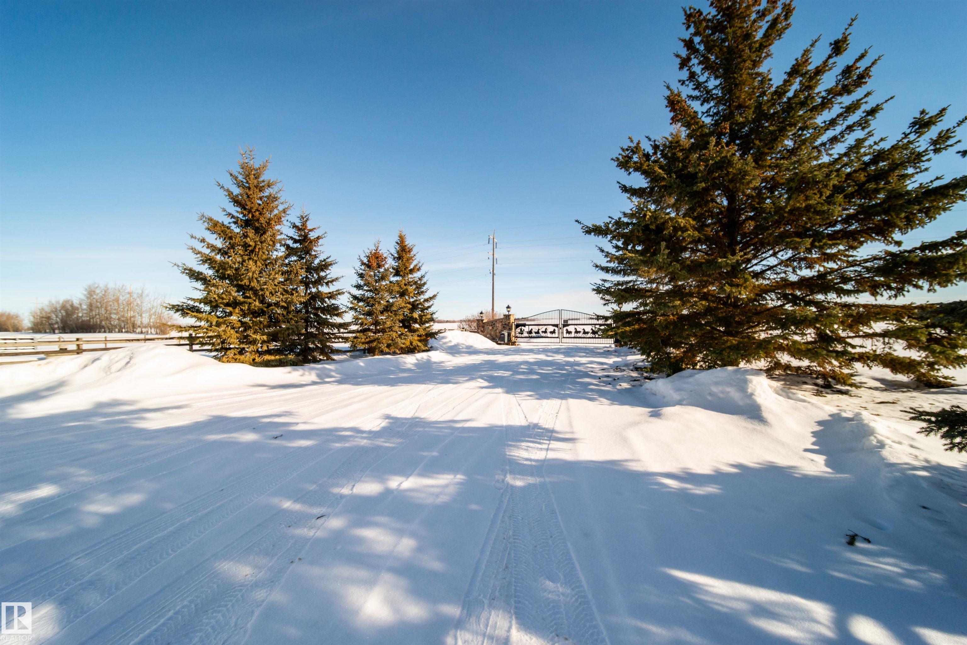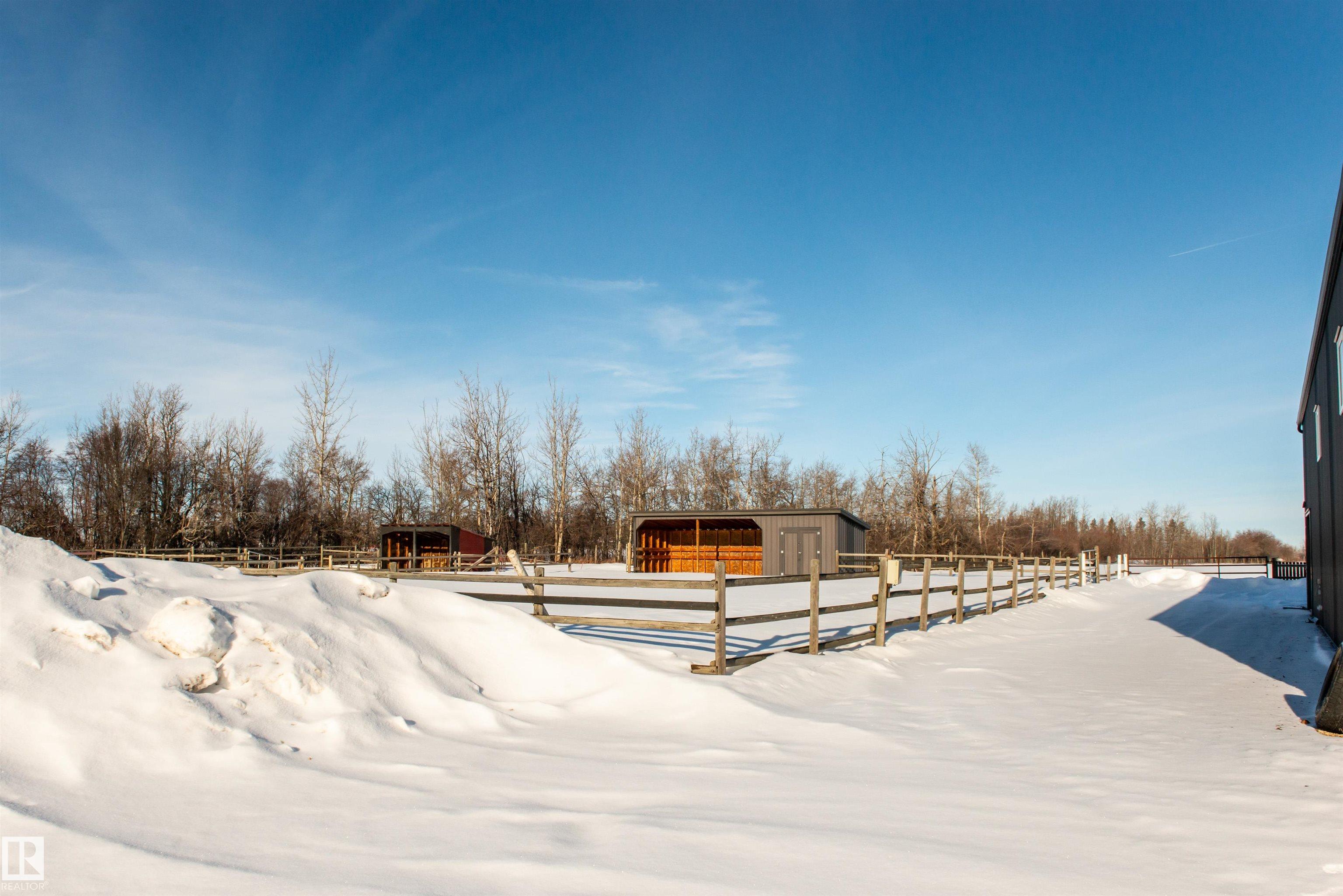 Bring the family and the horses! This beautifully updated 3 bedroom, 3 bath walkout bungalow sits on 12.92 acres just 20 minutes from St. Albert and blends modern comfort with acreage living. The bright open-concept main floor features beautiful kitchen with quartz island, stainless appliances, walk-in pantry, and south-facing views from the dining area with access to a covered deck. The living room offers 11' ceilings, large windows, and a cozy gas fireplace. A spacious den, laundry/boot room, full bath, and primary suite with ensuite complete the main level. The finished walkout basement includes two bedrooms, hobby room, full bath, and large rec room with pellet stove. Outside you'll find corrals, riding area, heated 5-stall barn, 2016 massive 78x42 in-floor heated shop with 14' x14' doors, shed, heated triple attached garage, plus a private 2017 Artic Ozone salt water swim spa with beach house for year-round relaxation. Acreage living done right. Railroad tracks are decommissioned.