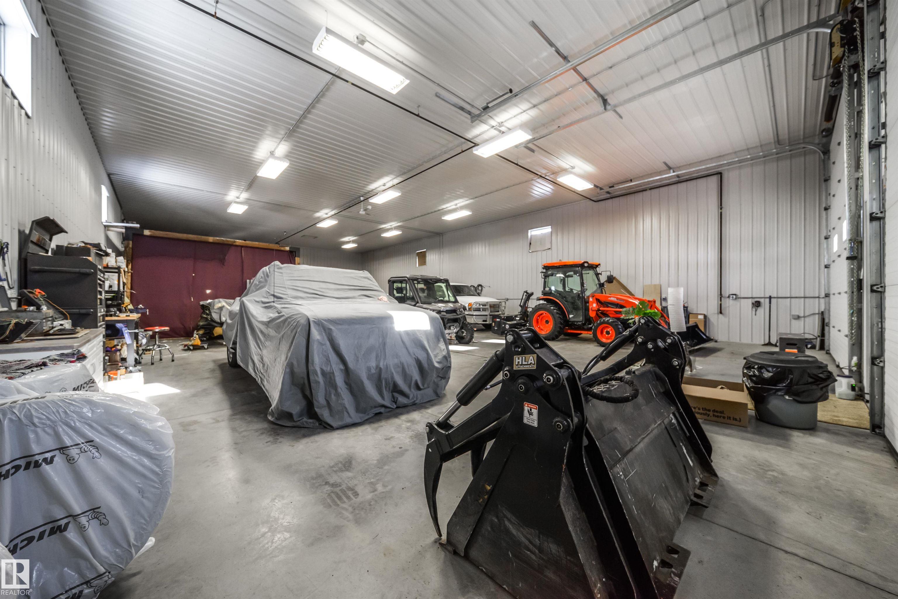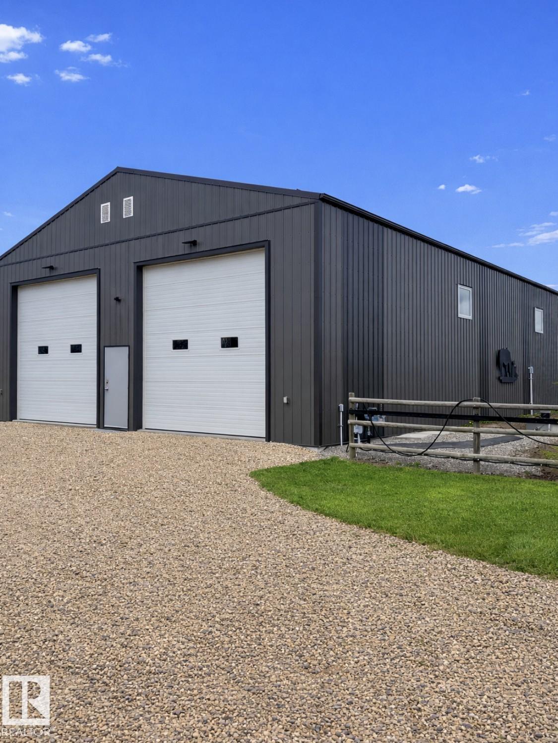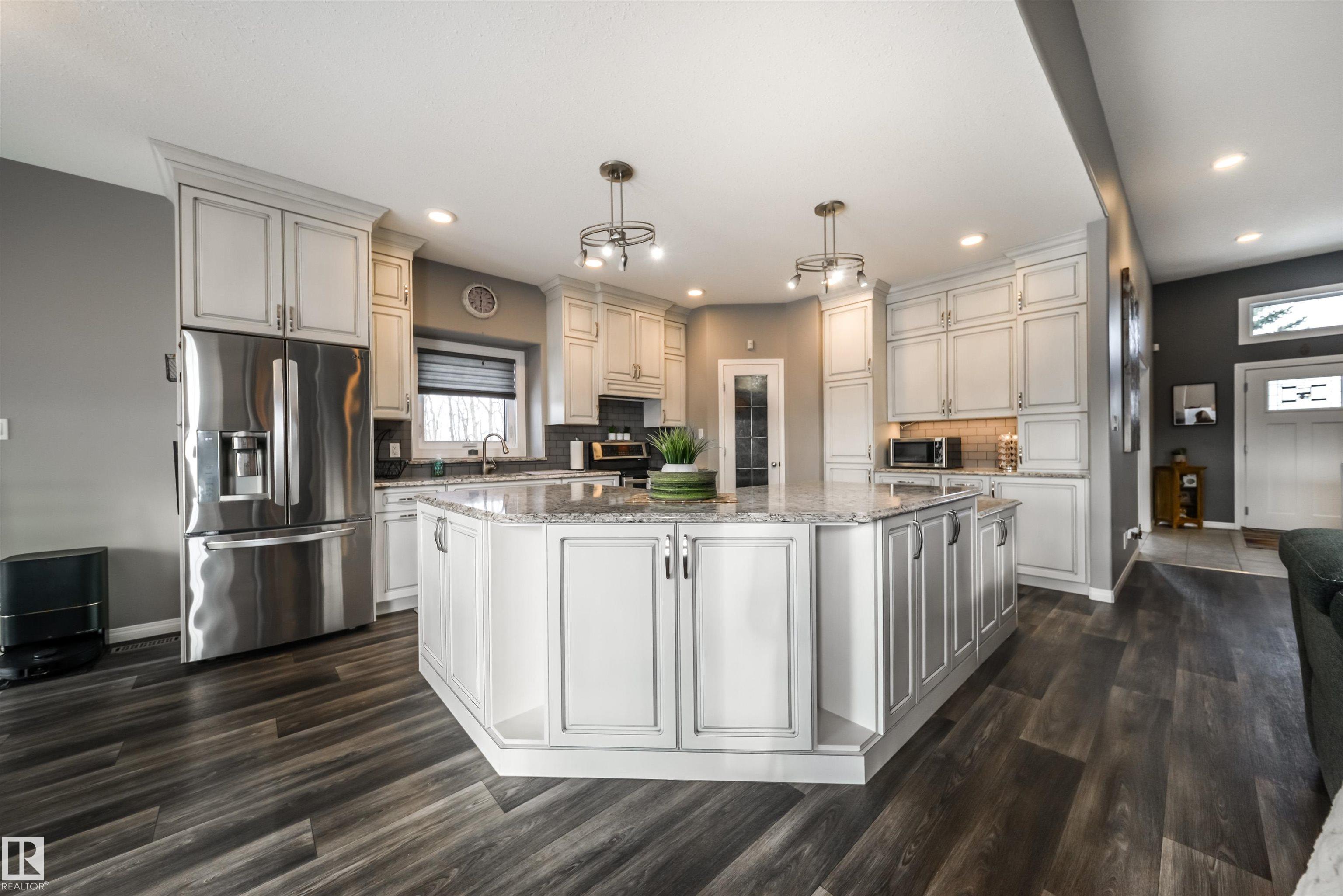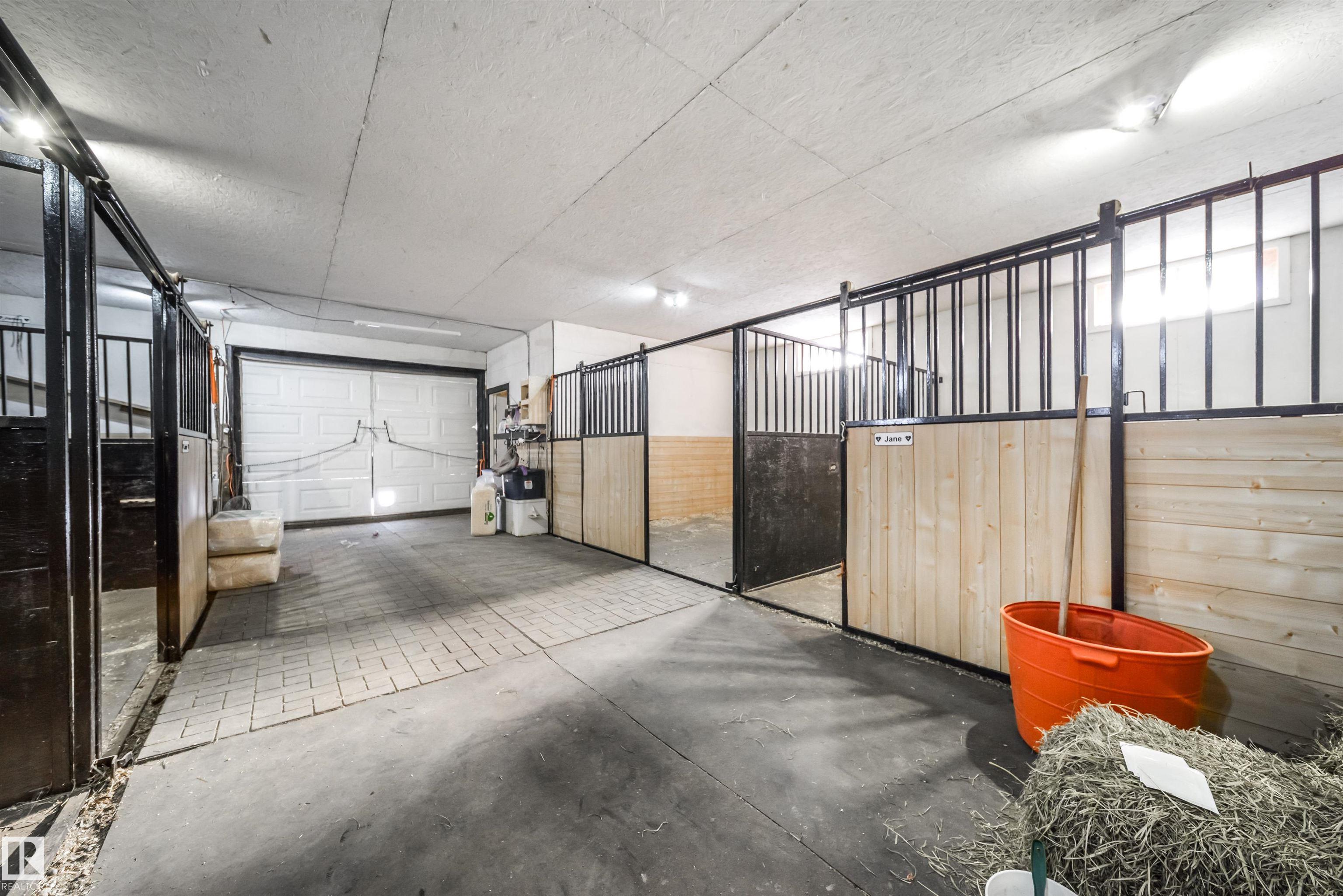 Bring the family and the horses! This beautifully updated 3 bedroom, 3 bath walkout bungalow sits on 12.92 acres just 20 minutes from St. Albert and blends modern comfort with acreage living. The bright open-concept main floor features beautiful kitchen with quartz island, stainless appliances, walk-in pantry, and south-facing views from the dining area with access to a covered deck. The living room offers 11' ceilings, large windows, and a cozy gas fireplace. A spacious den, laundry/boot room, full bath, and primary suite with ensuite complete the main level. The finished walkout basement includes two bedrooms, hobby room, full bath, and large rec room with pellet stove. Outside you'll find corrals, riding area, heated 5-stall barn, 2016 massive 78x42 in-floor heated shop with 14' x14' doors, shed, heated triple attached garage, plus a private 2017 Artic Ozone salt water swim spa with beach house for year-round relaxation. Acreage living done right. Railroad tracks are decommissioned.