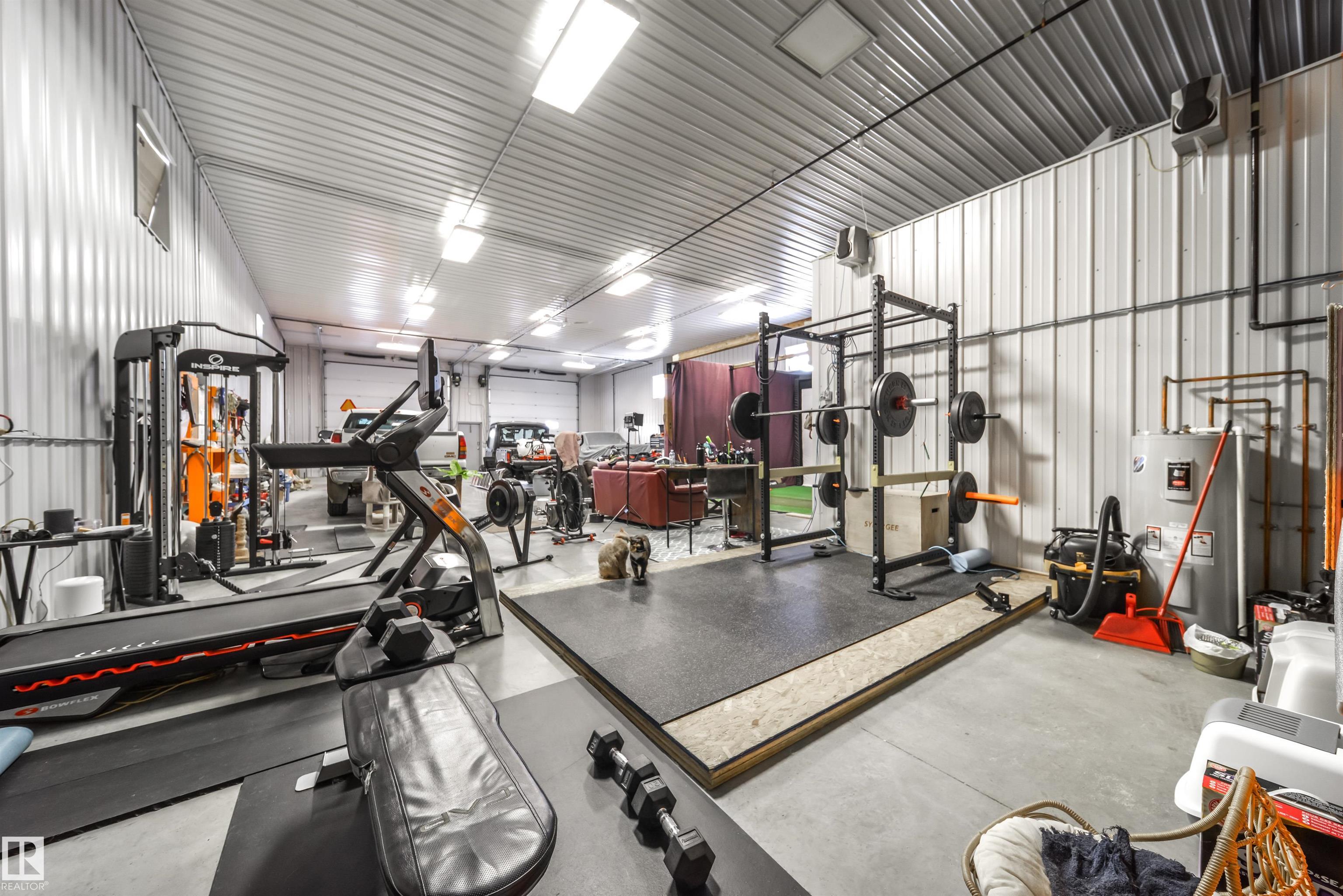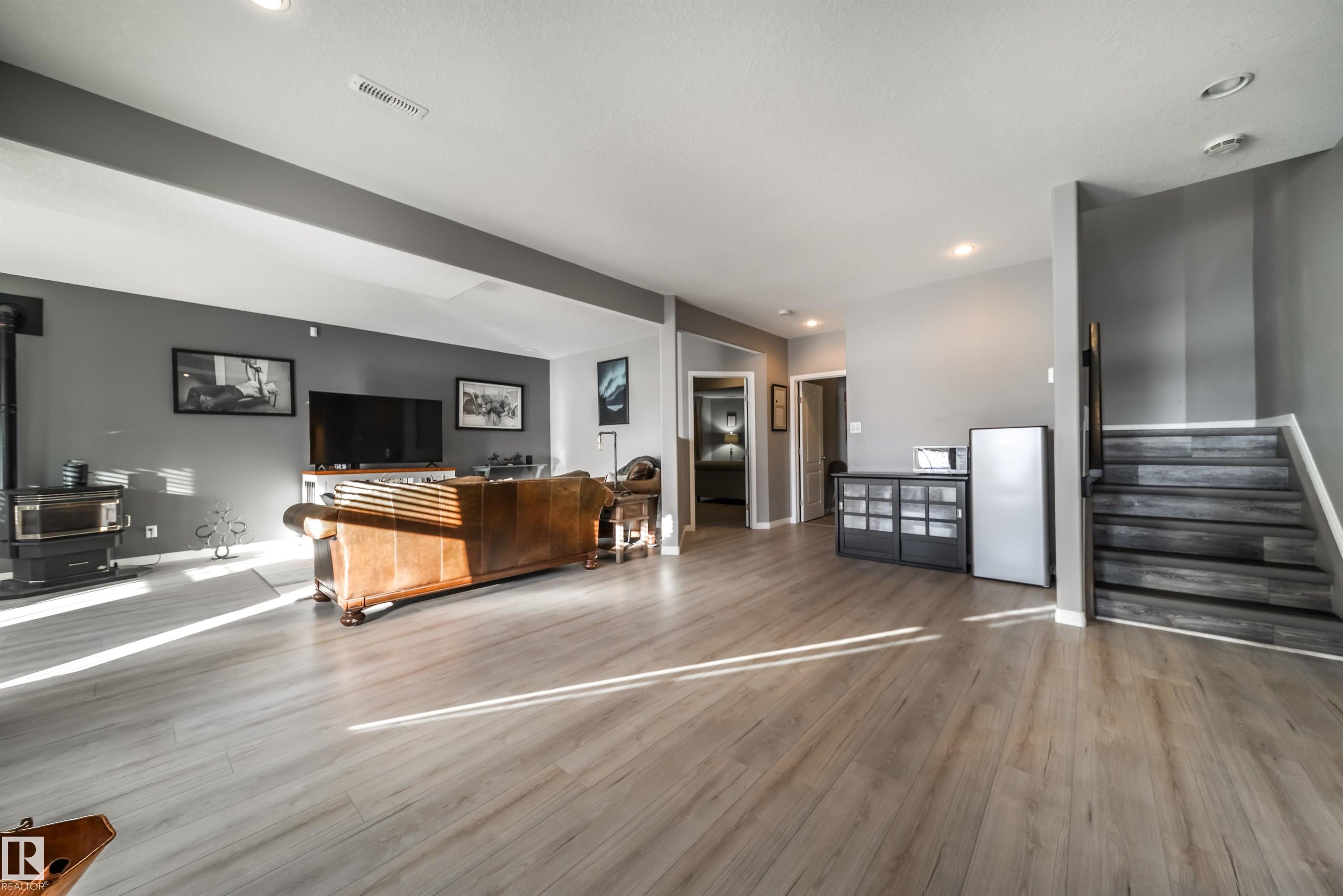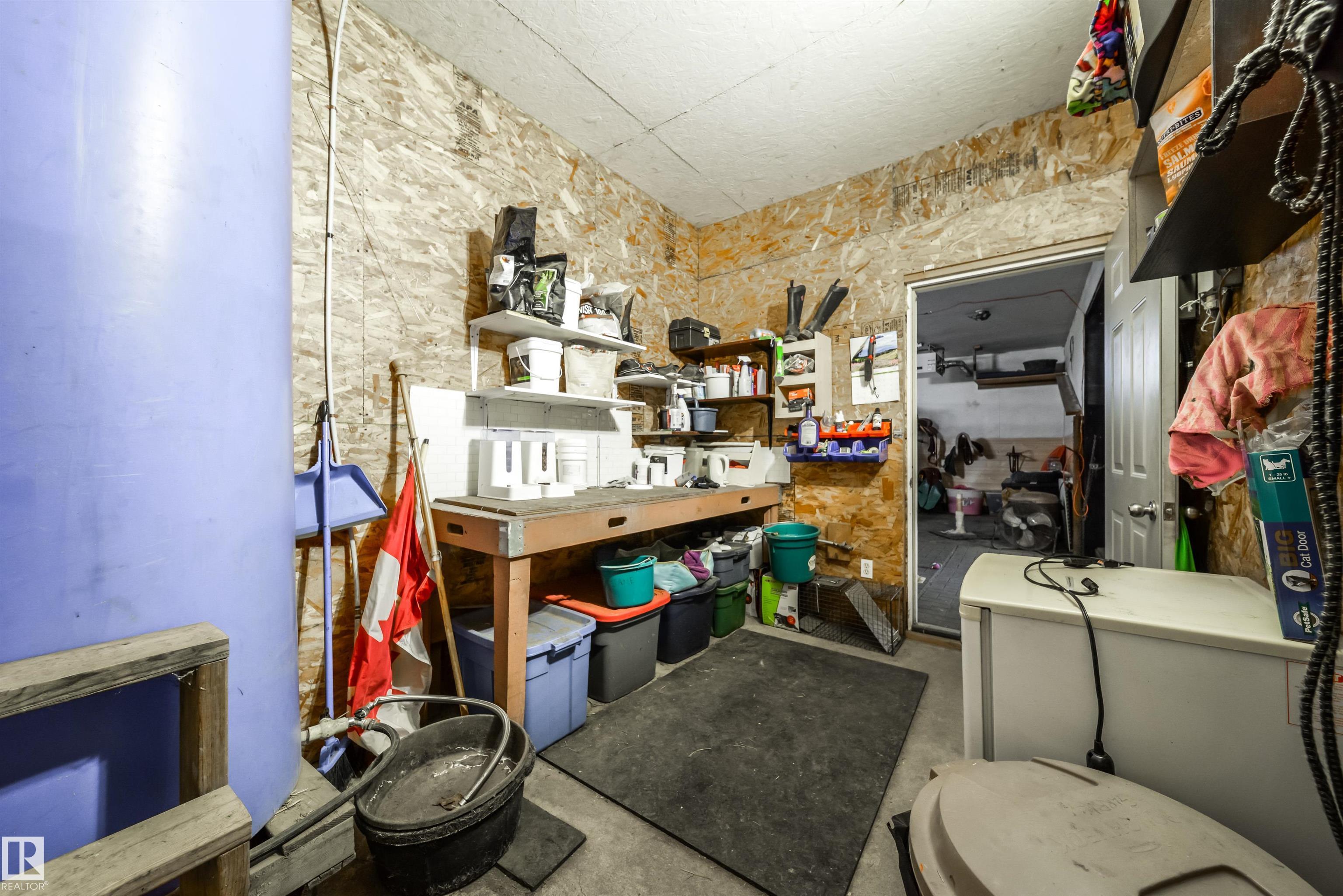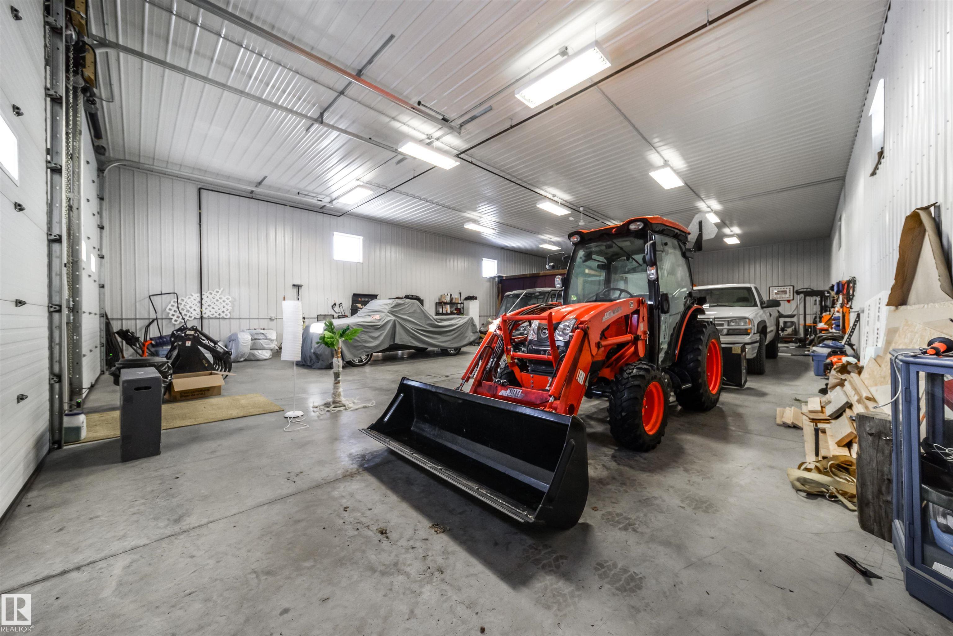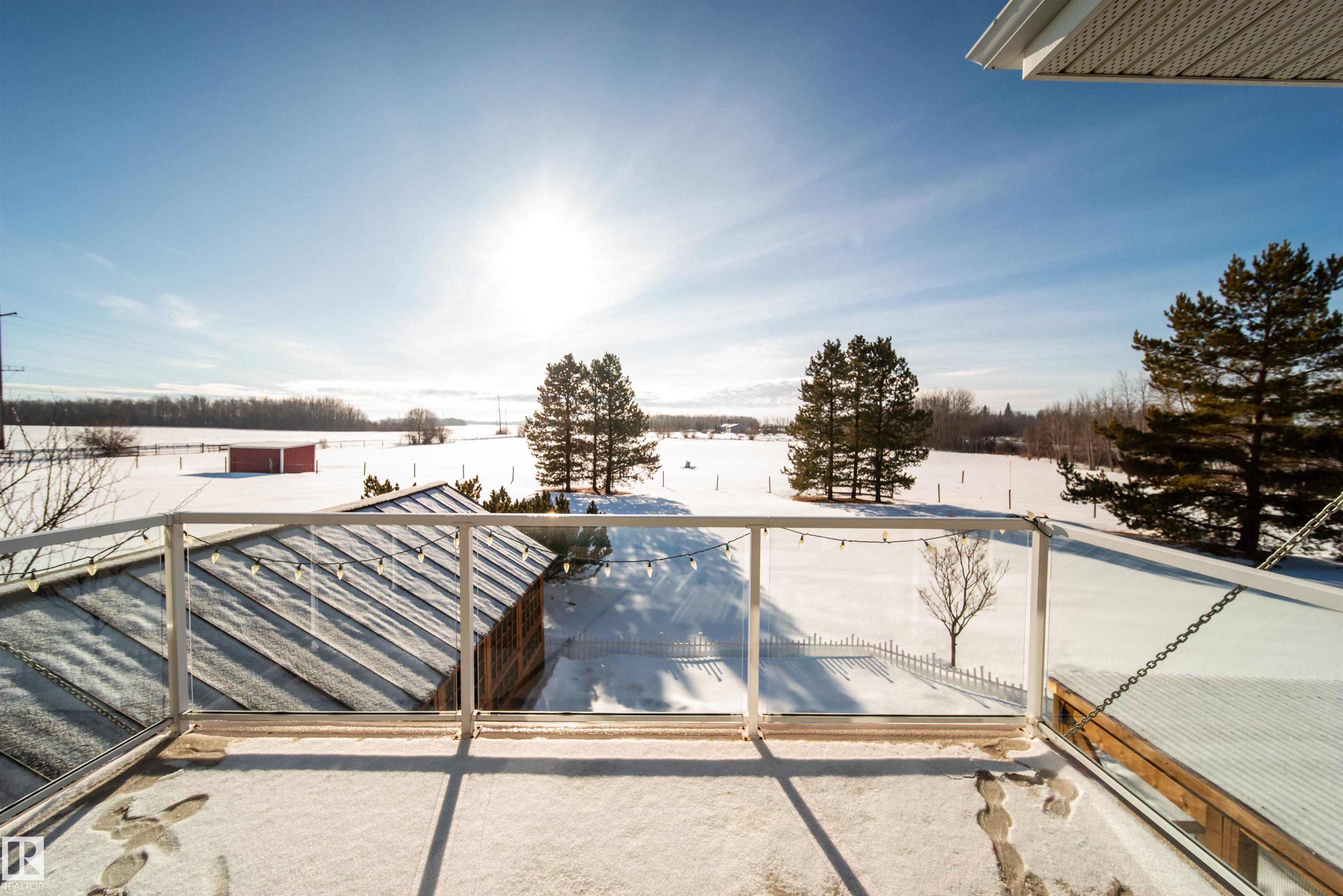 Bring the family and the horses! This beautifully updated 3 bedroom, 3 bath walkout bungalow sits on 12.92 acres just 20 minutes from St. Albert and blends modern comfort with acreage living. The bright open-concept main floor features beautiful kitchen with quartz island, stainless appliances, walk-in pantry, and south-facing views from the dining area with access to a covered deck. The living room offers 11' ceilings, large windows, and a cozy gas fireplace. A spacious den, laundry/boot room, full bath, and primary suite with ensuite complete the main level. The finished walkout basement includes two bedrooms, hobby room, full bath, and large rec room with pellet stove. Outside you'll find corrals, riding area, heated 5-stall barn, 2016 massive 78x42 in-floor heated shop with 14' x14' doors, shed, heated triple attached garage, plus a private 2017 Artic Ozone salt water swim spa with beach house for year-round relaxation. Acreage living done right. Railroad tracks are decommissioned.