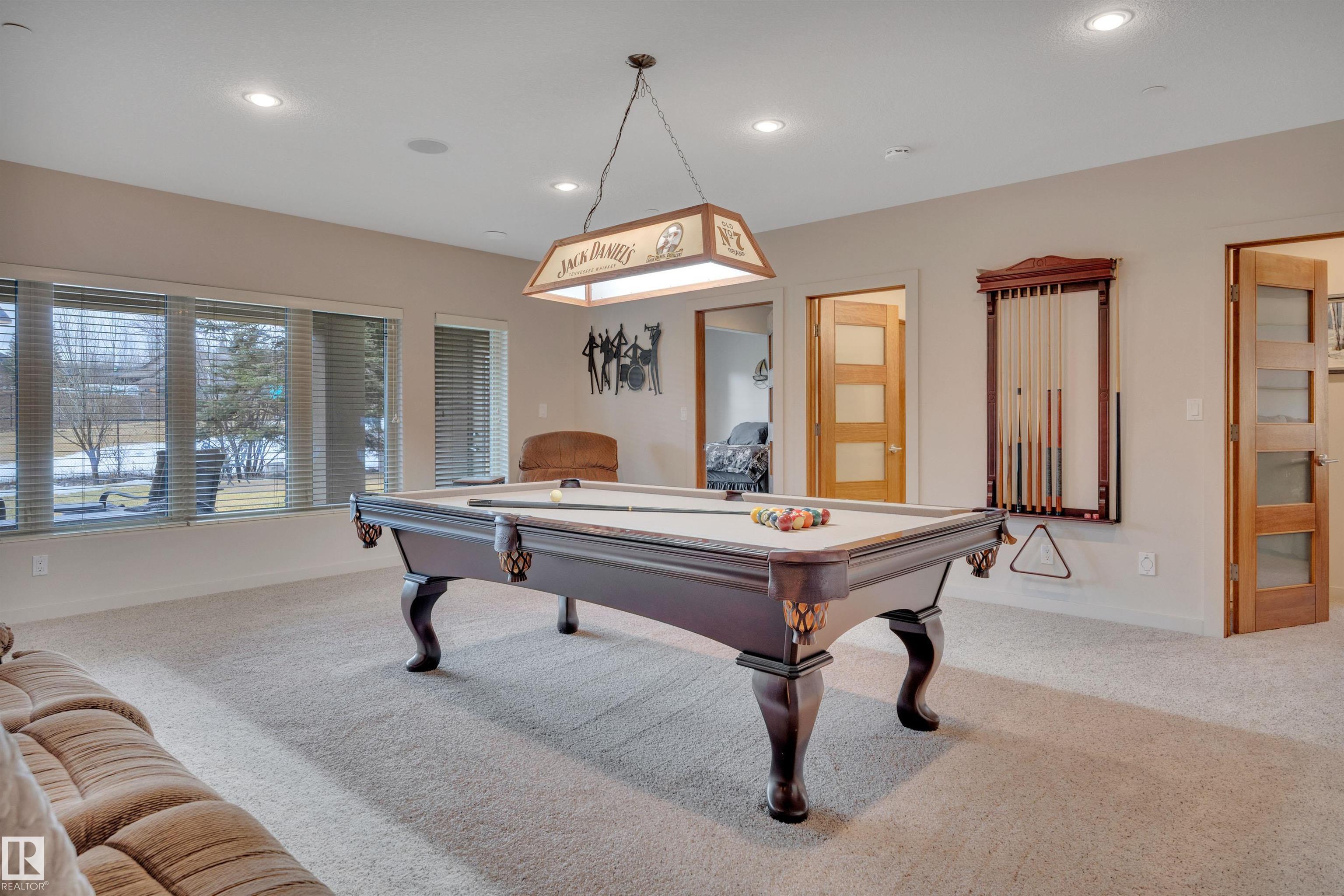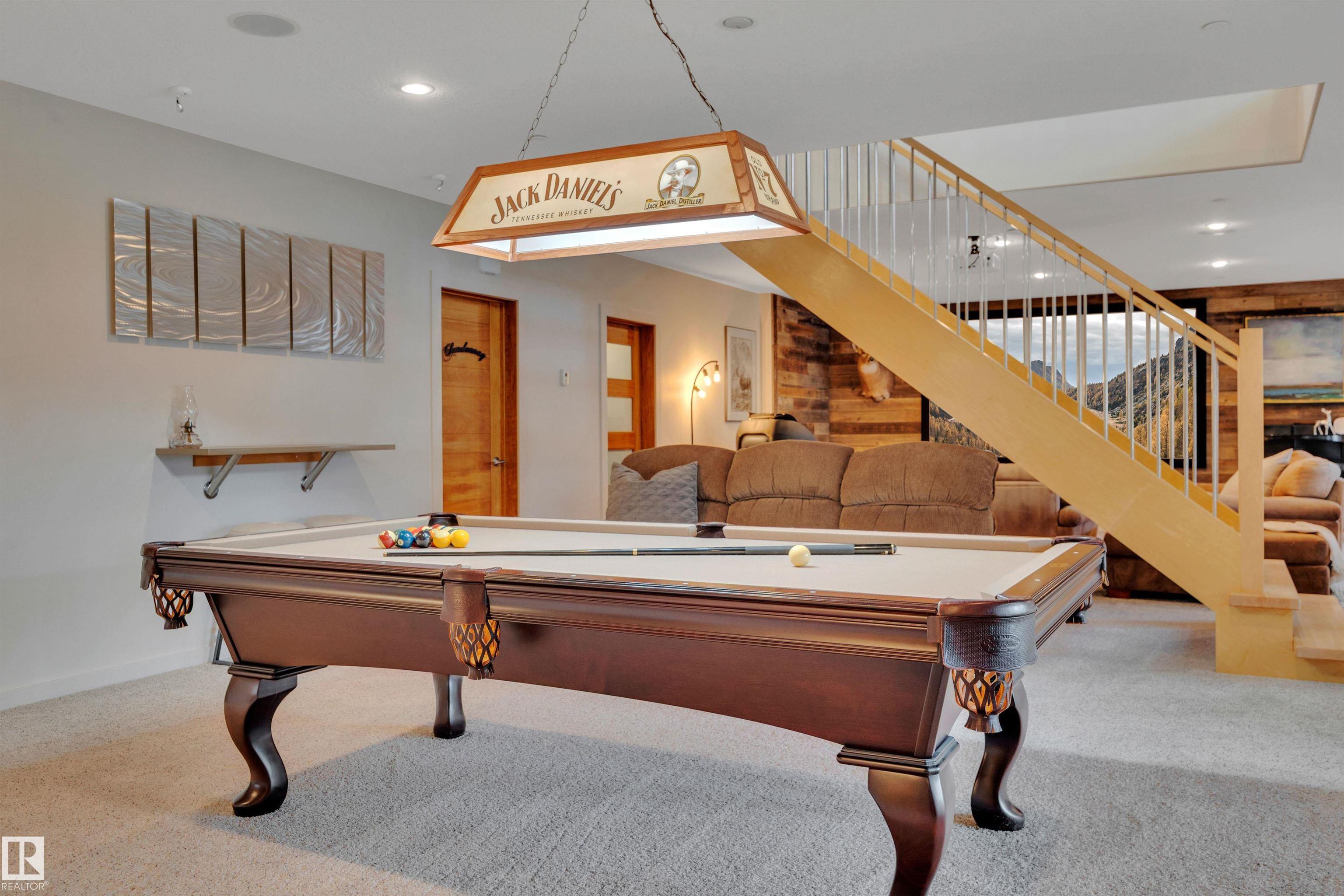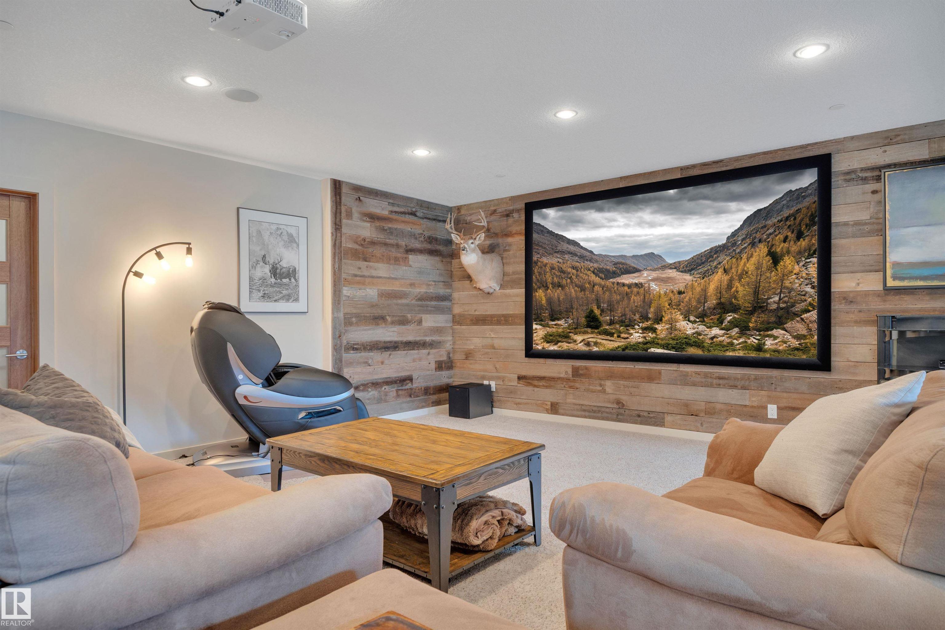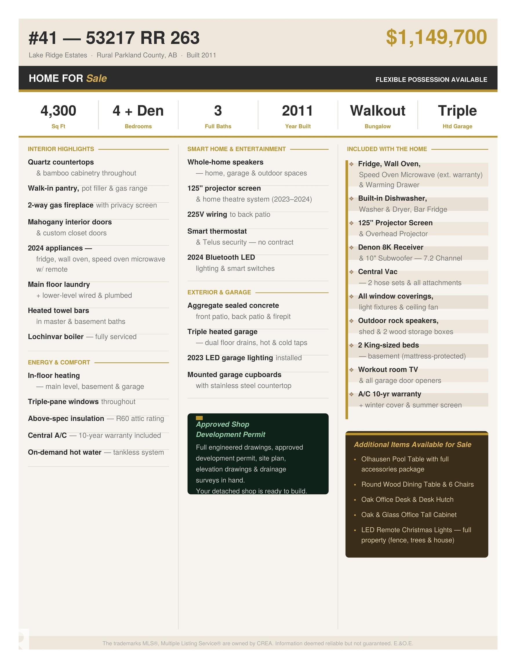 Executive walkout bungalow on « acre lot in prestigious Lake Ridge Estates -- where refined country living meets uncompromising luxury. Over 4,300 sq ft of masterfully finished space where soaring rock walls, towering windows & open-concept layout create a breathtaking first impression. The chef's kitchen stuns with quartz countertops, bamboo cabinetry, gas range & a huge eat-up island. Entertain in your formal dining area or on the huge deck with whole-home sound & smart home tech throughout. Watch the game on the 125" projector screen from the bar or over a game of pool! Then retreat to your spa-inspired master suite with double-sided fireplace designed for pure indulgence. In-floor heat on both levels, triple-pane windows & R60 insulation ensure year-round comfort. The triple heated garage features a drive-through door, dual floor drains & hot/cold taps. Approved shop development permit & full drawings in hand -- truly rare. Exceptional inclusions. Flexible possession. Country prestige. City convenience.