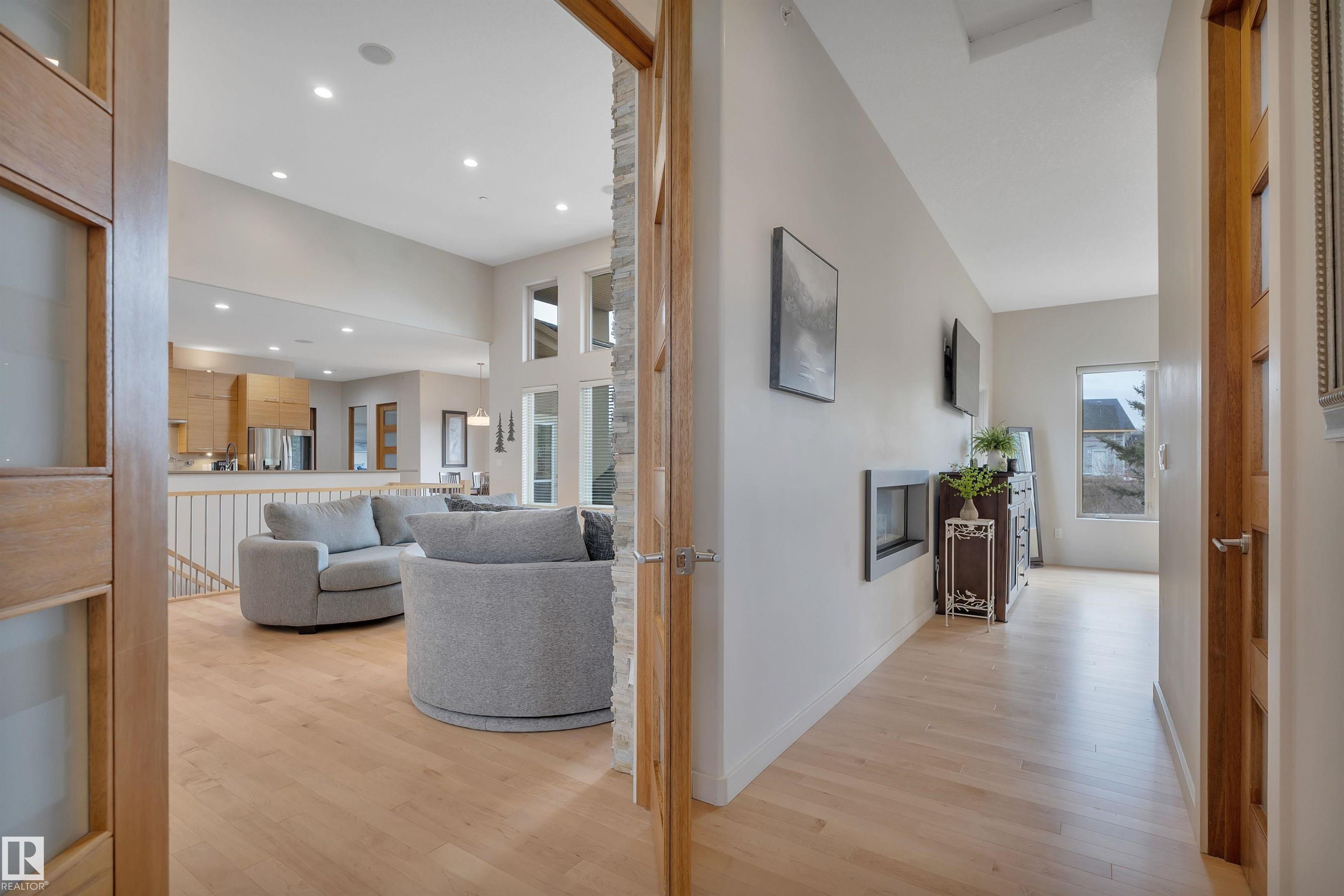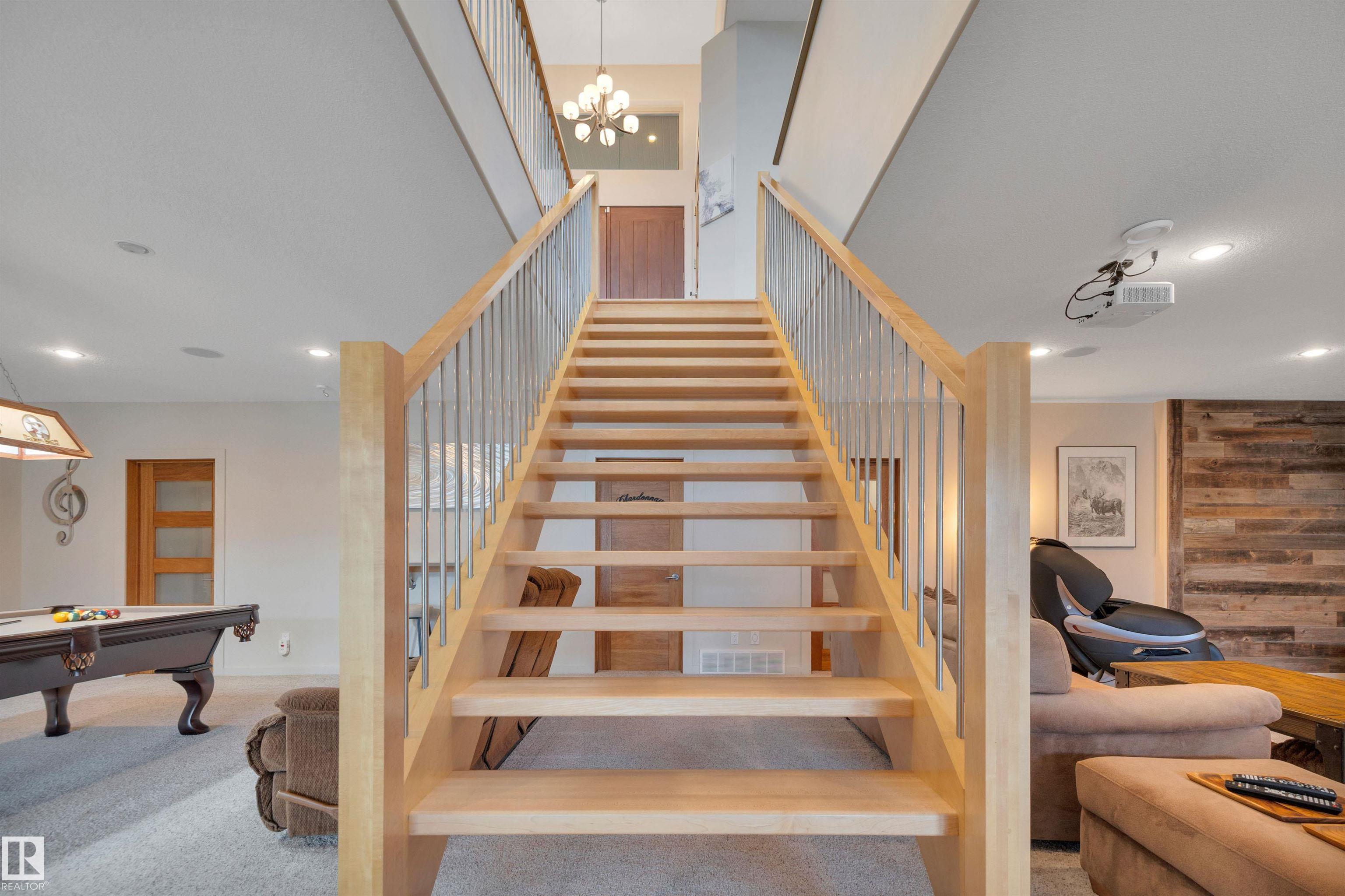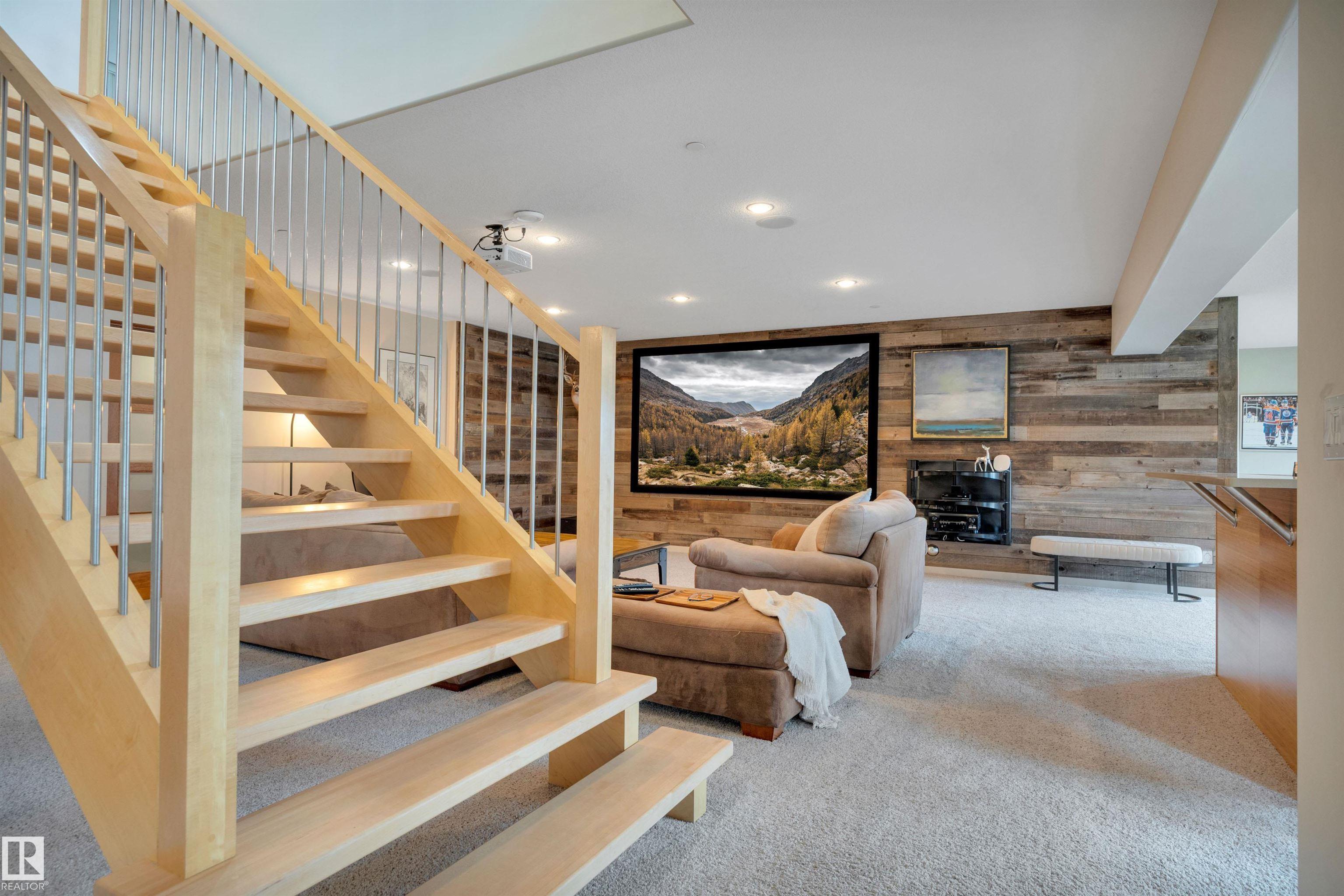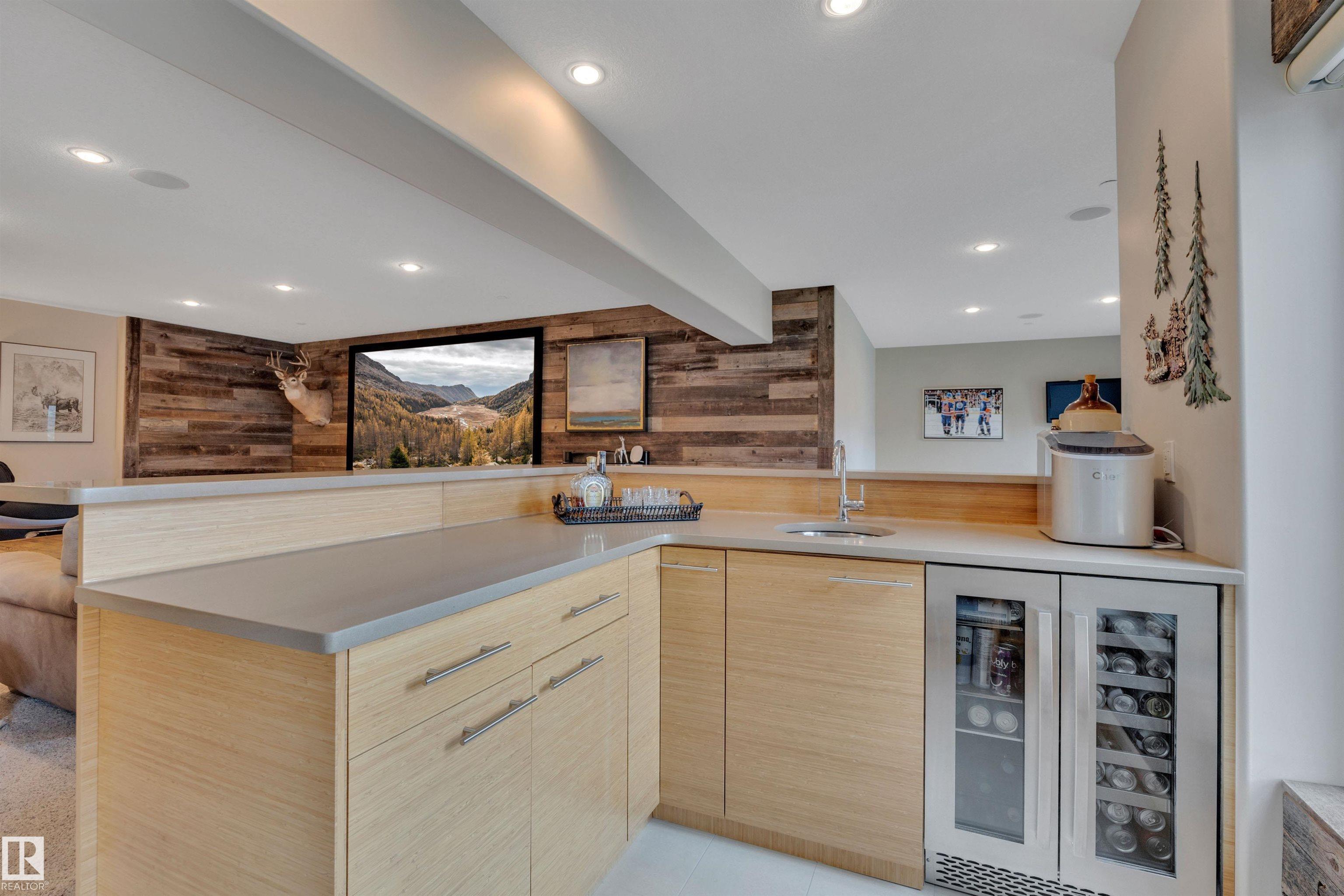 Executive walkout bungalow on « acre lot in prestigious Lake Ridge Estates -- where refined country living meets uncompromising luxury. Over 4,300 sq ft of masterfully finished space where soaring rock walls, towering windows & open-concept layout create a breathtaking first impression. The chef's kitchen stuns with quartz countertops, bamboo cabinetry, gas range & a huge eat-up island. Entertain in your formal dining area or on the huge deck with whole-home sound & smart home tech throughout. Watch the game on the 125" projector screen from the bar or over a game of pool! Then retreat to your spa-inspired master suite with double-sided fireplace designed for pure indulgence. In-floor heat on both levels, triple-pane windows & R60 insulation ensure year-round comfort. The triple heated garage features a drive-through door, dual floor drains & hot/cold taps. Approved shop development permit & full drawings in hand -- truly rare. Exceptional inclusions. Flexible possession. Country prestige. City convenience.