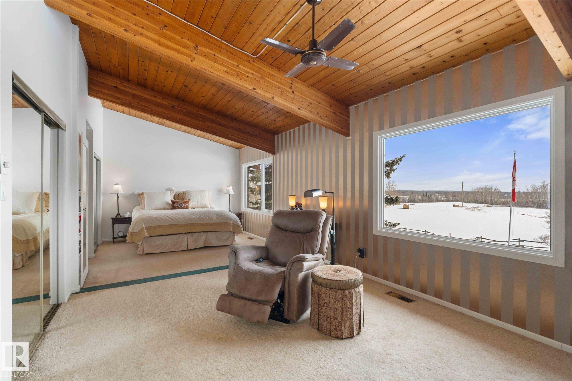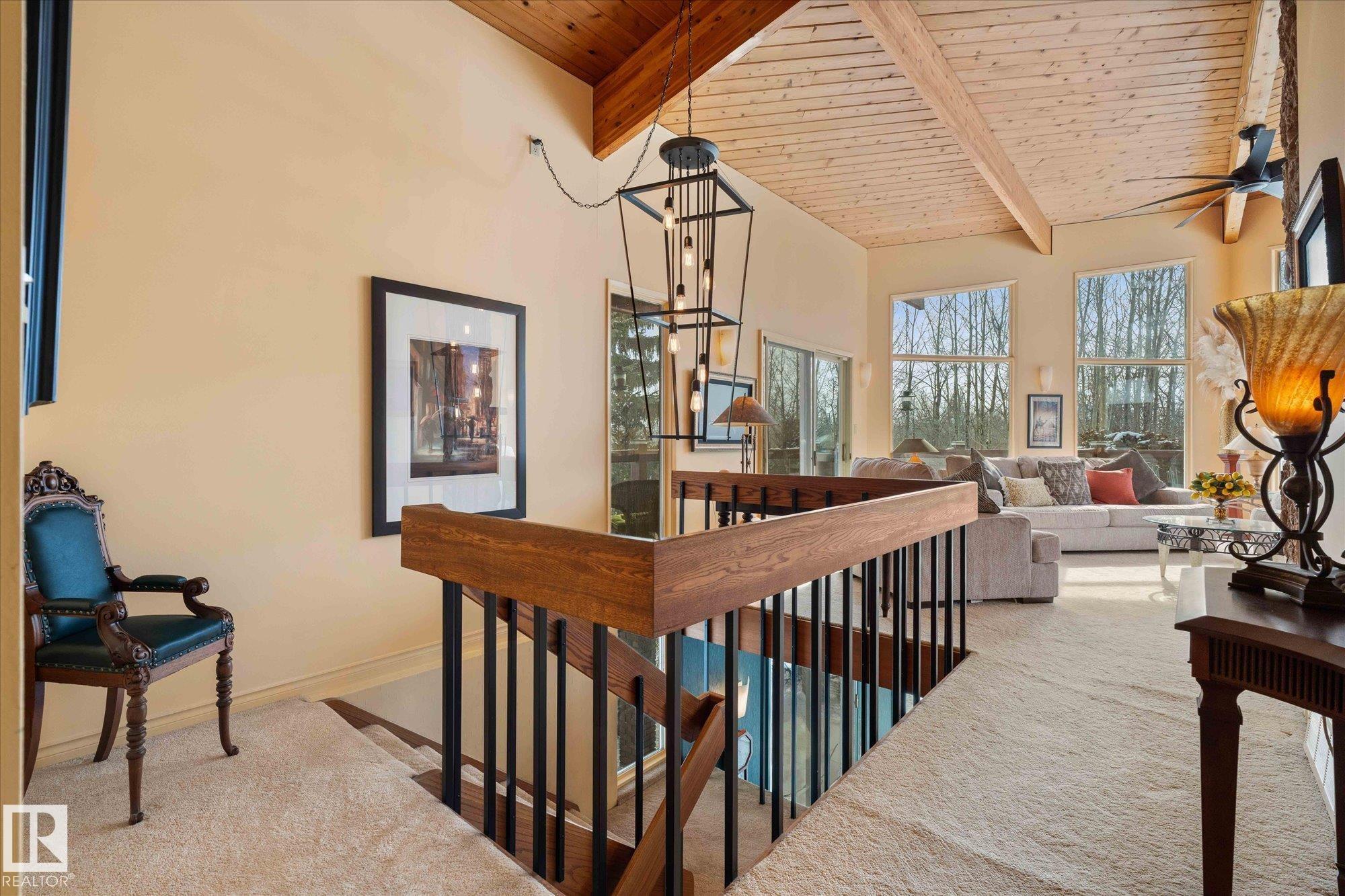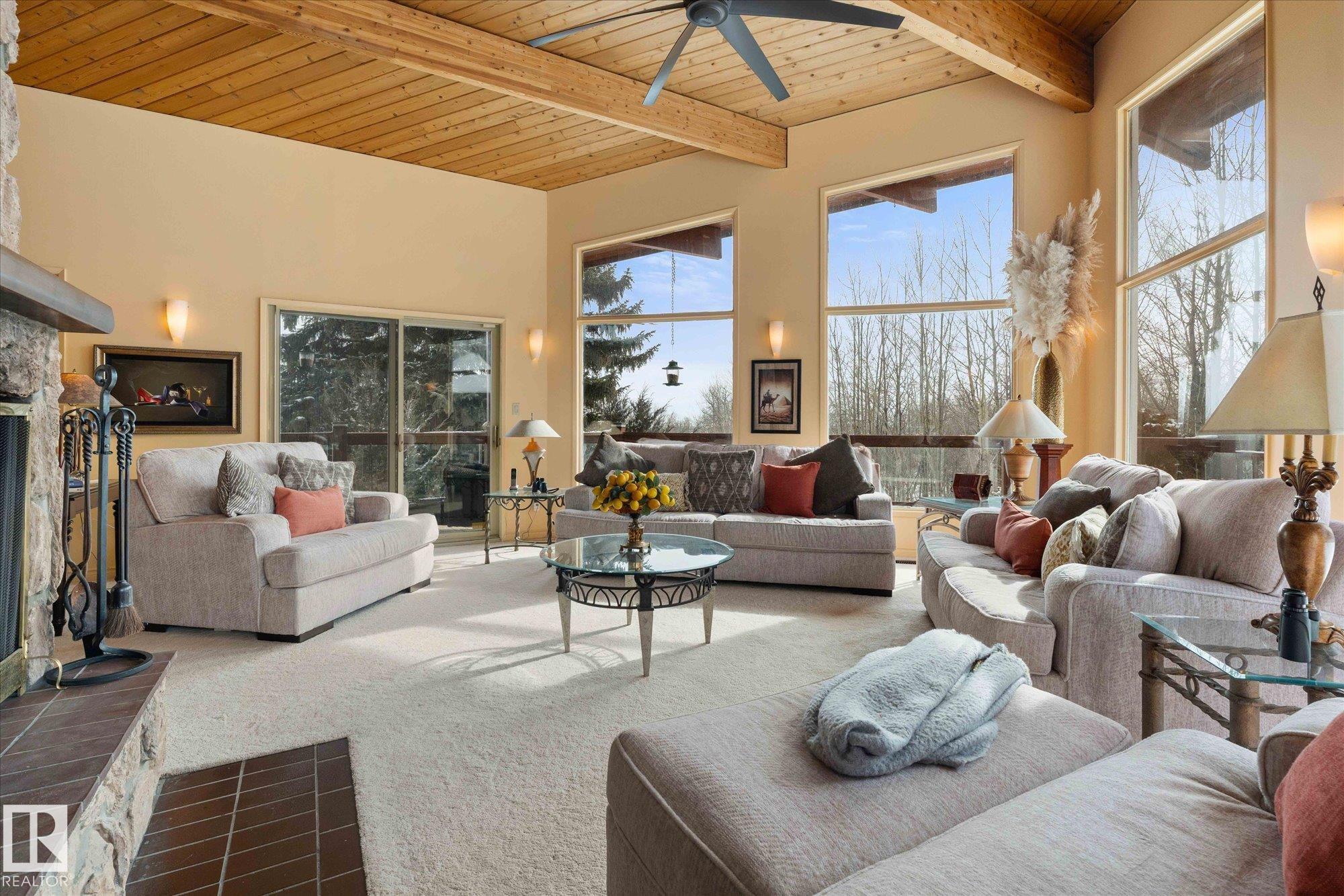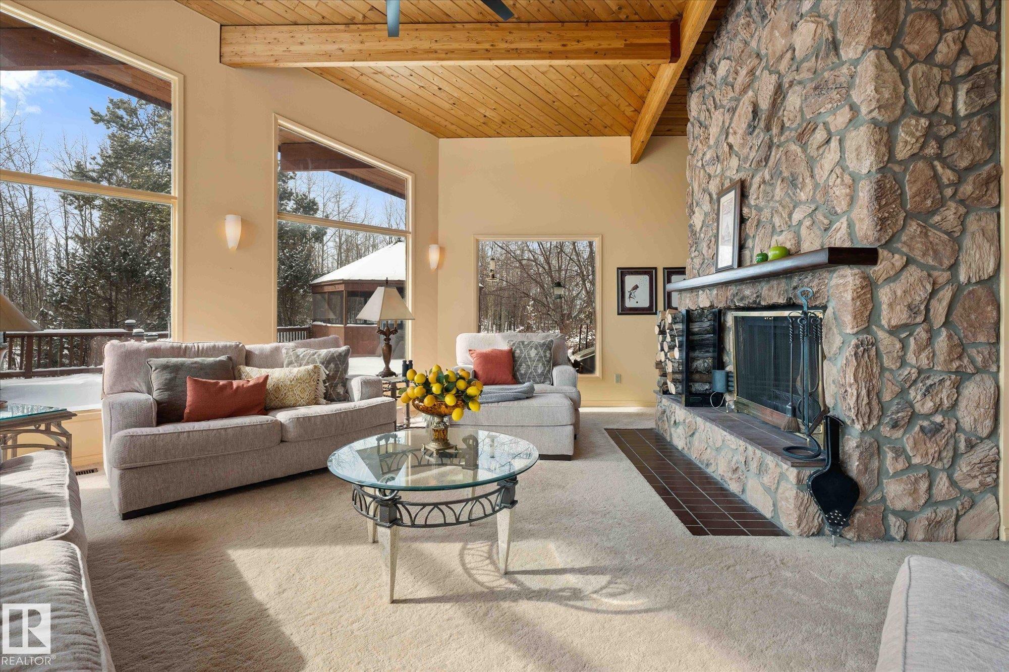 JUST 6 KMS FROM STONY PLAIN SITS THIS INCREDIBLE CUSTOM BUILT HOME ON 17.8 ACRES! What a special property this one is. It offers peace, tranquility, views, wildlife, serenity and location! Many updates done over the years including house shingles (2016), garage roof (2022), septic tanks (2014), house exterior re-stained, barn painted, downstairs bathroom redone, kitchen spruce up including gorgeous granite countertops! The main floor offers a gorgeous and cozy living room surrounded by large windows with a wonderful wood burning fireplace. The Chefs kitchen boasts many extras such as a food warmer, sub zero fridge, wine cooler and double ovens plus a top of the line stove! The bright primary bedroom offers great views and door to deck! The lower level in this walk up has 2 bedrooms, a living room with fireplace, 3 pc bath, sitting area, laundry and cold rooms. The land is rolling and partly treed! The barn is perfect and offers storage on top! Hot tub, gazebo, decks - the list is too long! Must be seen!