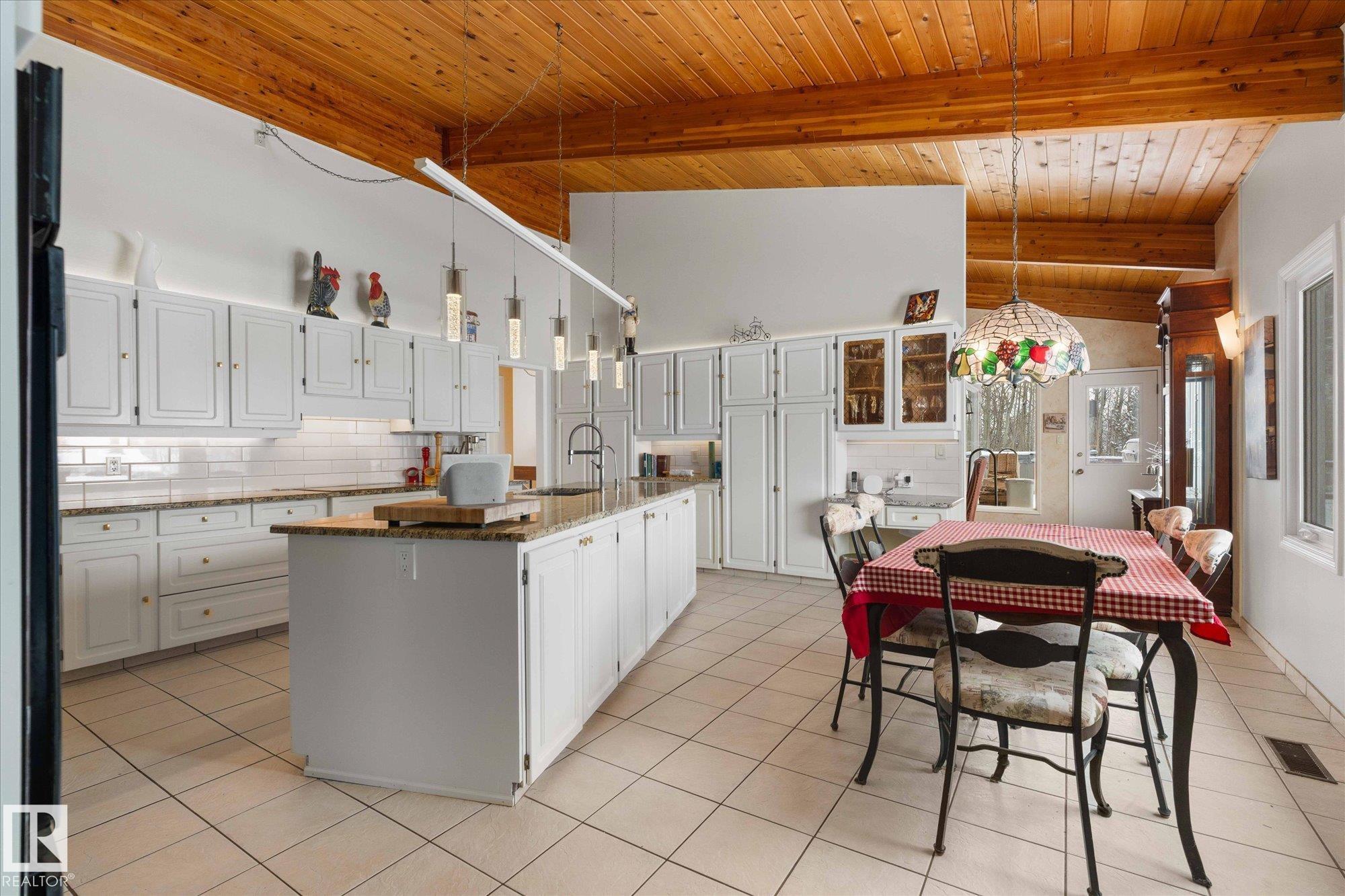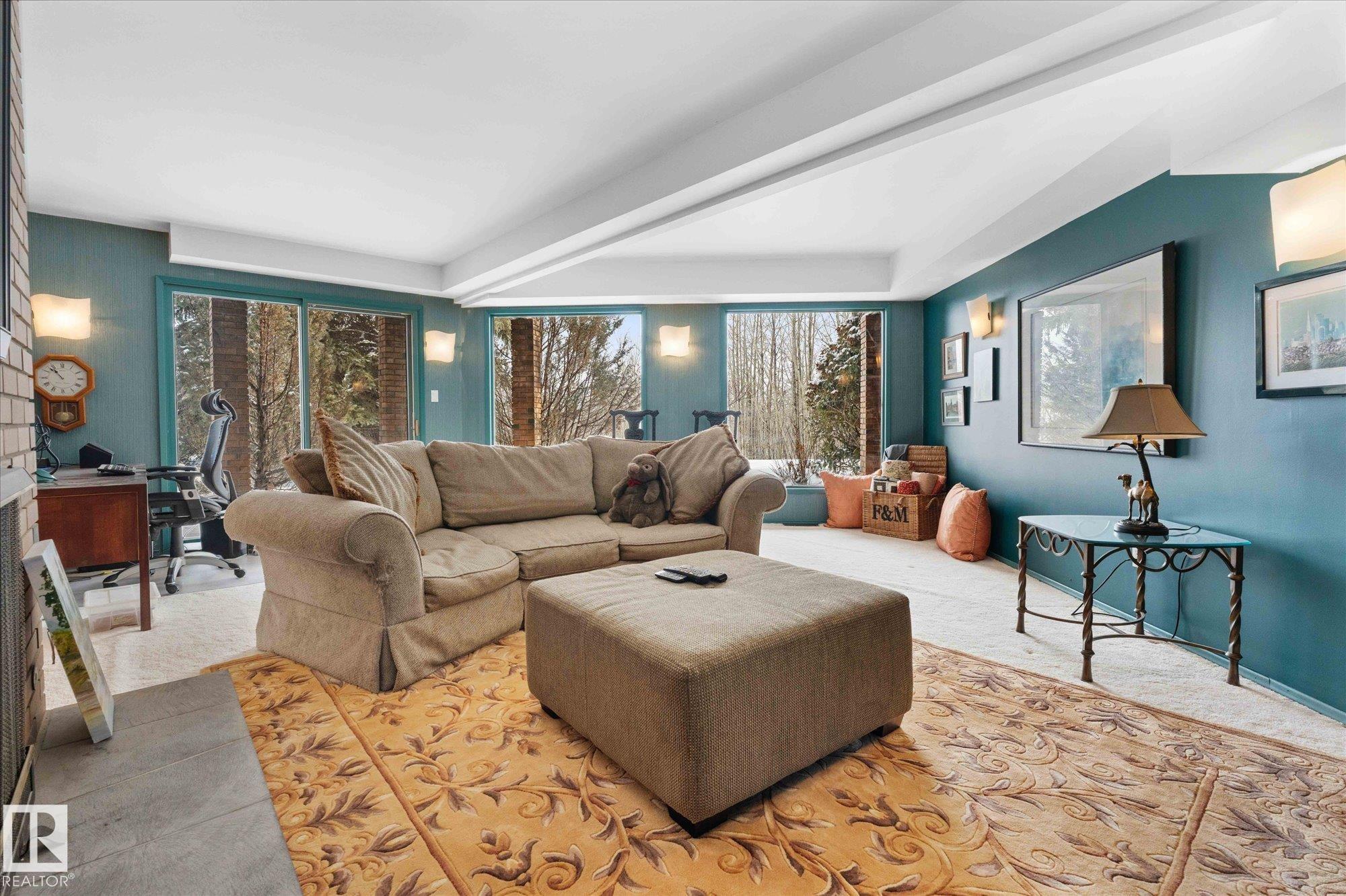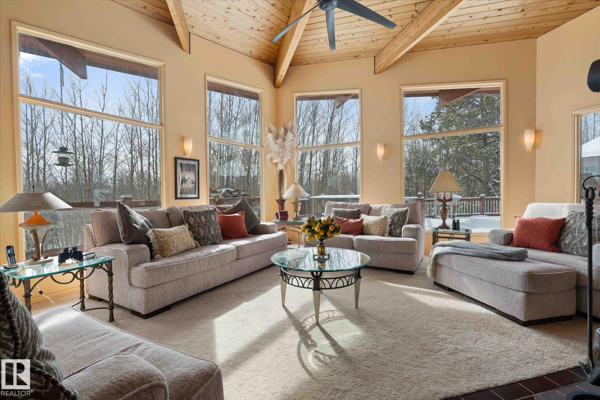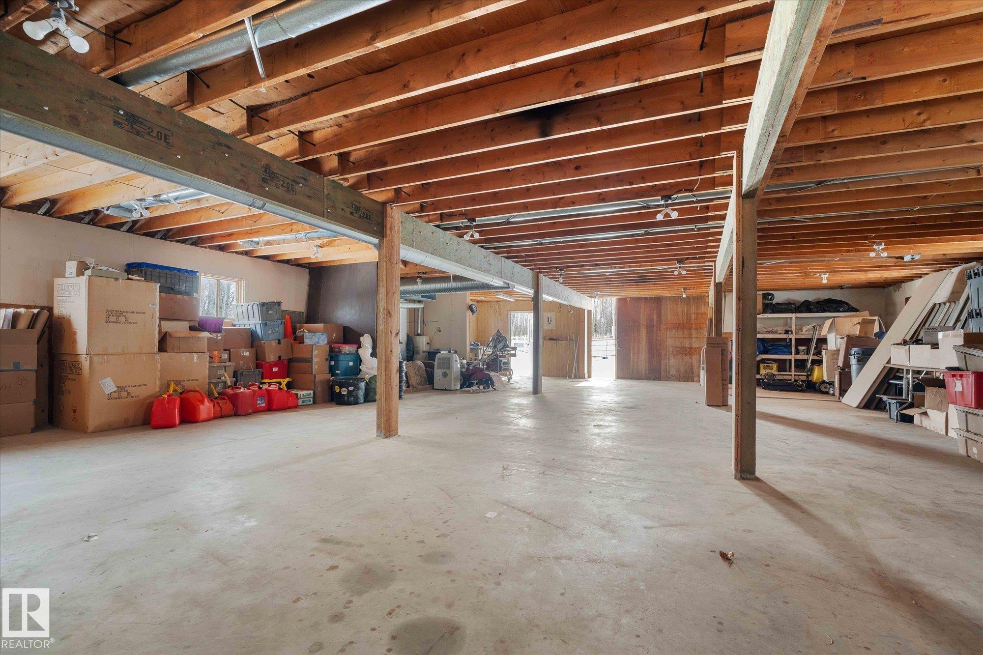 JUST 6 KMS FROM STONY PLAIN SITS THIS INCREDIBLE CUSTOM BUILT HOME ON 17.8 ACRES! What a special property this one is. It offers peace, tranquility, views, wildlife, serenity and location! Many updates done over the years including house shingles (2016), garage roof (2022), septic tanks (2014), house exterior re-stained, barn painted, downstairs bathroom redone, kitchen spruce up including gorgeous granite countertops! The main floor offers a gorgeous and cozy living room surrounded by large windows with a wonderful wood burning fireplace. The Chefs kitchen boasts many extras such as a food warmer, sub zero fridge, wine cooler and double ovens plus a top of the line stove! The bright primary bedroom offers great views and door to deck! The lower level in this walk up has 2 bedrooms, a living room with fireplace, 3 pc bath, sitting area, laundry and cold rooms. The land is rolling and partly treed! The barn is perfect and offers storage on top! Hot tub, gazebo, decks - the list is too long! Must be seen!