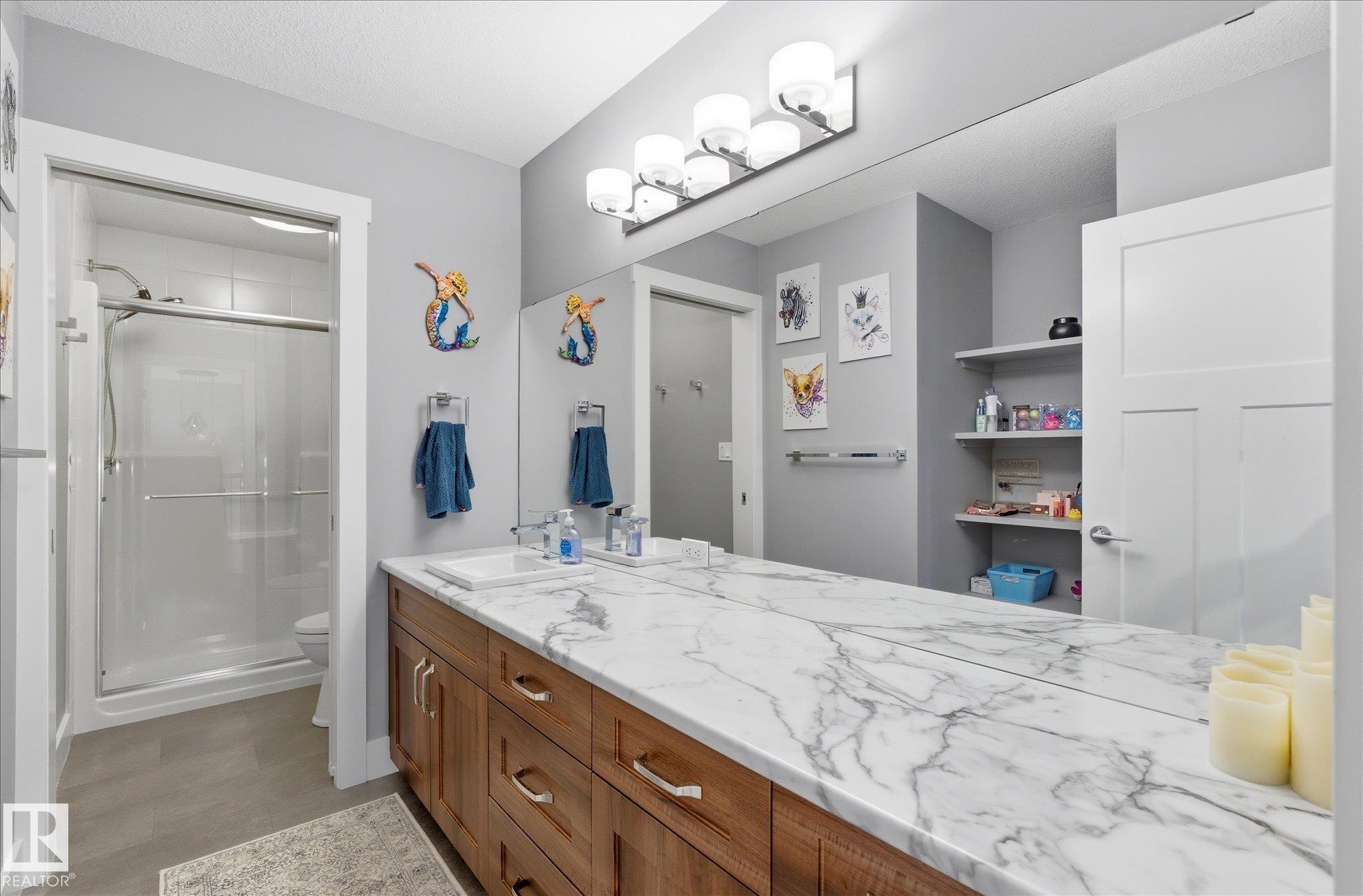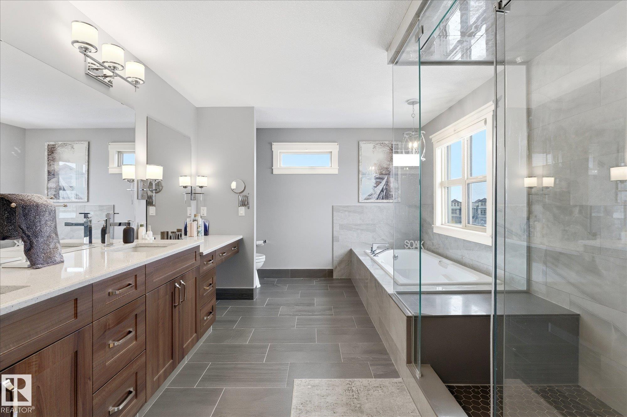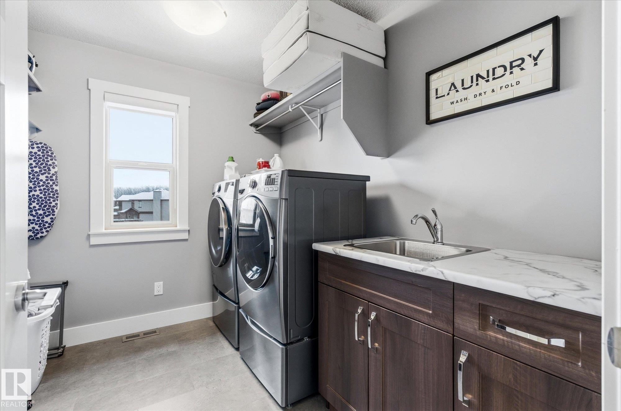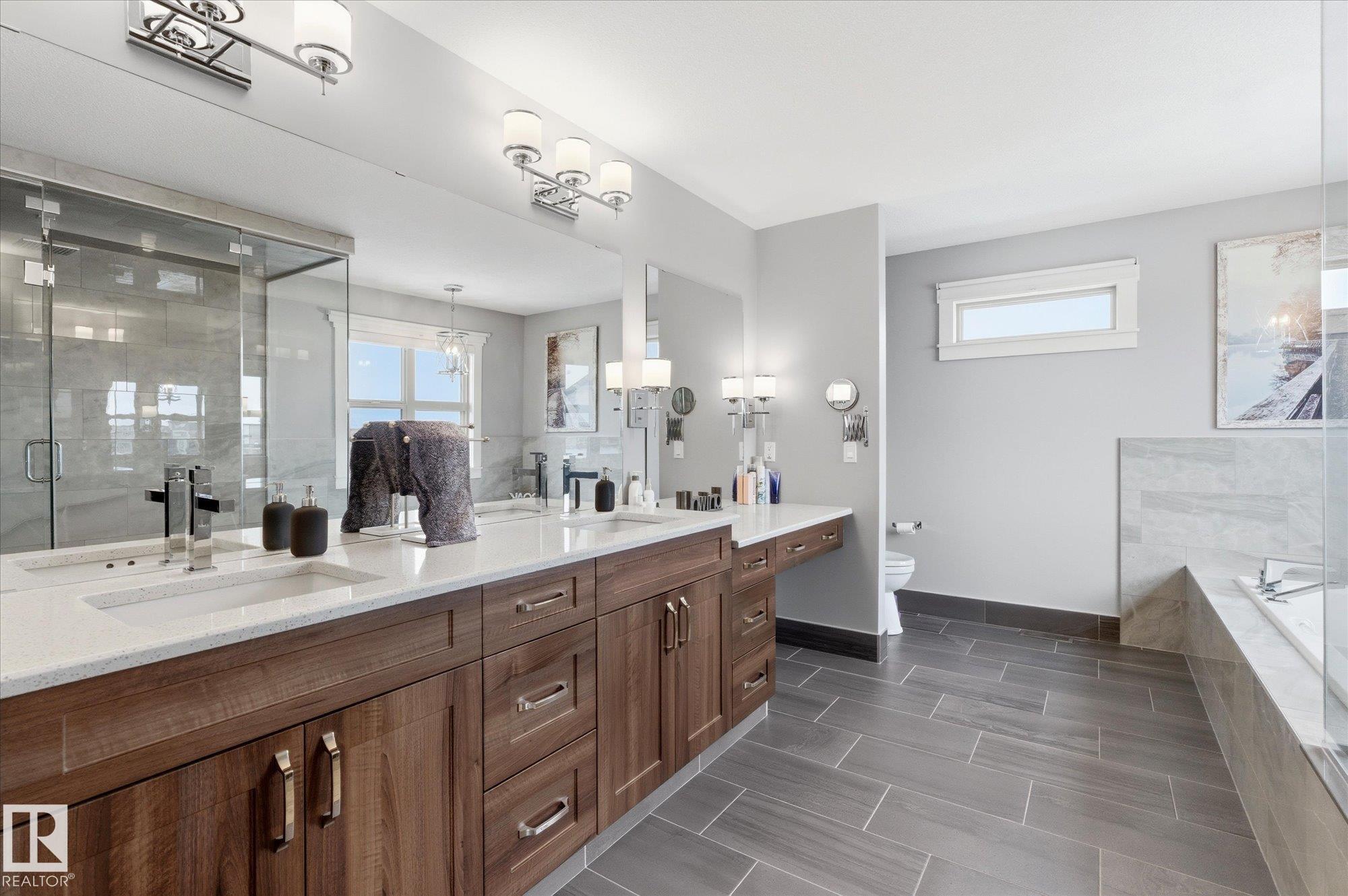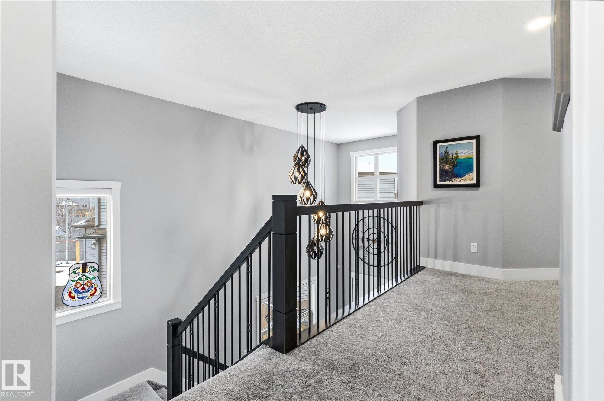 Functional sophistication meets elevated living in this fully finished & upgraded home. Over 2,800 sq.ft., this Western Living built property is designed for both everyday comfort & entertaining. Heart of the home is an exceptional chef's kitchen featuring gas range, commercial-sized fridge, stone countertops, ceiling-height cabinetry, massive island, & walk-through pantry. Open-concept dining area is surrounded by windows showcasing serene greenspace views, while living room is anchored by stylish gas fireplace. Main floor den, mudroom with convenient dog wash, & thoughtful design details throughout complete the main level. Upstairs offers generously sized bedrooms, stunning primary retreat with spa-inspired ensuite, bonus room, & convenient second-floor laundry. Fully developed basement features impressive ceiling height, industrial-inspired finishes, soundproof theatre/gaming room, an additional bedroom, & full bath. Home features oversized garage (25'10"x27'5"), in-floor heat in basement, A/C