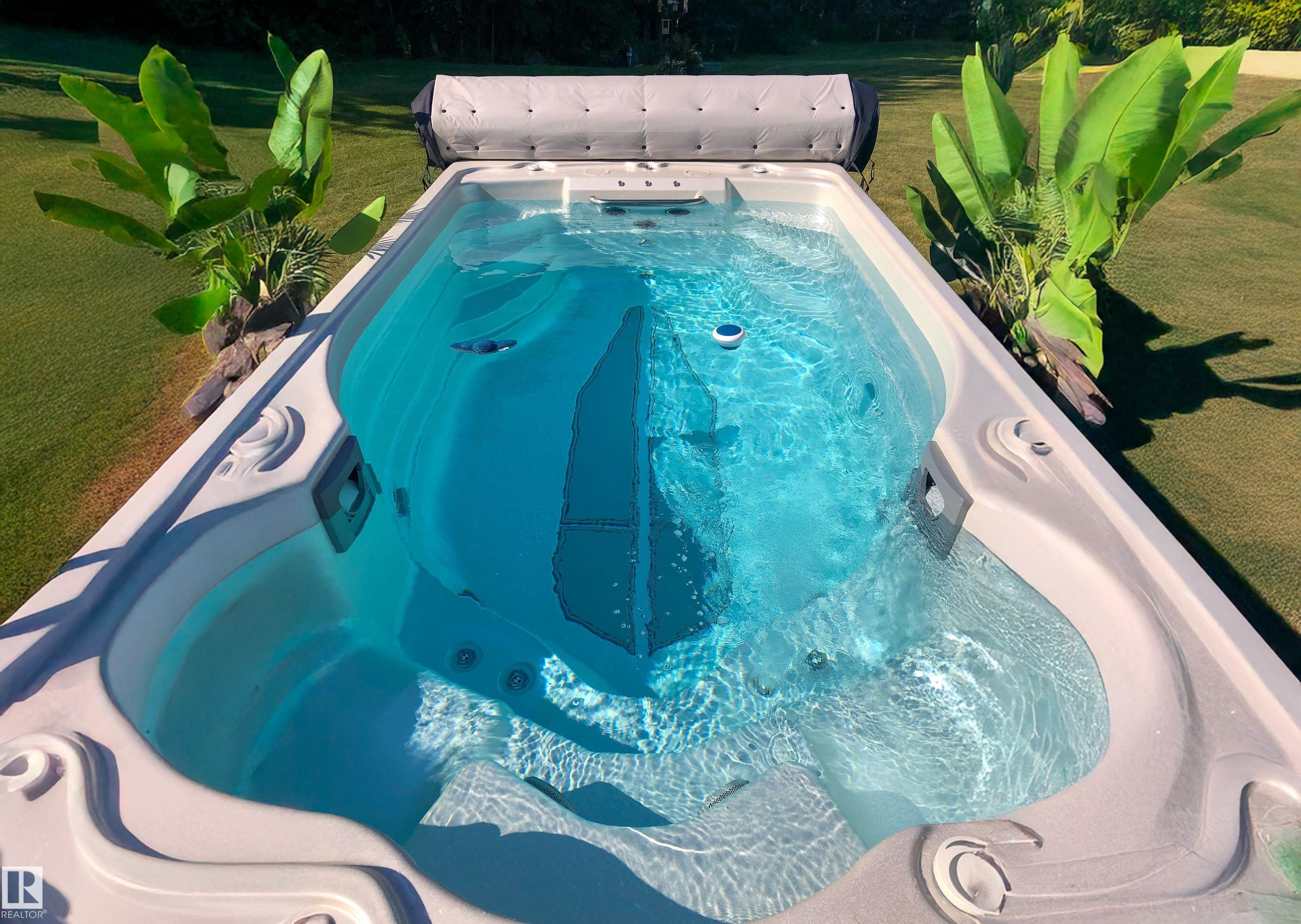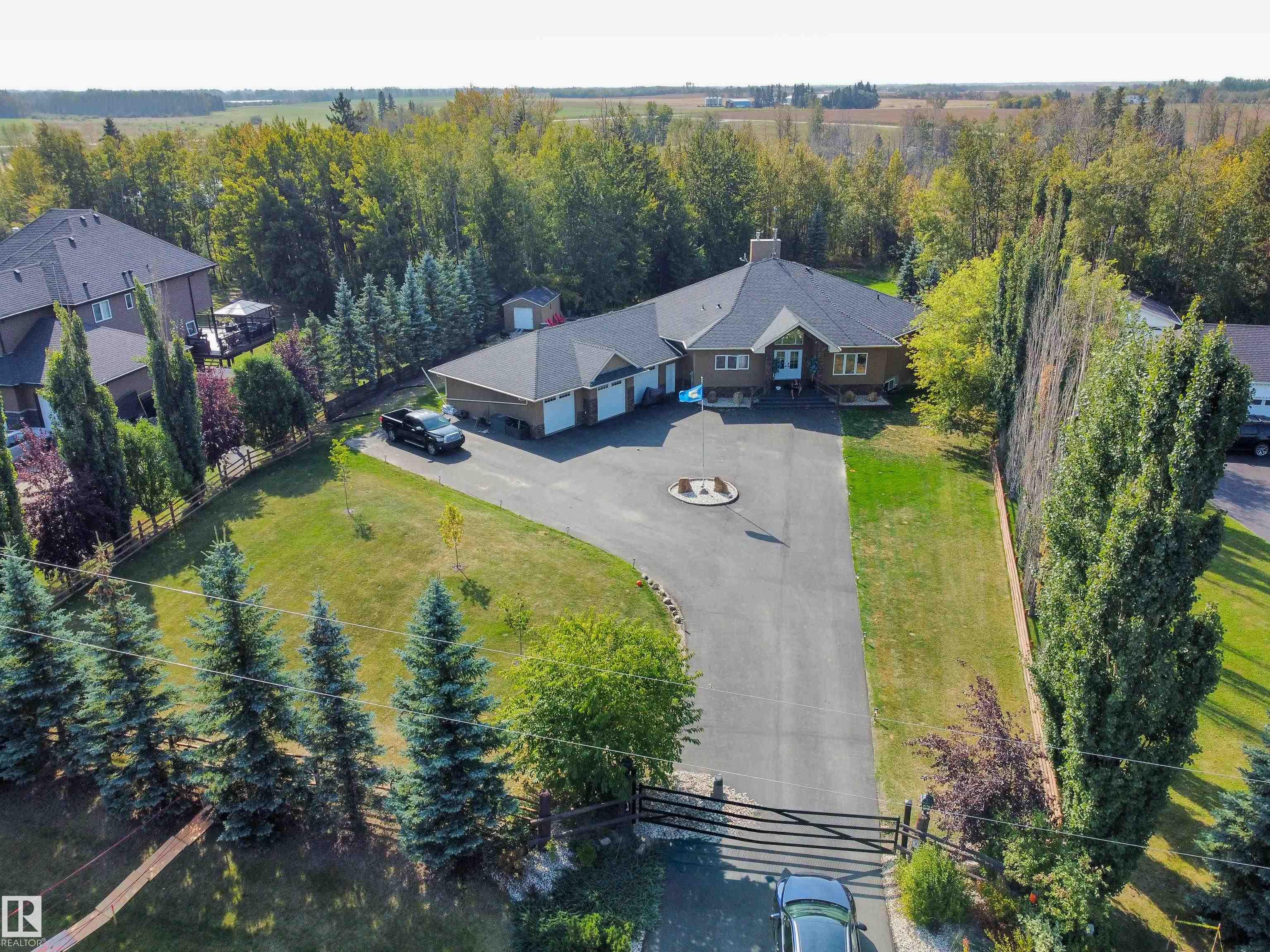 This one-of-a-kind bungalow offers a warm, lodge-like feel with vaulted ceilings, an open-concept design, and large windows that overlook the beautifully landscaped, private backyard. The main floor features new hardwood floors, a spacious primary suite with a two-person shower, soaker tub, and direct access to a 600 sq ft patio. A large den provides flexibility as a second bedroom or home office. The walkout basement includes in-floor heating, a wet bar, and three generous bedrooms with access to a lower patio finished in epoxy. Recent upgrades include a new roof, new paved driveway, new garage doors, new taps, new pressure tank, glycol system, and septic tank blower. Additional highlights include A/C, charcoal water filtration, 3-stage water reclamation septic system, and gutter covers. The massive 44x30 ft garage sits on a full foundation with a half bath and potential for a mechanic's pit or lower-level expansion. Outdoor living is elevated with a new fence, a cement pad with swim spa & much more!
