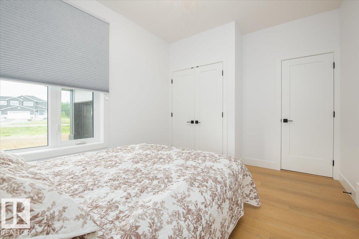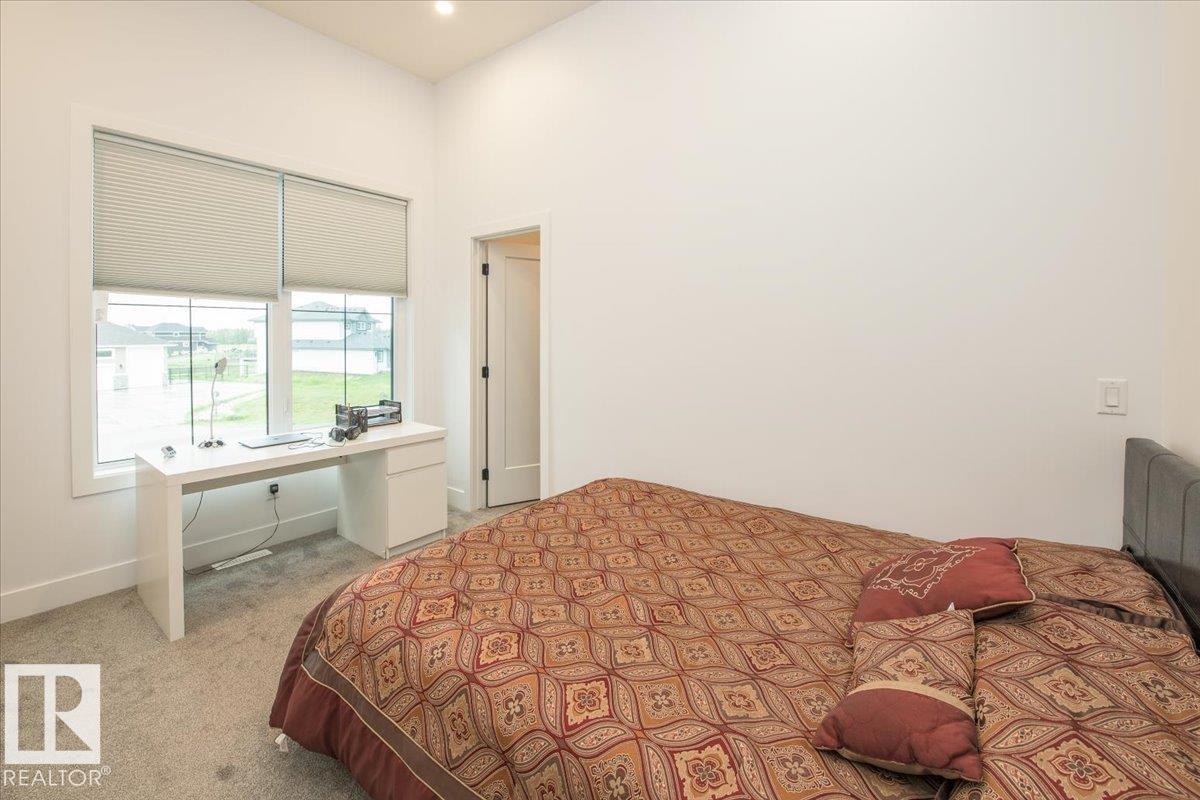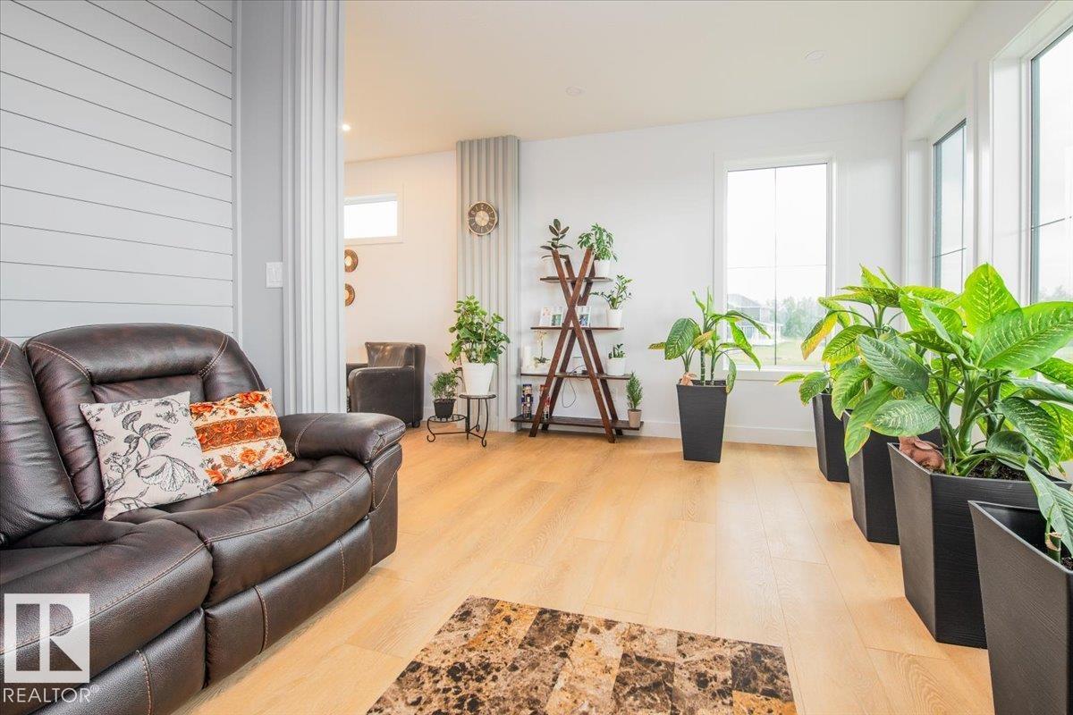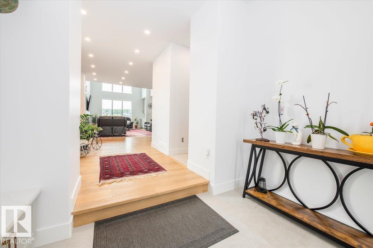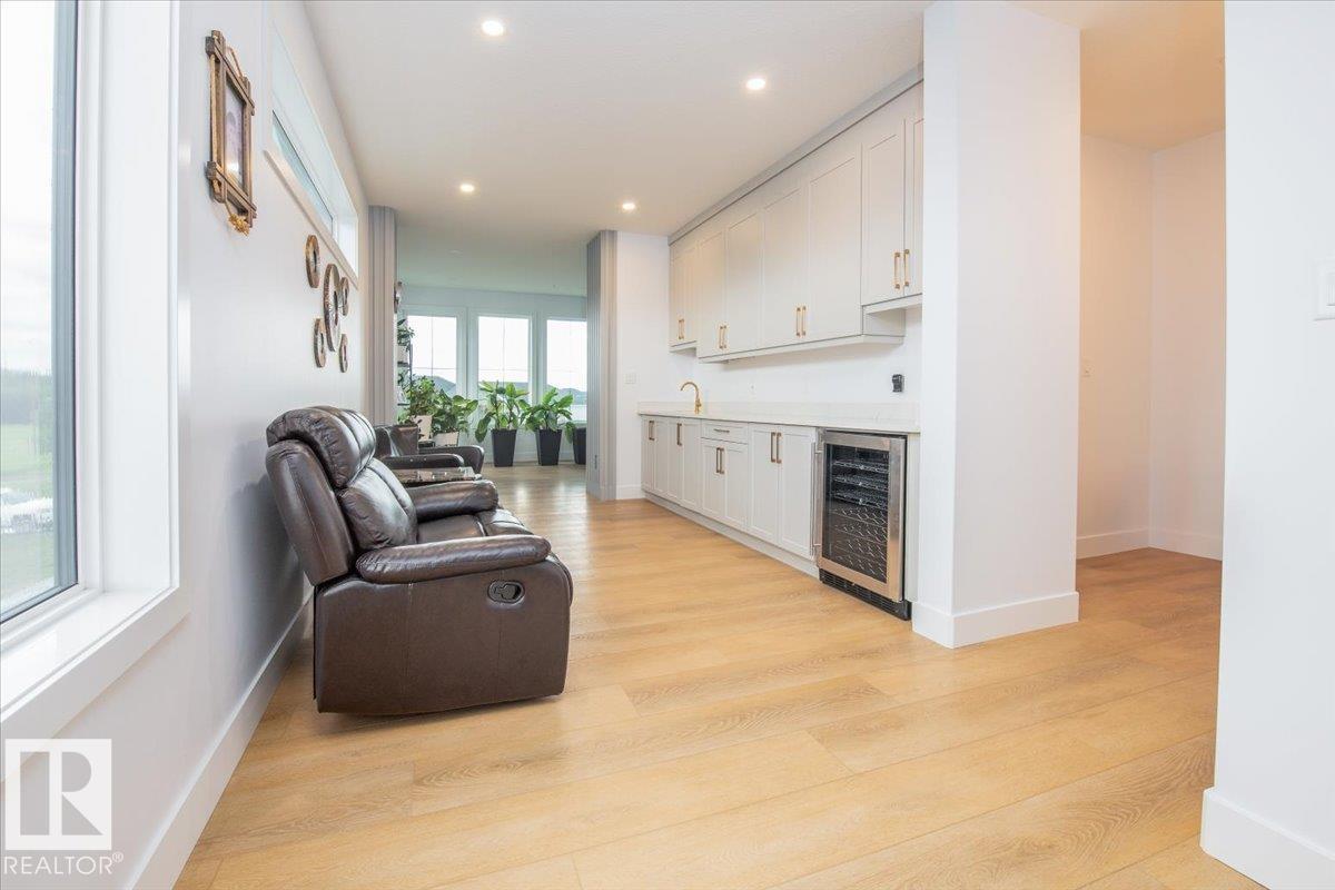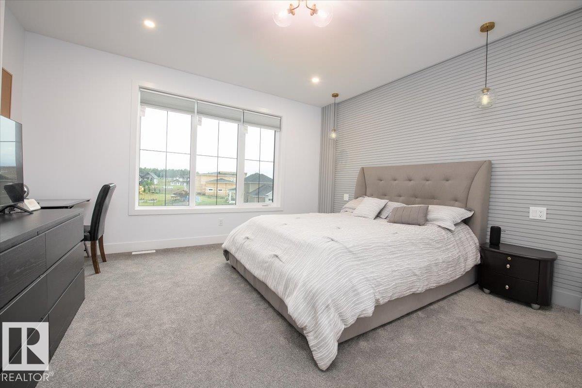 Experience luxury living in this stunning 2023 custom estate, just 15 minutes west of Edmonton. Designed to impress, this 6-bedroom, 4-bath home combines modern elegance with family-friendly comfort. The open-concept main floor boasts soaring 10-ft ceilings, luxury vinyl plank flooring, and a chef's dream kitchen with gas range, quartz counters, oversized island, and soft-close cabinetry--perfect for both everyday living and entertaining. A main-floor bedroom and full bath add convenience for guests or multigenerational living. Upstairs, the showstopping primary suite offers a spa-like ensuite with soaking tub, dual sinks, and a walk-in closet. A wet bar, flex room, laundry, and two more bedrooms complete the upper level. The fully finished basement features two additional bedrooms, a spacious rec room with wet bar, and another full bath. Enjoy summer evenings on the large deck with gas BBQ hookup. With a triple garage and extra parking, this home checks every box.