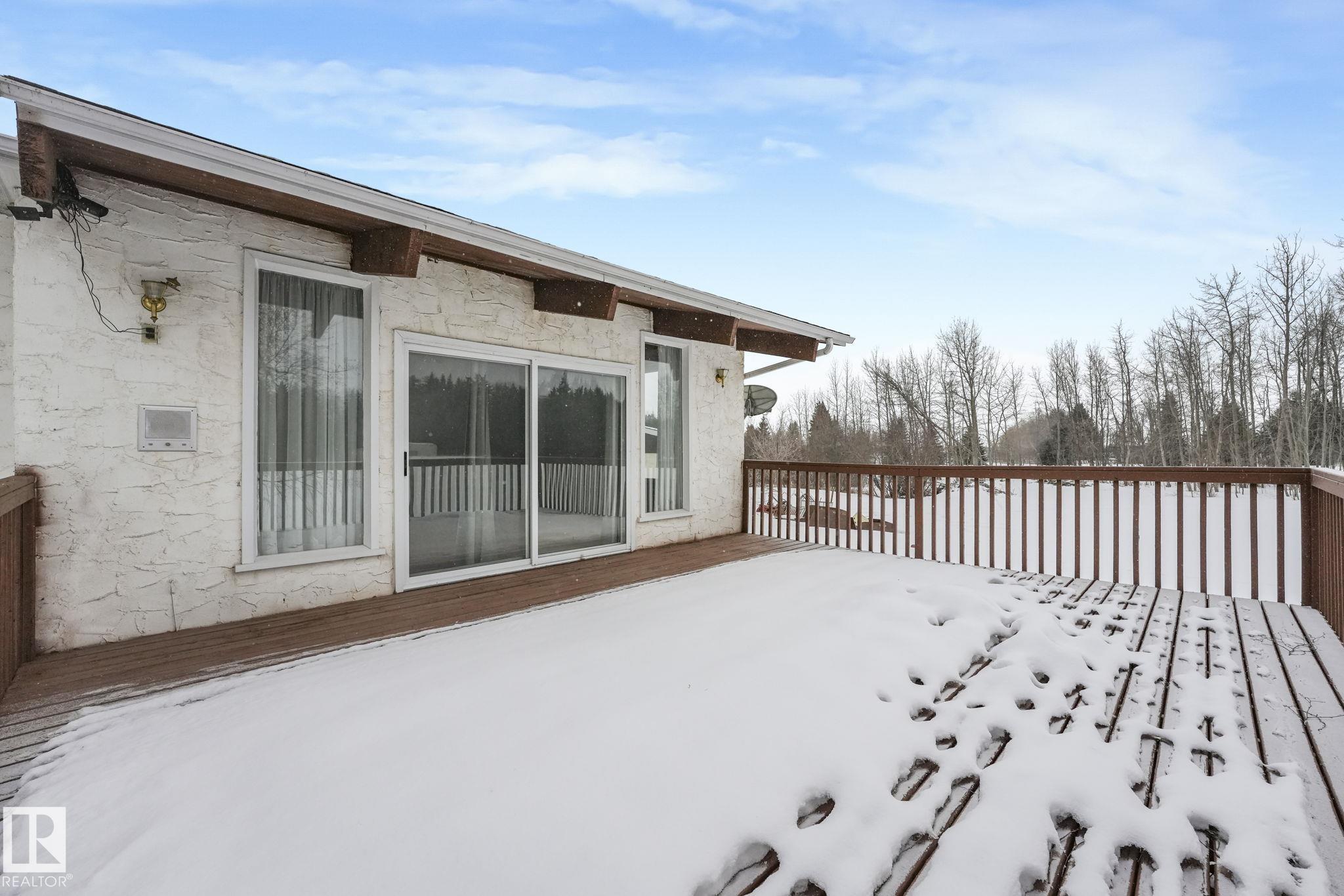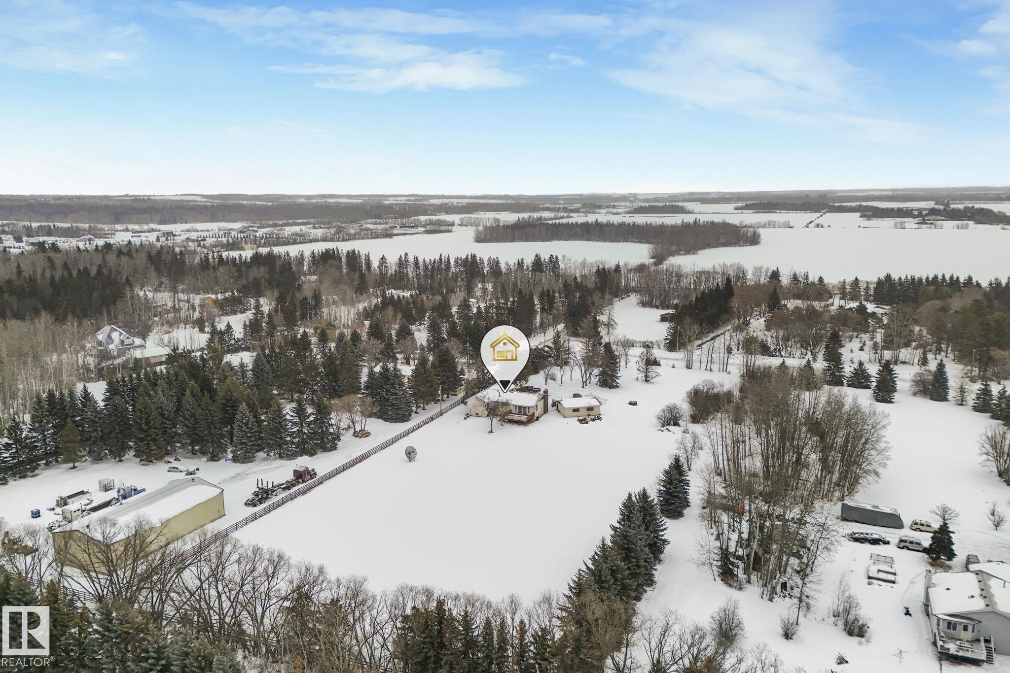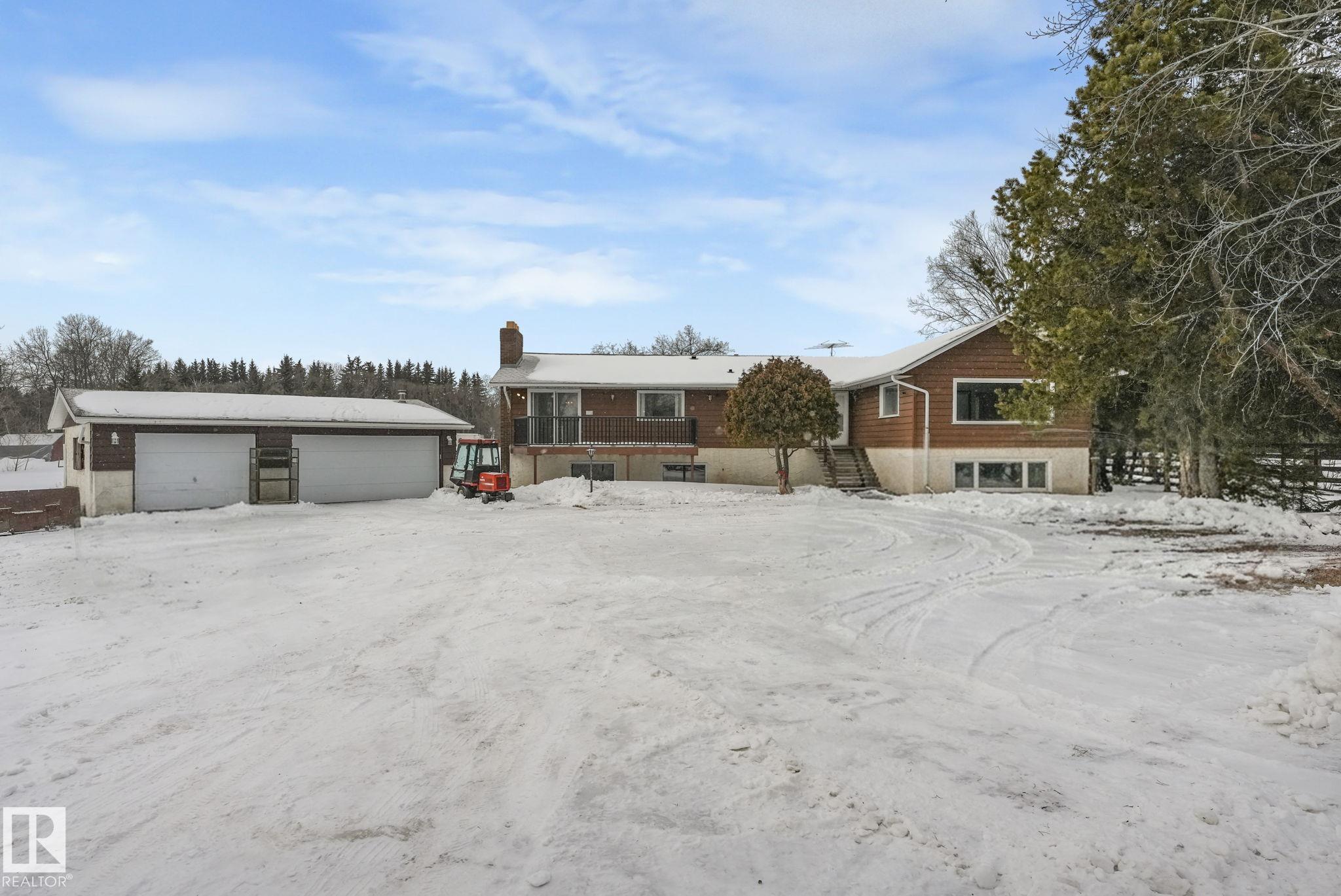 Welcome to Westbrook Crescent, a cozy acreage community just 4 mins to Spruce Grove & 13 mins to Edmonton. This 2,400+ sqft. bungalow w/ a triple HEATED detached garage is situated on 3 acres, offering the privacy of country living & the convenience of town. To start, the huge primary bed is bathed in morning light through large windows, w/ an attached 13x13ft walk-in closet that could be made into a luxury ensuite. The main level also includes 2 beds & a grand den/office boasting a beautiful vaulted ceiling. The sunken, west-facing living room is expansive, as is the kitchen & dining area, which opens to an east-facing deck perfect for morning coffee. A 4-pce main bath completes this level. The partially finished basement offers a vast family room, 2 beds, a 3-pce bath, laundry area, & ample storage. Recent updates include both front and back decks, shingles, soffit, and fascia, all done roughly 5 yrs ago. With plenty of space and charm this bungalow offers boundless opportunity for it's new for owners.