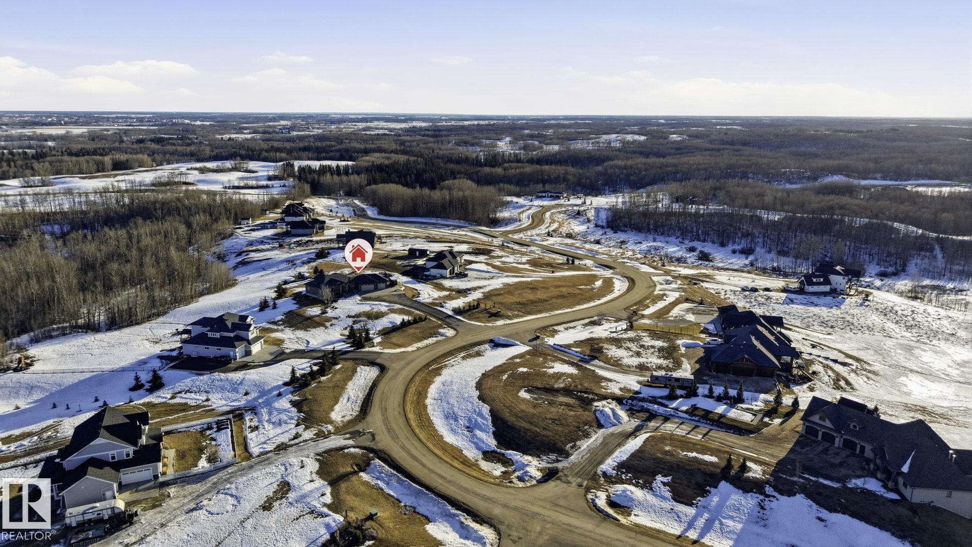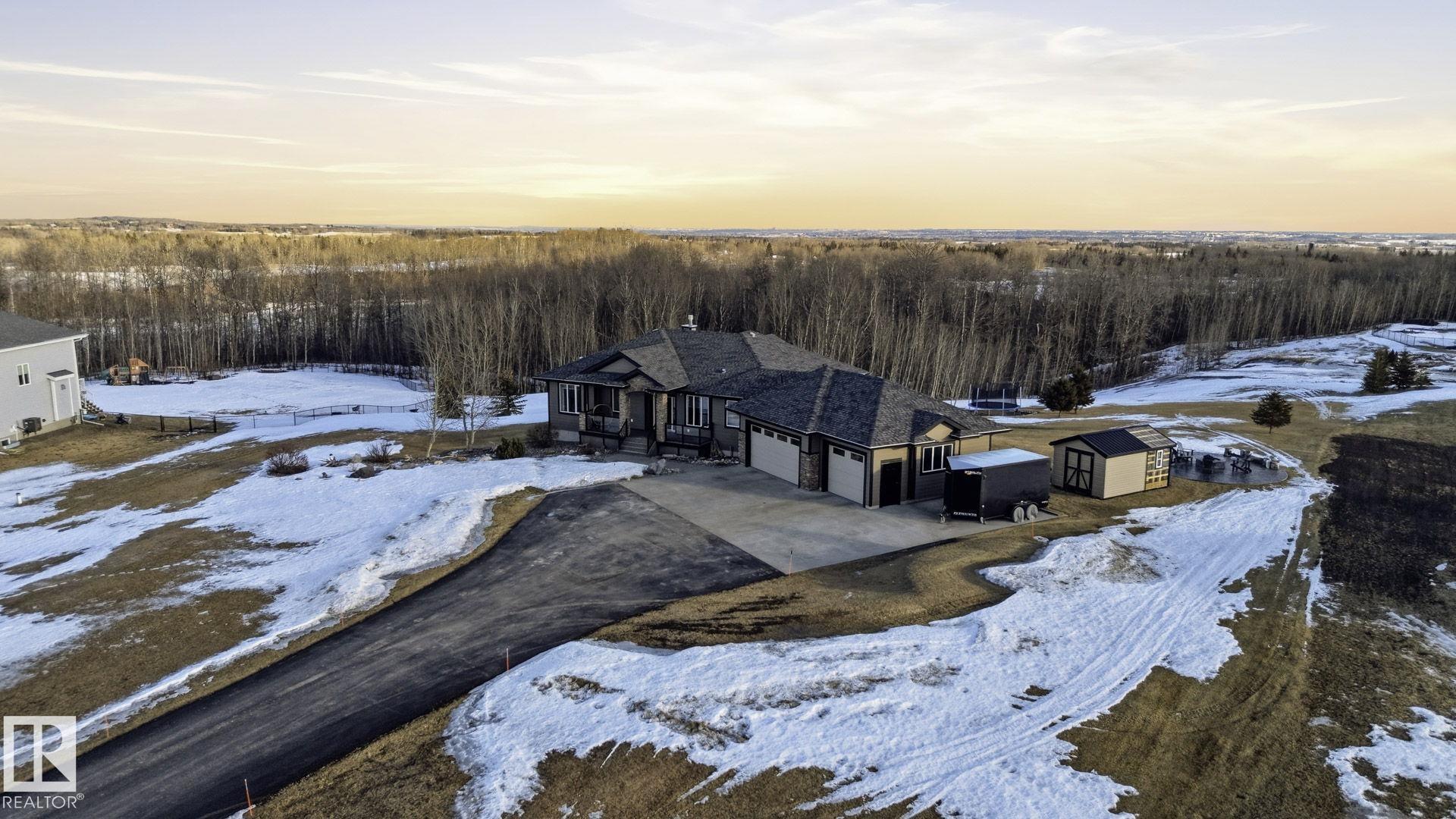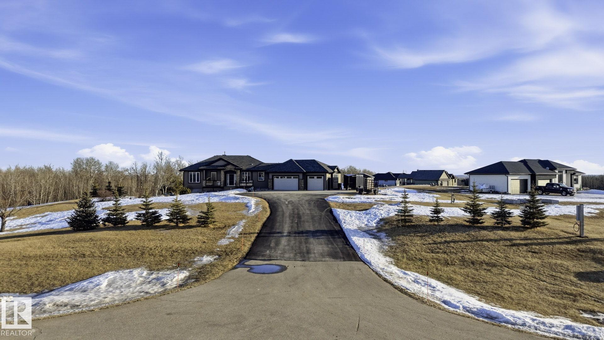 Discover this EXECUTIVE hilltop bungalow situated on 2.09 acres, just 5 minutes from Stony Plain w/paved access all the way. Nestled in the Hills of Twin Lakes--surrounded by beautiful homes, a nature reserve, & rolling landscapes--this home offers rare countryside views from your vaulted windows & covered deck. This luxurious home provides a serene country setting remarkably close to town, & only minutes away from the Chickakoo Lake Recreation Area. Upgrades to this home include Hardie board siding, 200Amp power service, 240 Volt plugs, RV plug in, no maintenance decking, irrigation for planters around the house, an oversized 40x25 heated garage w/floor drain, hot tub & many landscaping upgrades. Inside the home, features include vaulted ceilings, granite countertops, real wood cabinets, 9' ceilings in the basement creating exceptional added living space , a walk-through pantry, two gas fireplaces, hardwood floors, heated ensuite floors, a glass & tile shower & main floor laundry for added convenience.