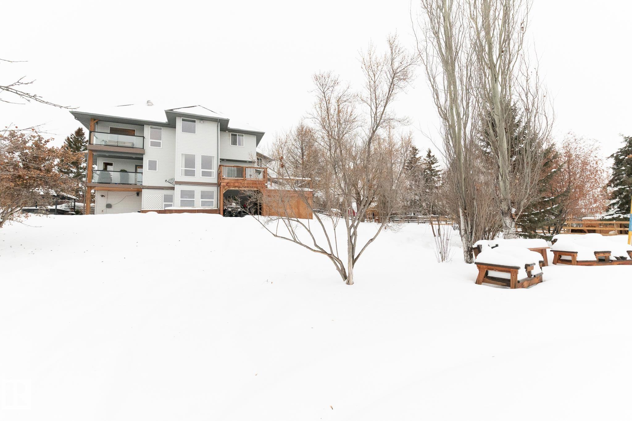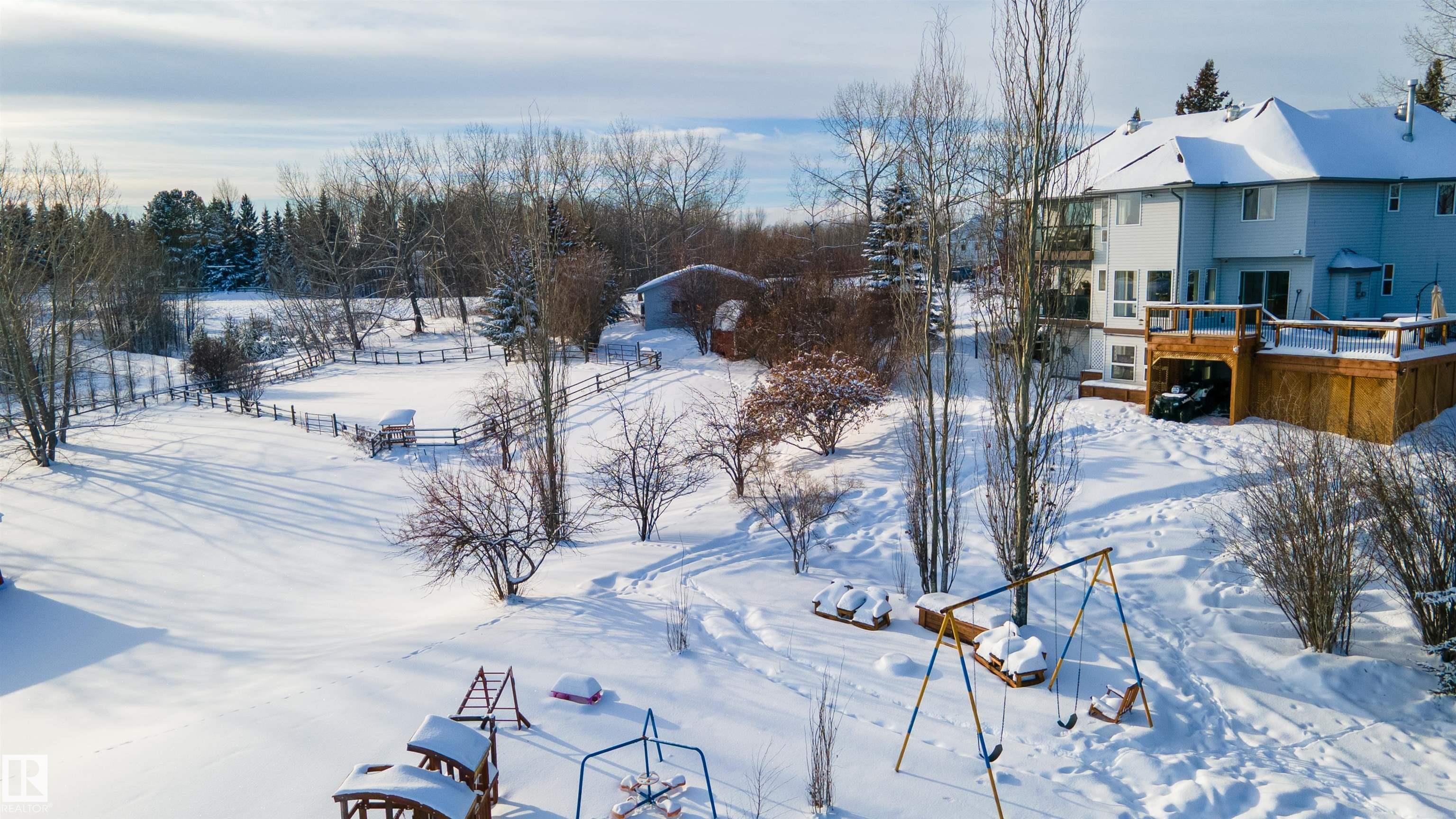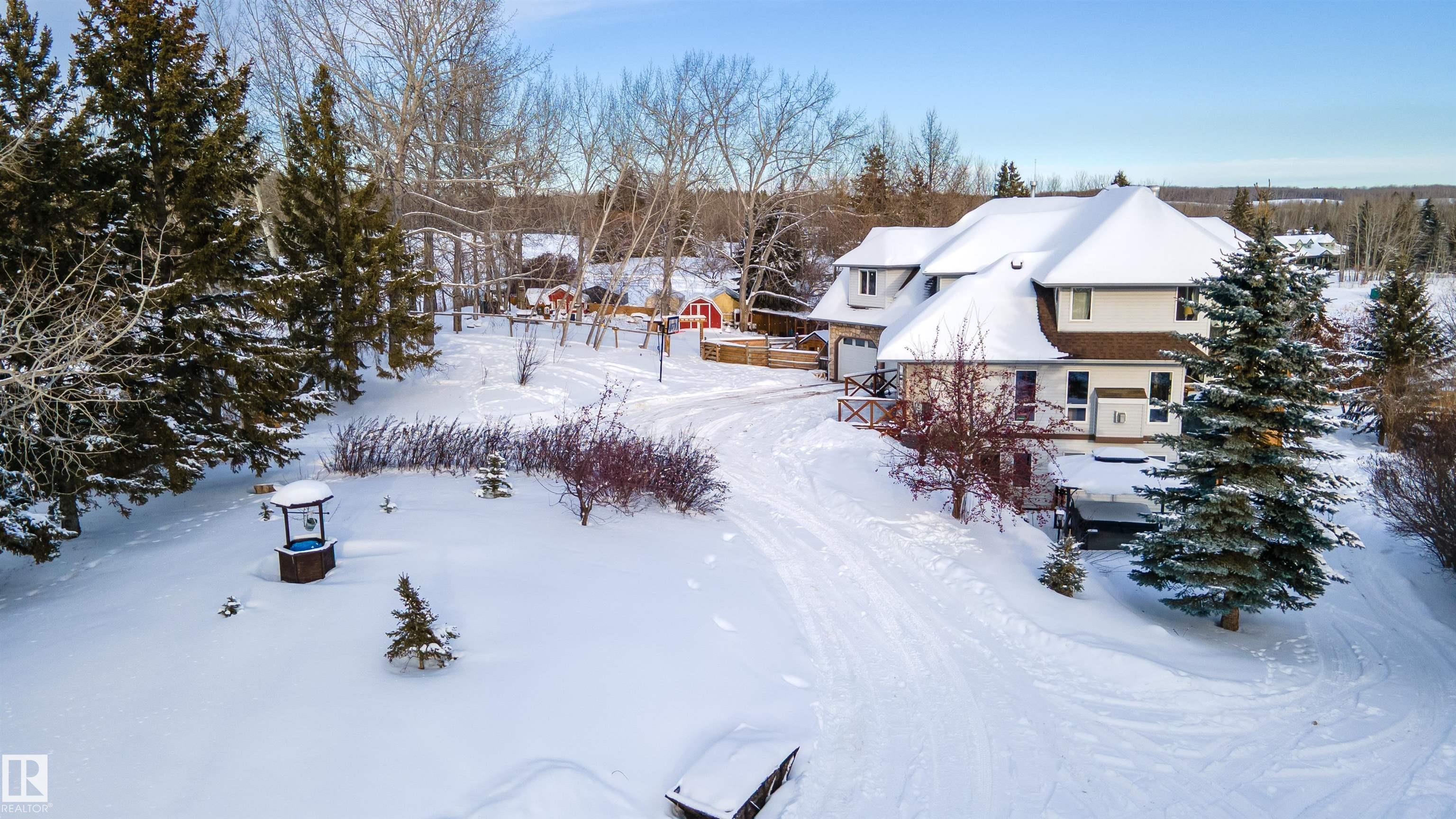 Nestled on 3.19 acres in sought-after Hillside Estates, this custom 2600+ sq ft two-storey with walkout basement captures breathtaking east-facing views and a design unlike anything else on the market. Offering 4 bedrooms, 3.5 bathrooms, a main floor den, and multiple inviting living spaces, this home has been beautifully renovated over the past five years. Featuring updated flooring, a stunning kitchen, refreshed bathrooms, newer furnaces, shingles, and more. With pavement right to the front door and quick access to Stony Plain, Chickakoo Lake, and nearby amenities, the location is as exceptional as the home itself. A detached garage adds storage and hobby space, while the property is fully set up for true acreage living. With generous flex areas throughout, this is a rare opportunity for growing families seeking space, style, and a one-of-a-kind setting. Opportunities like this don't wait.