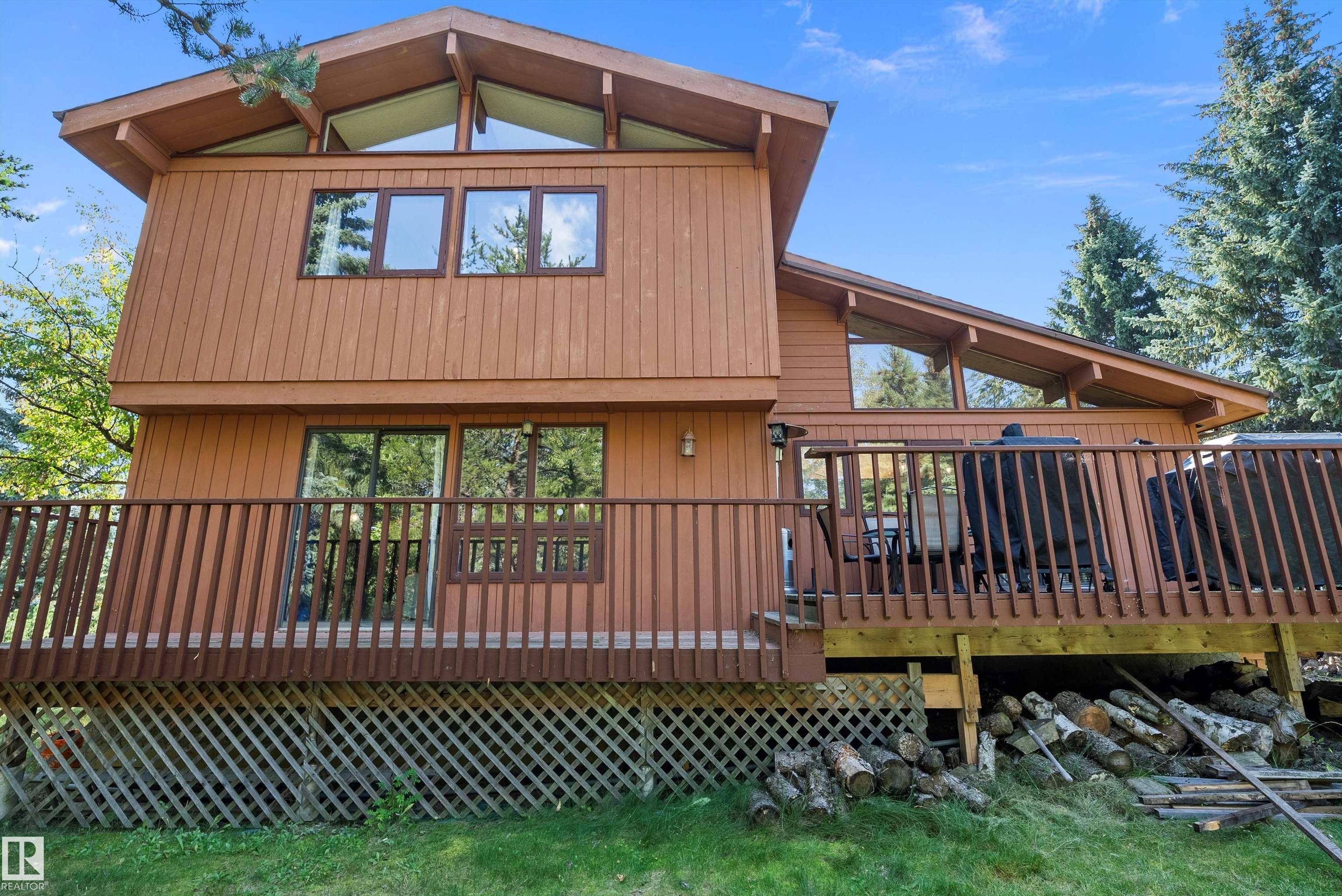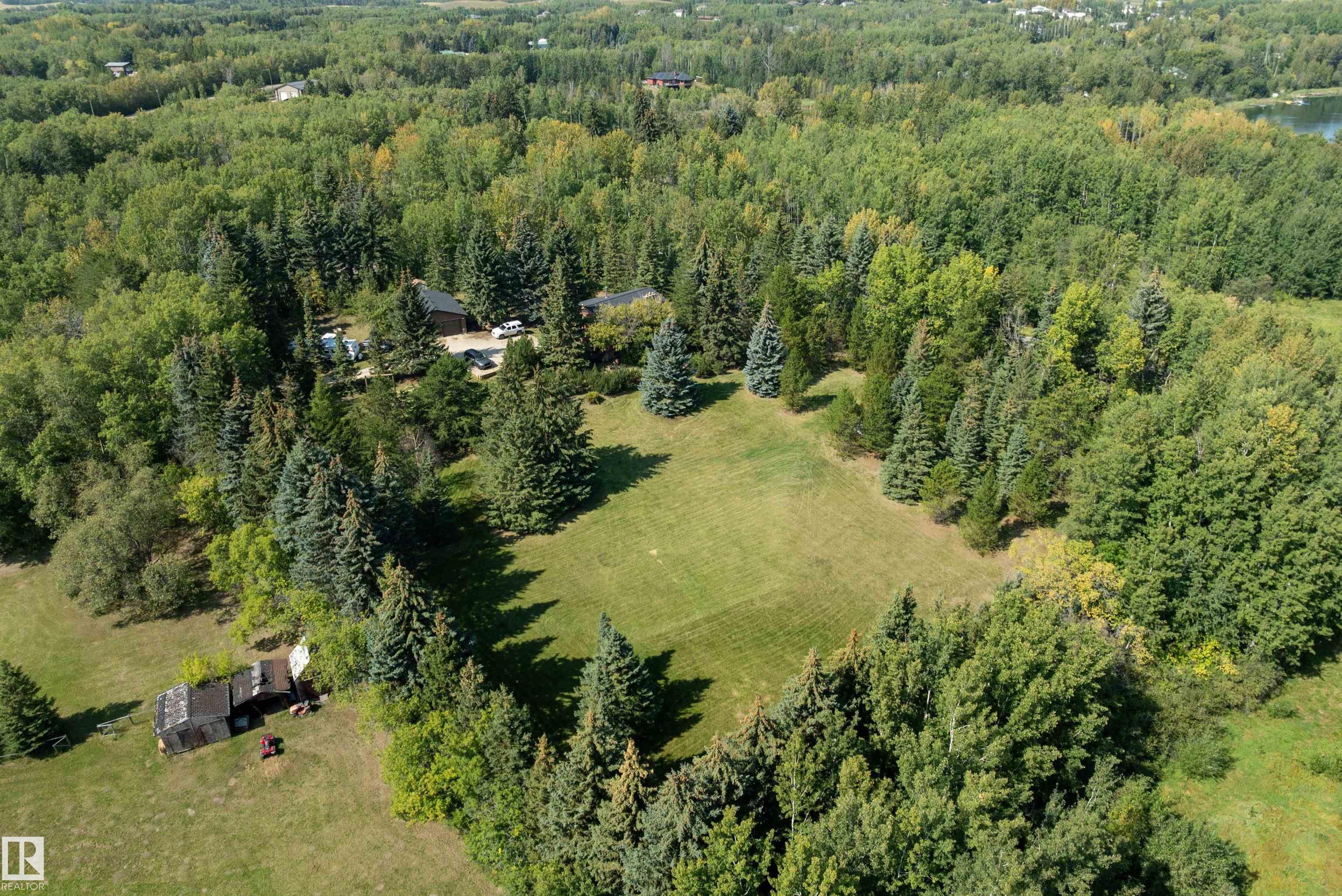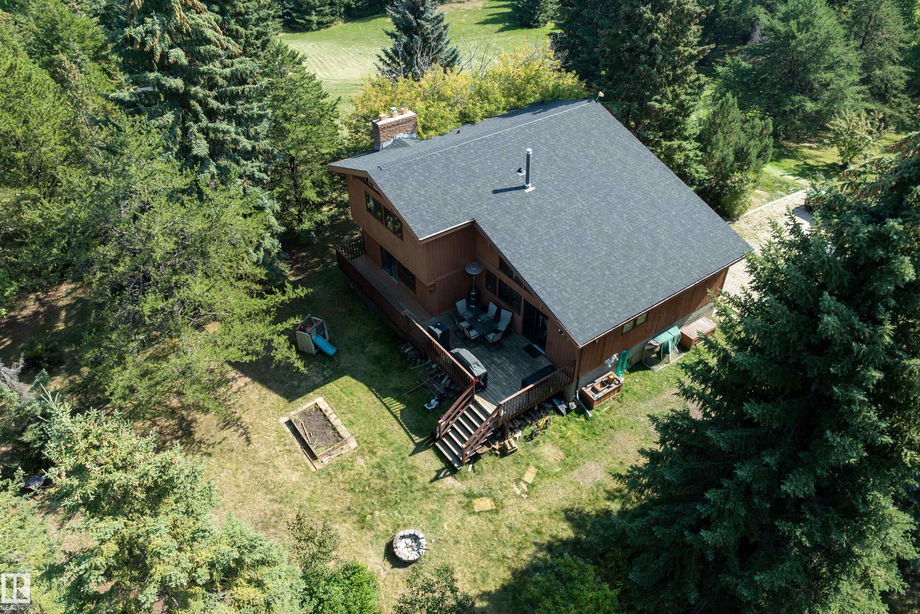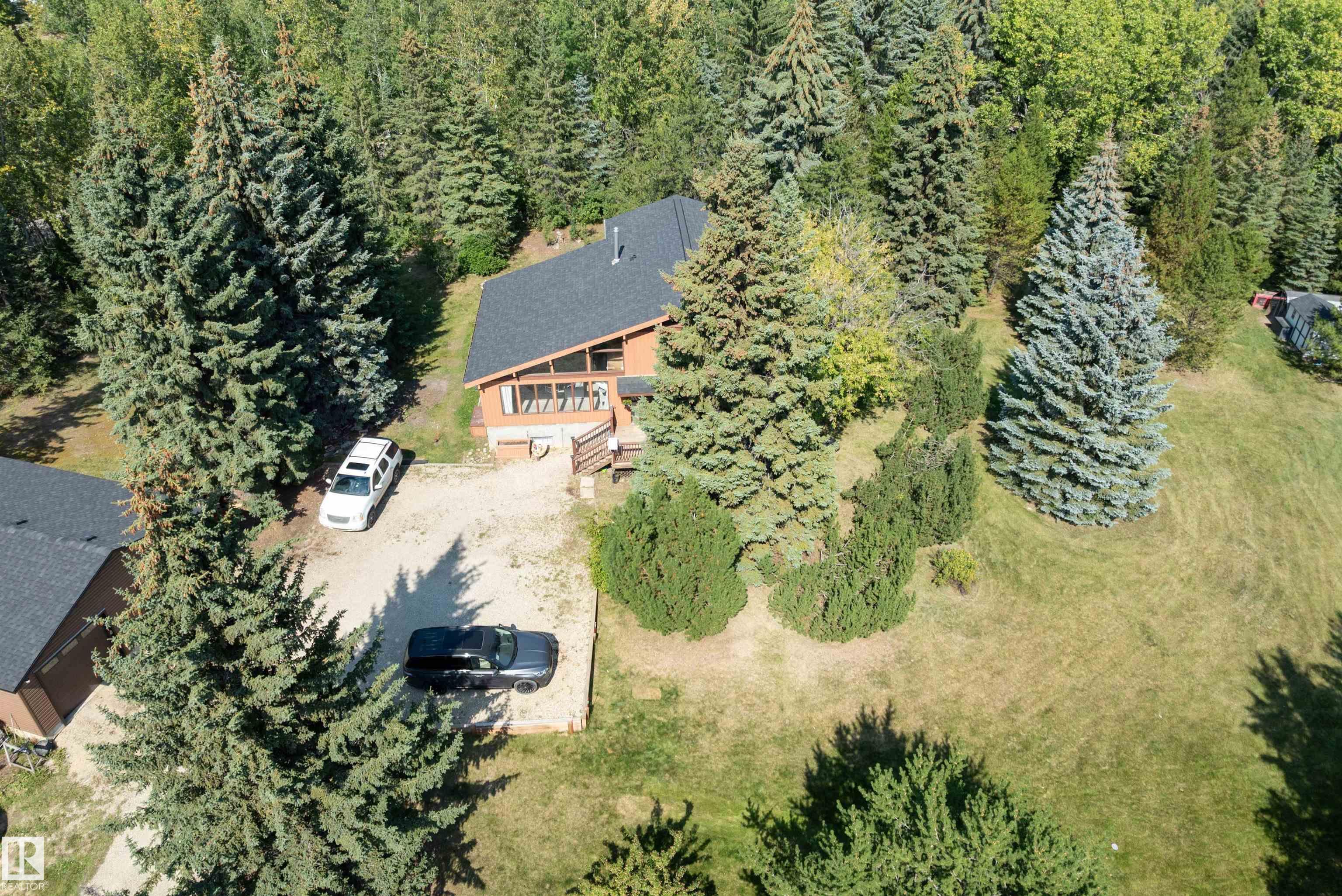Minutes from town on paved roads, you'll find a private, tree lined driveway that leads you to this idyllic 3.4 acre acreage. It's a dreamy landscape of rolling hills & wide open spaces surrounded by trees. Inside you'll find over 2200 sq ft of finished living space with 5 huge bedrooms (4 up) and 3 baths. The home captivates with vaulted wood beam ceilings & soaring windows flooding the the living room in natural light, a sprawling kitchen with large island & a sunken cozy family room with gas fireplace. Shingles, both furnaces, hot water tank and 24x36' garage (with 8' doors & 10' ceilings & heater) were done in 2019. Induction cooktop in 2019, carpets 2020, AC in 2021, & dishwasher 2024. Zoned for stony plain school with bussing available & minutes to town - you can have the dream acreage without sacrificing convenience! If you've been waiting for a large home with room for everyone, character, most of 'the big stuff' done so you can unleash your creativity in cosmetic updates...welcome home!