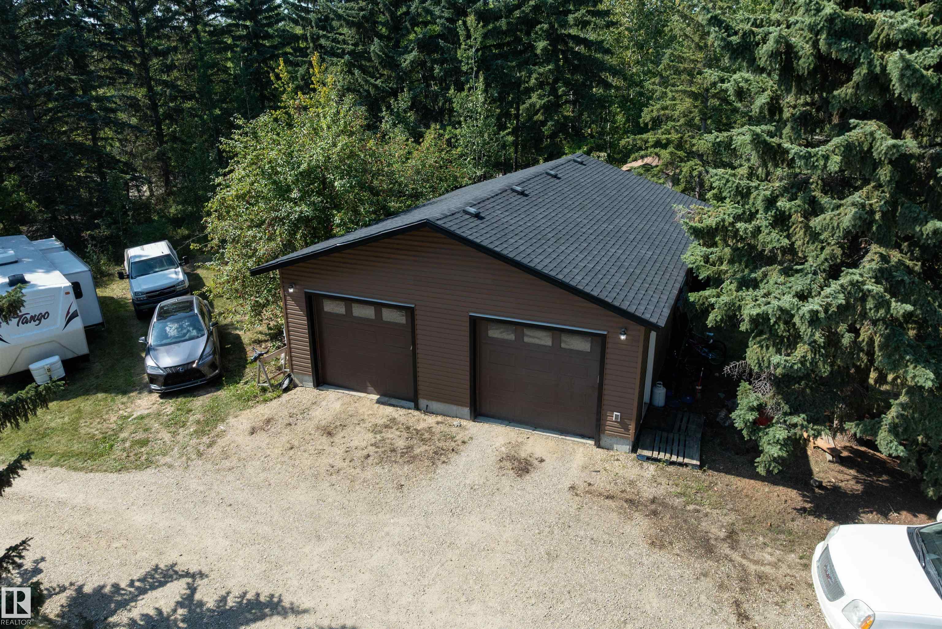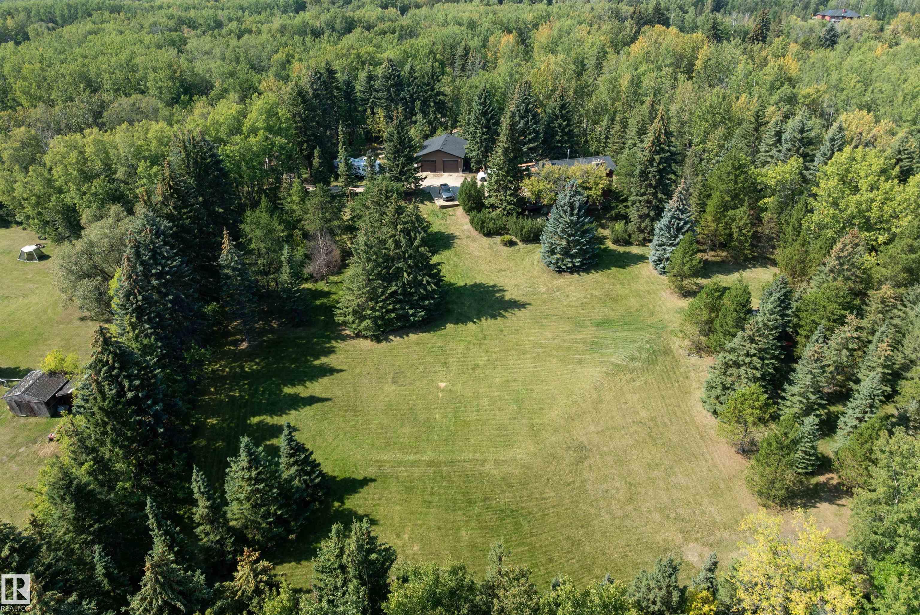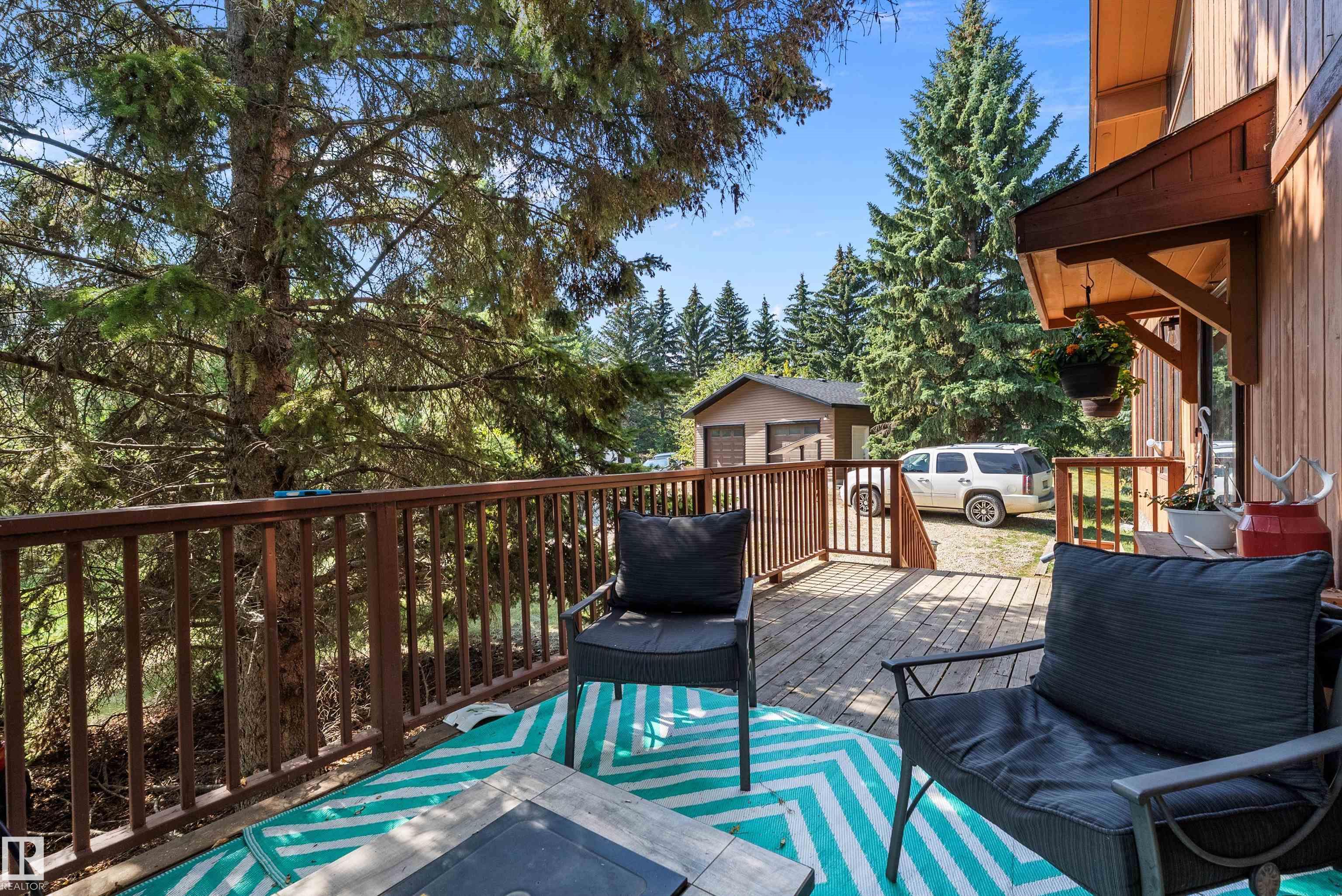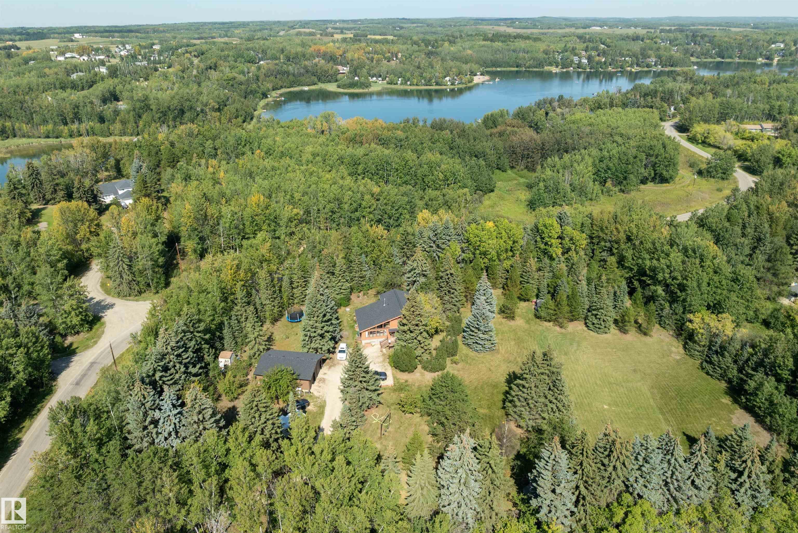 Minutes from town on paved roads, you'll find a private, tree lined driveway that leads you to this idyllic 3.4 acre acreage. It's a dreamy landscape of rolling hills & wide open spaces surrounded by trees. Inside you'll find over 2200 sq ft of finished living space with 5 huge bedrooms (4 up) and 3 baths. The home captivates with vaulted wood beam ceilings & soaring windows flooding the the living room in natural light, a sprawling kitchen with large island & a sunken cozy family room with gas fireplace. Shingles, both furnaces, hot water tank and 24x36' garage (with 8' doors & 10' ceilings & heater) were done in 2019. Induction cooktop in 2019, carpets 2020, AC in 2021, & dishwasher 2024. Zoned for stony plain school with bussing available & minutes to town - you can have the dream acreage without sacrificing convenience! If you've been waiting for a large home with room for everyone, character, most of 'the big stuff' done so you can unleash your creativity in cosmetic updates...welcome home!
