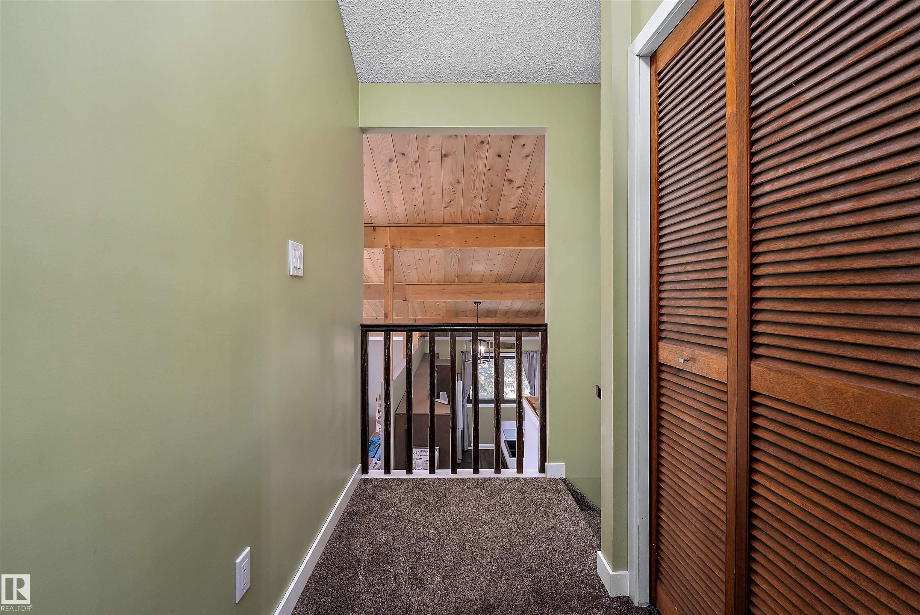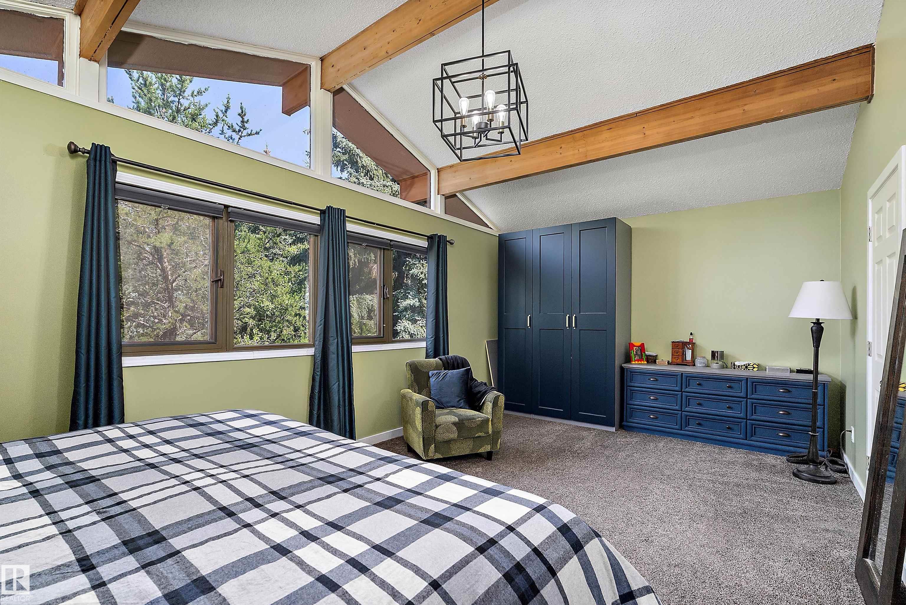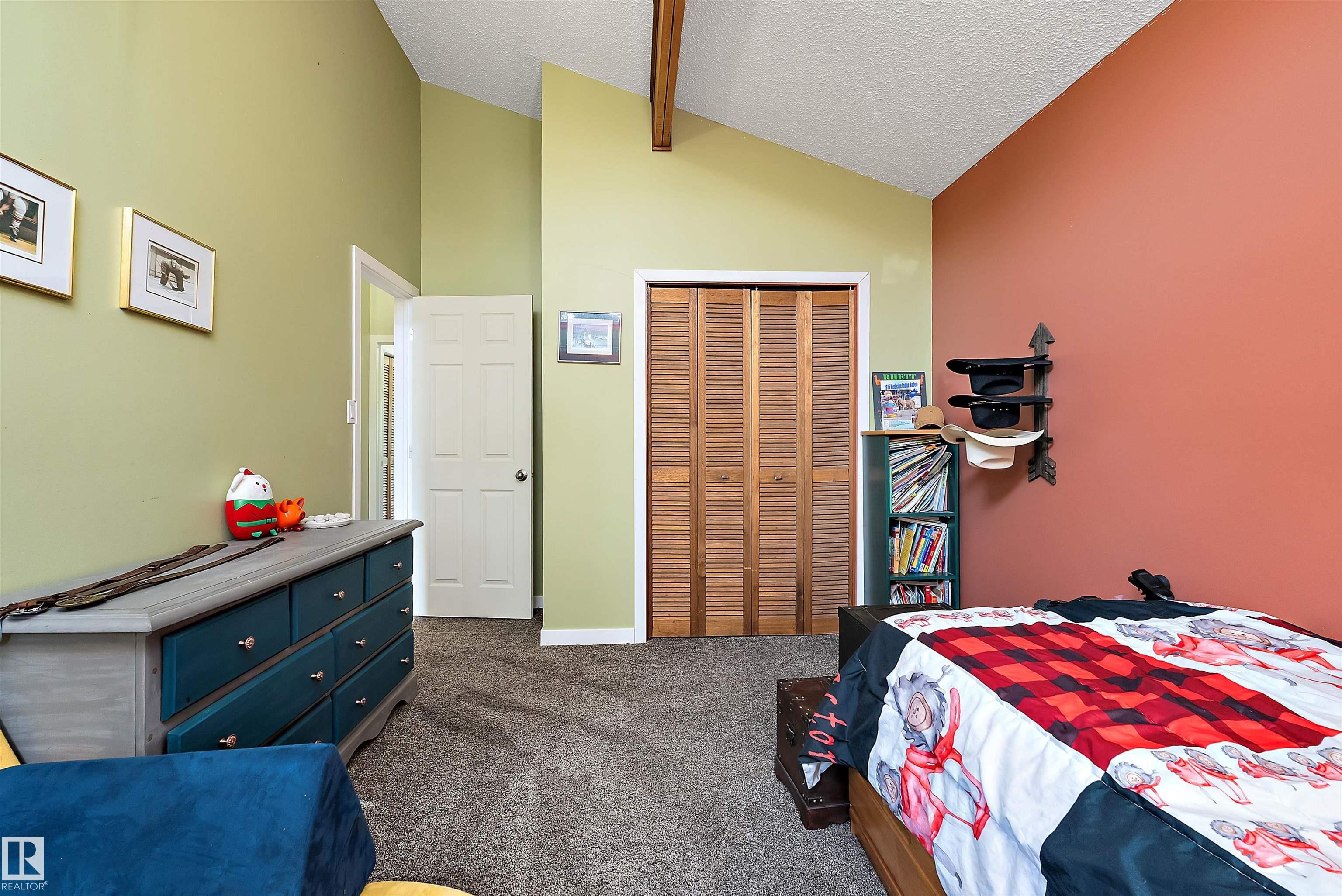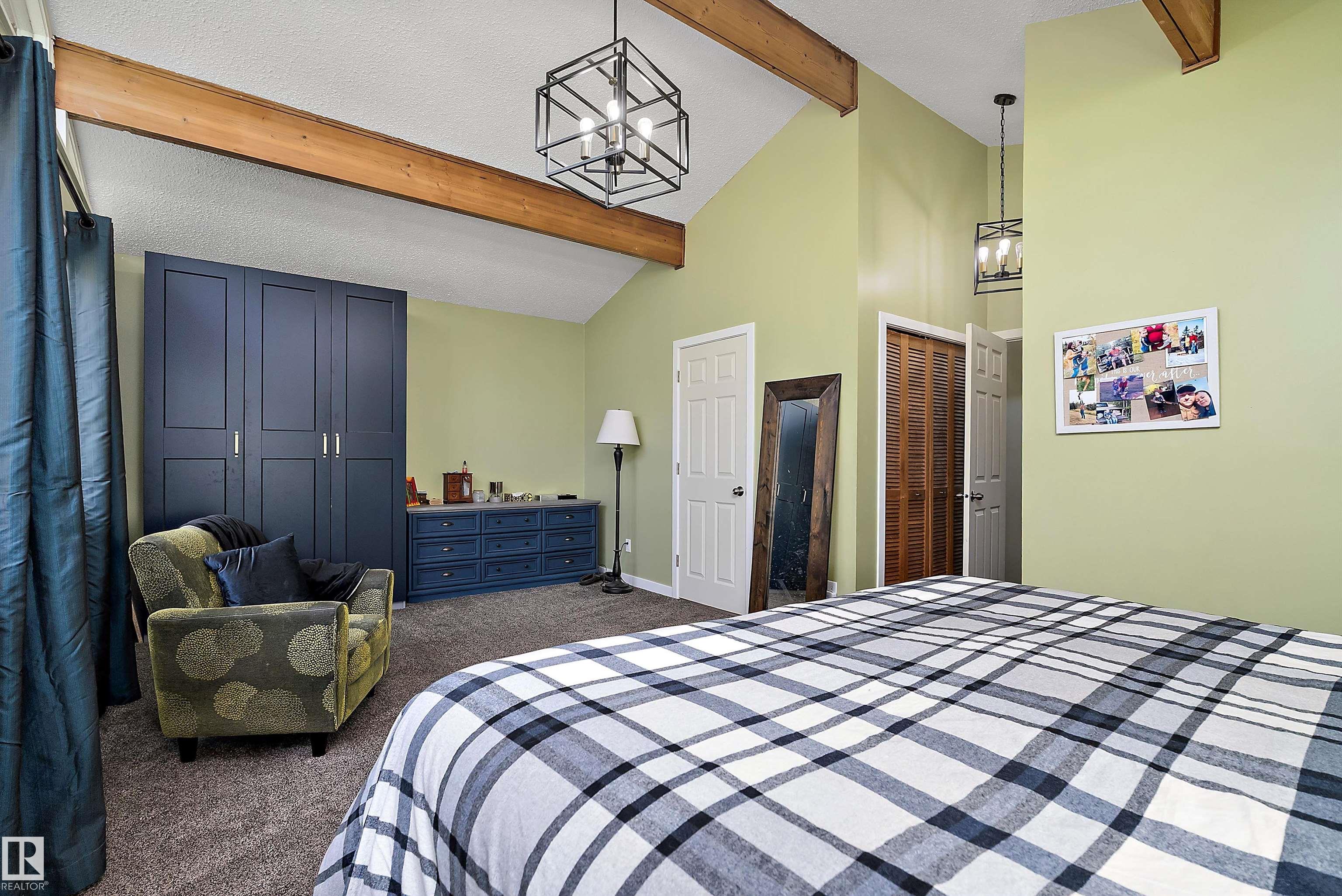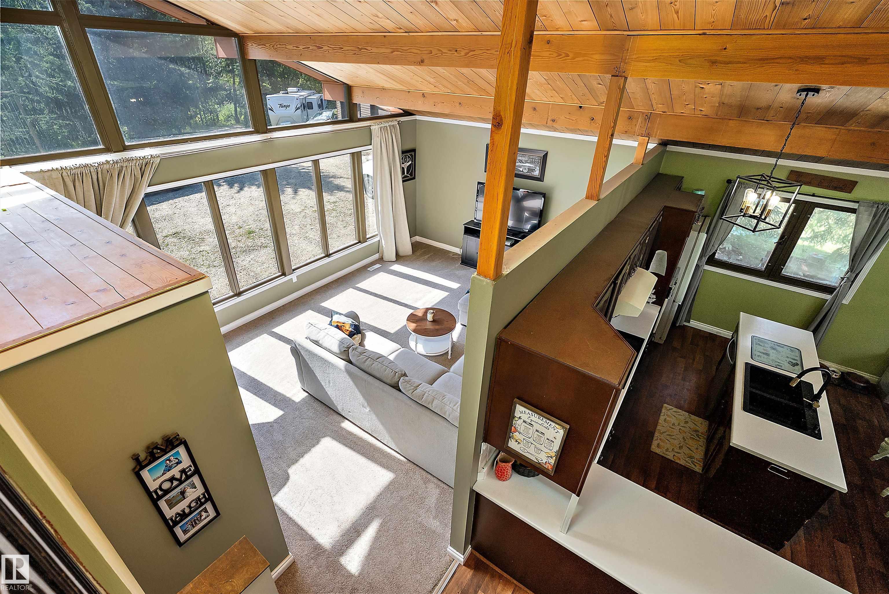 Minutes from town on paved roads, you'll find a private, tree lined driveway that leads you to this idyllic 3.4 acre acreage. It's a dreamy landscape of rolling hills & wide open spaces surrounded by trees. Inside you'll find over 2200 sq ft of finished living space with 5 huge bedrooms (4 up) and 3 baths. The home captivates with vaulted wood beam ceilings & soaring windows flooding the the living room in natural light, a sprawling kitchen with large island & a sunken cozy family room with gas fireplace. Shingles, both furnaces, hot water tank and 24x36' garage (with 8' doors & 10' ceilings & heater) were done in 2019. Induction cooktop in 2019, carpets 2020, AC in 2021, & dishwasher 2024. Zoned for stony plain school with bussing available & minutes to town - you can have the dream acreage without sacrificing convenience! If you've been waiting for a large home with room for everyone, character, most of 'the big stuff' done so you can unleash your creativity in cosmetic updates...welcome home!