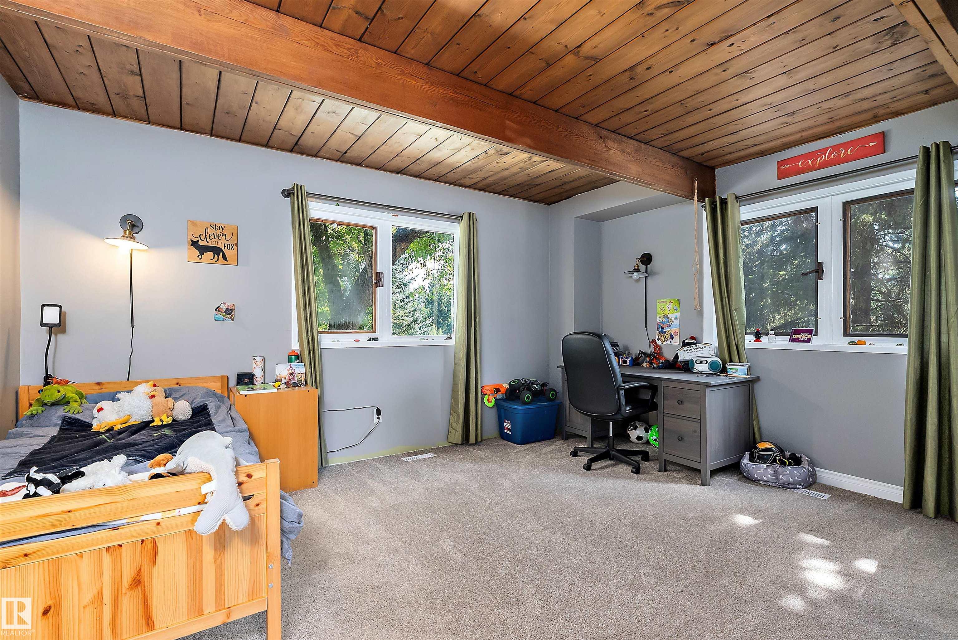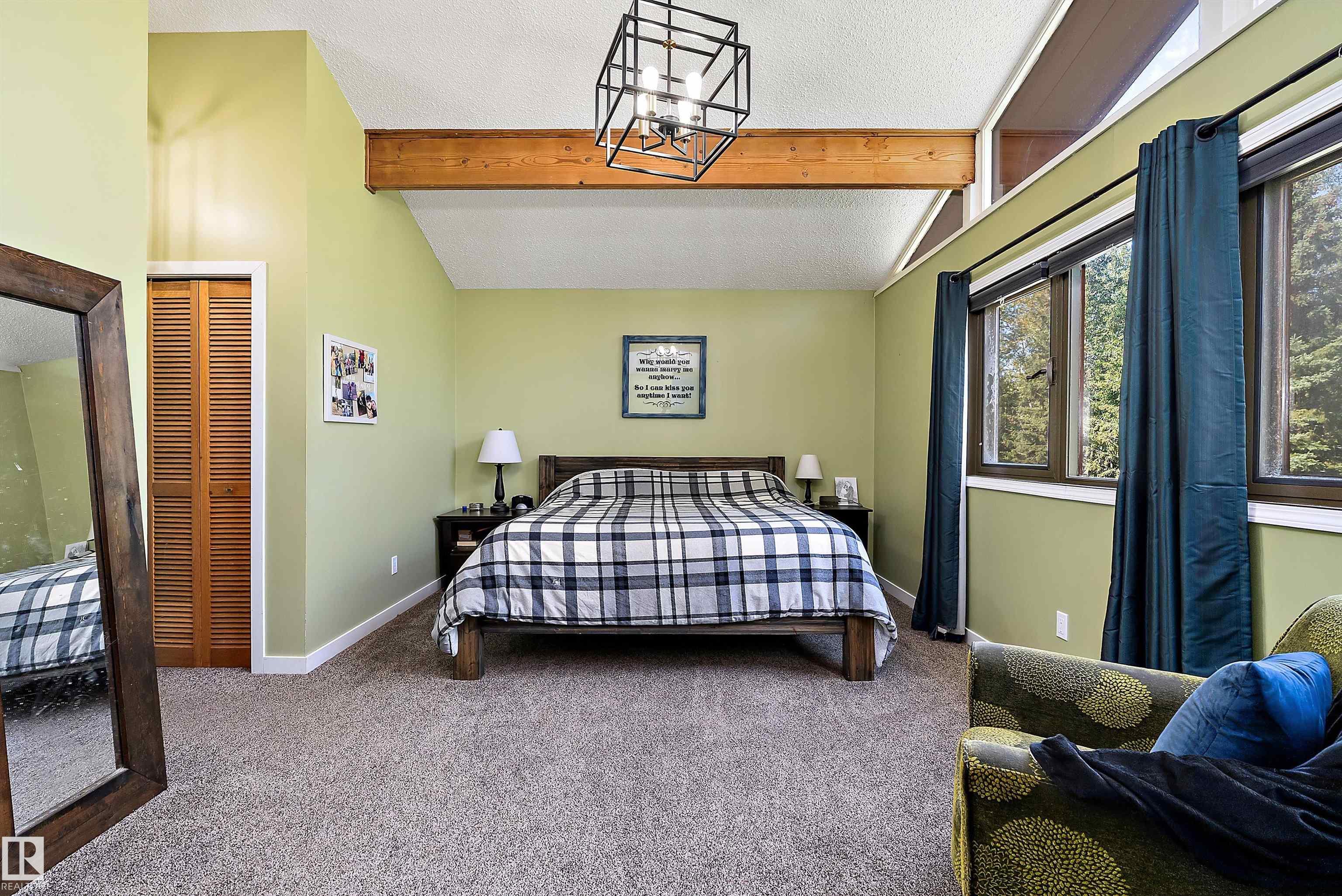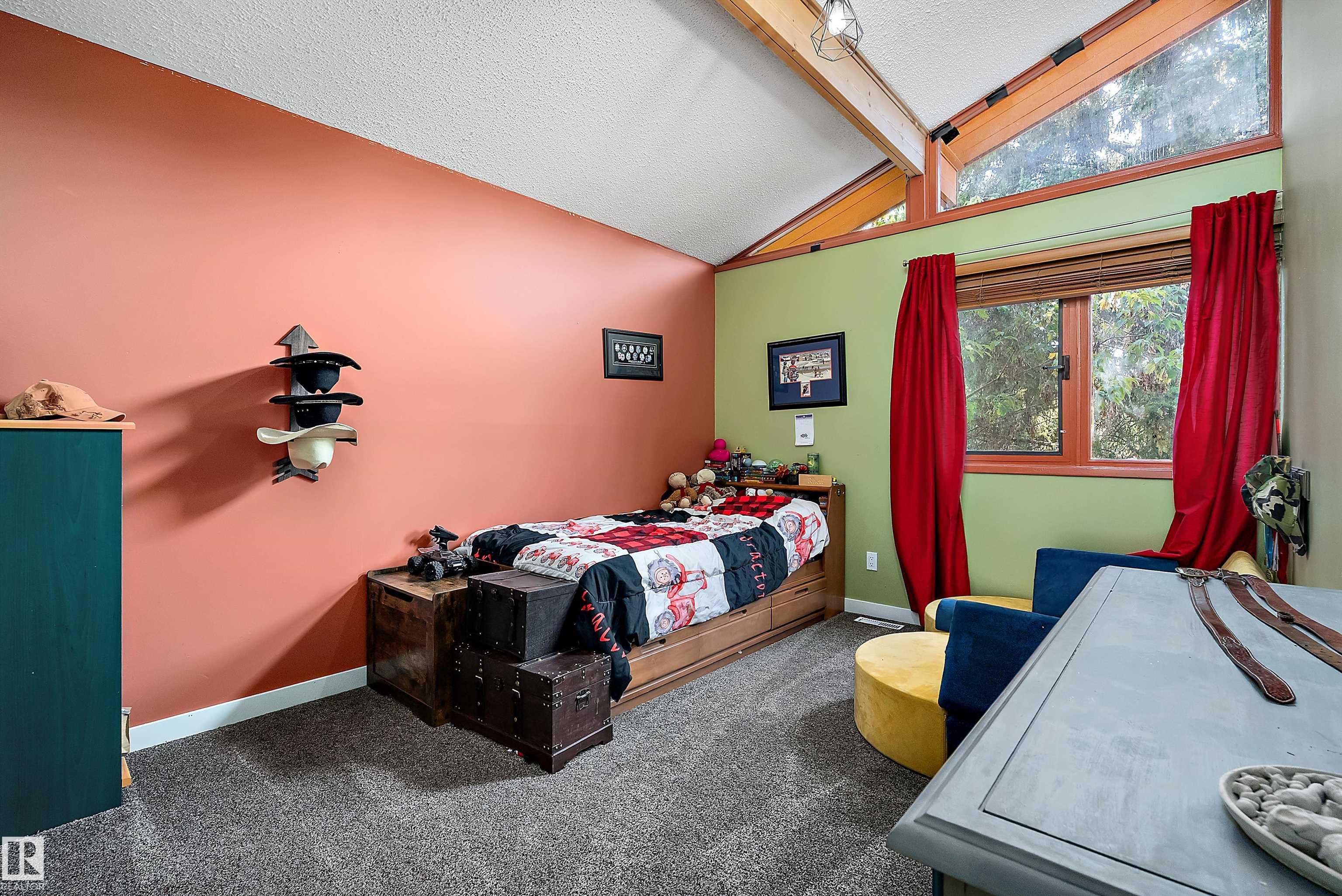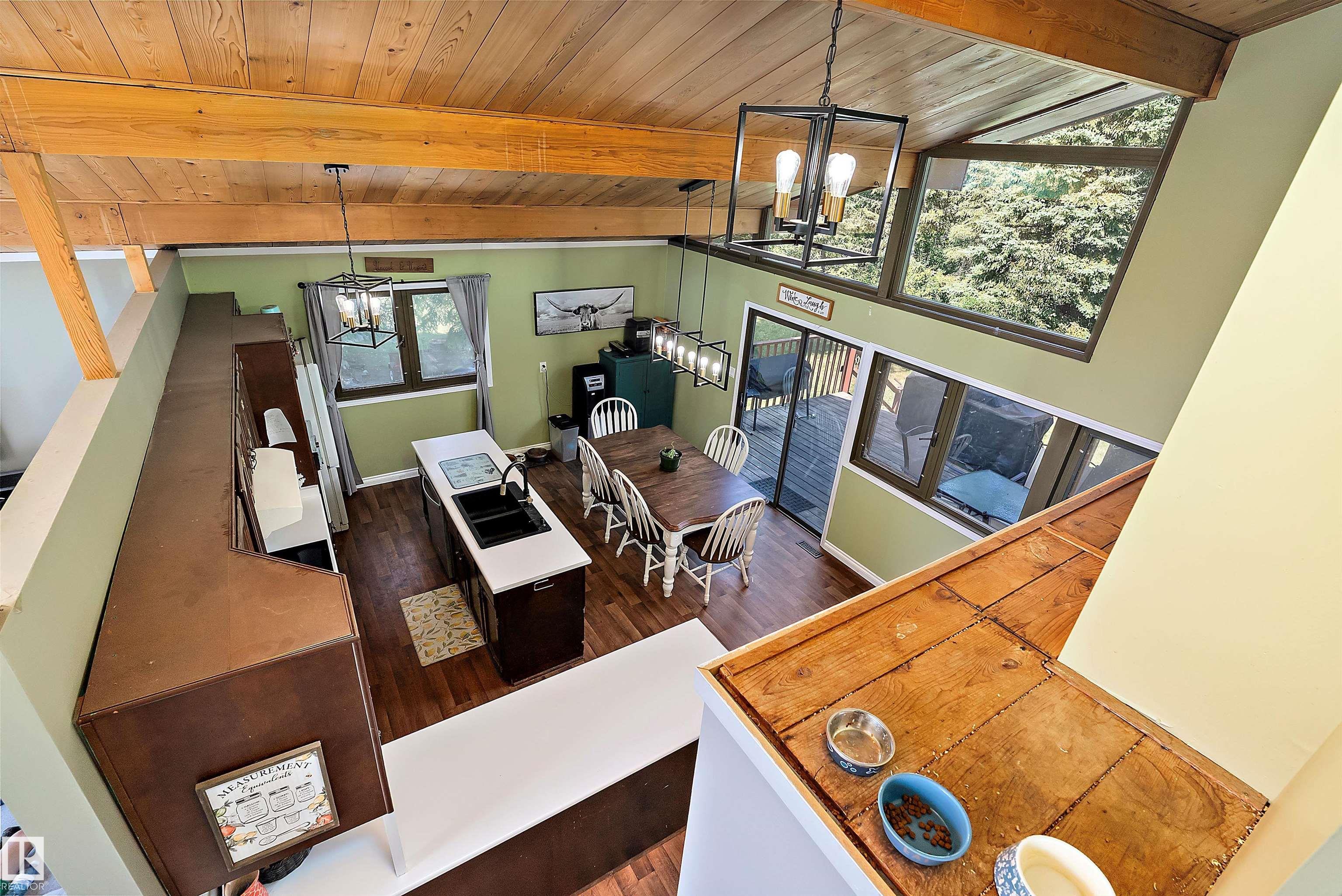 Minutes from town on paved roads, you'll find a private, tree lined driveway that leads you to this idyllic 3.4 acre acreage. It's a dreamy landscape of rolling hills & wide open spaces surrounded by trees. Inside you'll find over 2200 sq ft of finished living space with 5 huge bedrooms (4 up) and 3 baths. The home captivates with vaulted wood beam ceilings & soaring windows flooding the the living room in natural light, a sprawling kitchen with large island & a sunken cozy family room with gas fireplace. Shingles, both furnaces, hot water tank and 24x36' garage (with 8' doors & 10' ceilings & heater) were done in 2019. Induction cooktop in 2019, carpets 2020, AC in 2021, & dishwasher 2024. Zoned for stony plain school with bussing available & minutes to town - you can have the dream acreage without sacrificing convenience! If you've been waiting for a large home with room for everyone, character, most of 'the big stuff' done so you can unleash your creativity in cosmetic updates...welcome home!