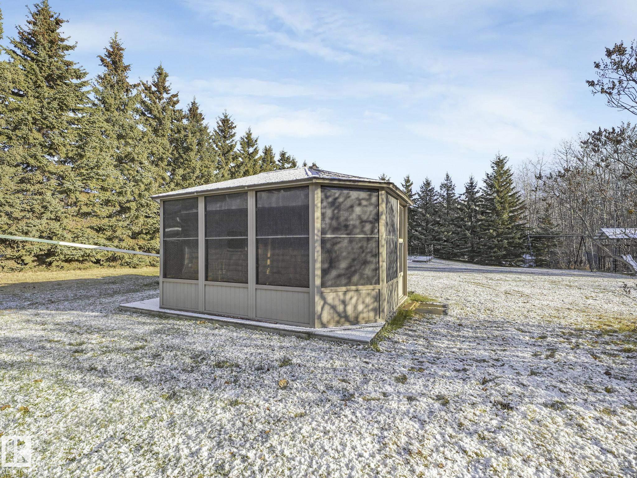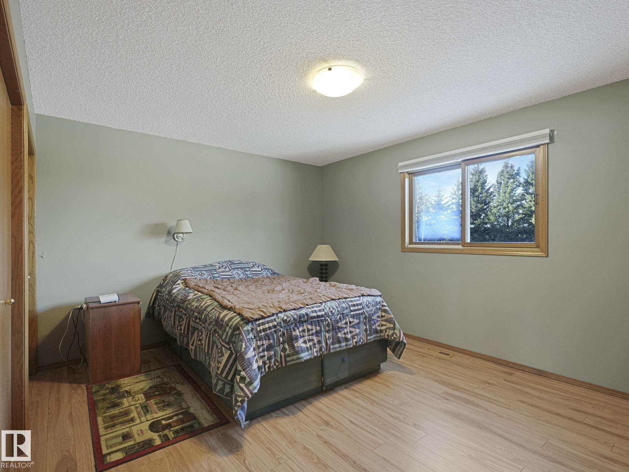 BEAUTIFUL PARK LIKE SETTING with 5 BEDROOM HOME on 1.57 ACRES backing onto reserve land minutes from Spruce Grove and Stony Plain. Many upgrades to the home including SHINGLES... FURNACE... HOT WATER TANK... AIR CONDITIONING... TRIPLE PANE GLASS in living room windows...PRESSURE TANK and GARAGE HEATER. PRICED $75,000 UNDER ASSESSED VALUE!!! Bright and spacious floor plan with large living room, kitchen, 3 spacious bedrooms on the main floor and 4 piece bath. The basement is fully finished with gas fireplace in the family room, 2 additional bedrooms, cold room and plenty of storage. The heated 28' x 28' garage has tons of room for parking, 220V wiring and work benches. The yard is stunning with large garden area, gazebo, mature spruce trees, apple tree, lilacs and allows for plenty of privacy. Perfect starter acreage with LAWN TRACTOR and QUAD INCLUDED!!! Playground across the street and close to MUIR LAKE School and CHICKAKOO LAKE in paved subdivision of HYCREST PLACE II. A MUST SEE!!!