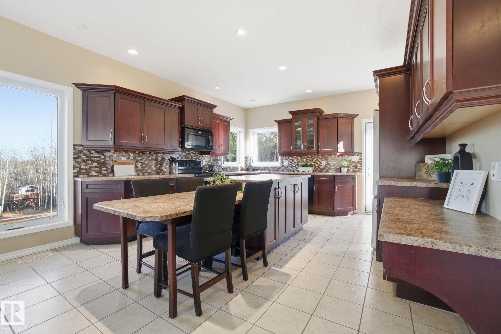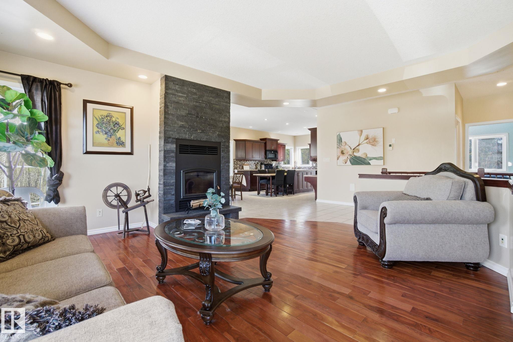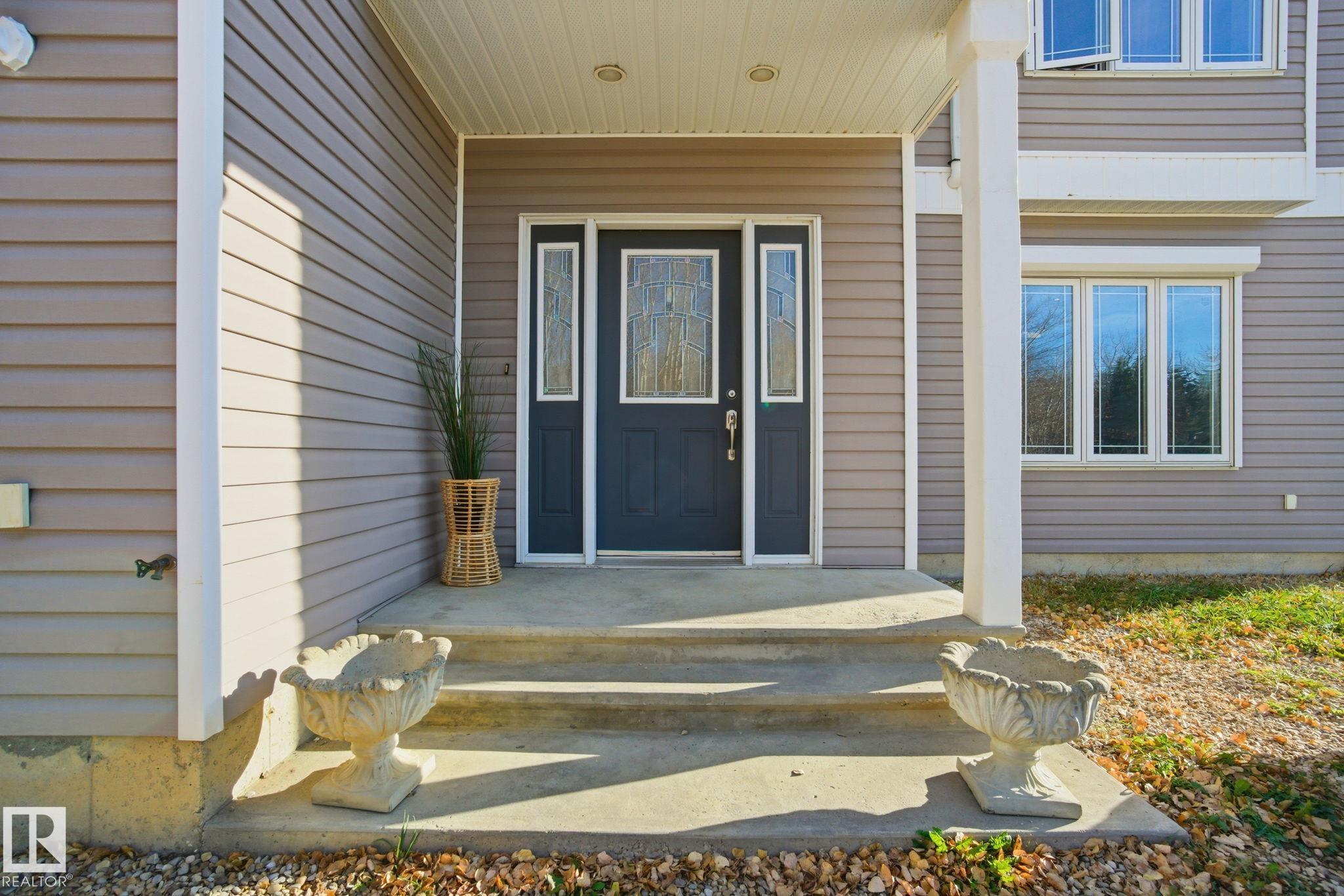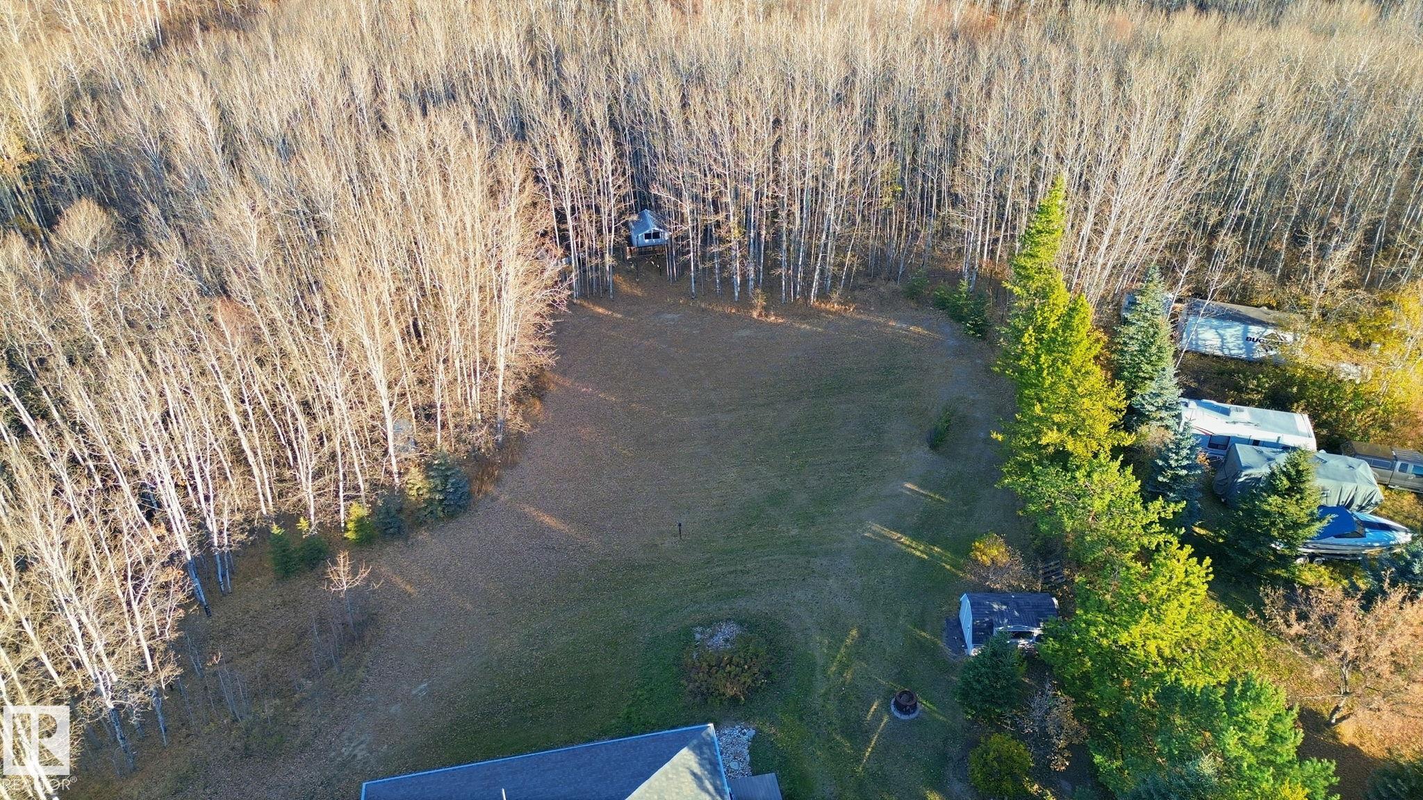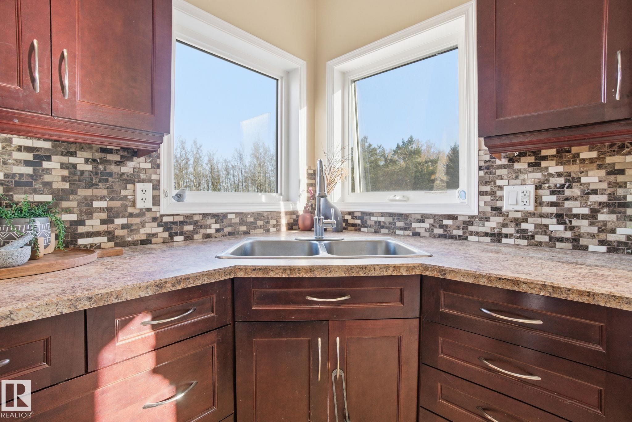 Gorgeous 3.5 acre property in Mayfair Heights 12 min from Stony Plain. 1650 sf bungalow with a walkout basement. Beautifully finished inside with 9' ceillings, hardwood floors & ceramic tile upstairs. The kitchen has dark cabinets, mosaic backsplash, big island with drop down seating area, tons of storage & counter space, walk-in pantry. A nice dining area adjacent surrounded by windows with views of the forest surrounding the property & rolling hills. The living room is a great size with a wood burning fireplace to cozy up over the winter. A massive wrap around deck is mostly covered, with vinyl & aluminum and glass railing. 3 bedrooms upstairs & 2 full baths. The primary has a large walk-in closet with built-in organizers & ensuite has soaking tub & shower! The basement is finished with a large media room, a 4th bedroom & unfinished 5th bedroom, 3rd full bath, storage, utilities & garage access. The grounds are beautiful with a hill leading down to the fire pit area, sheds & TREE HOUSE!