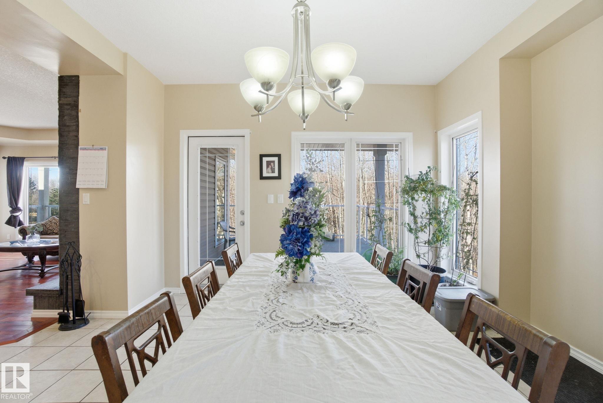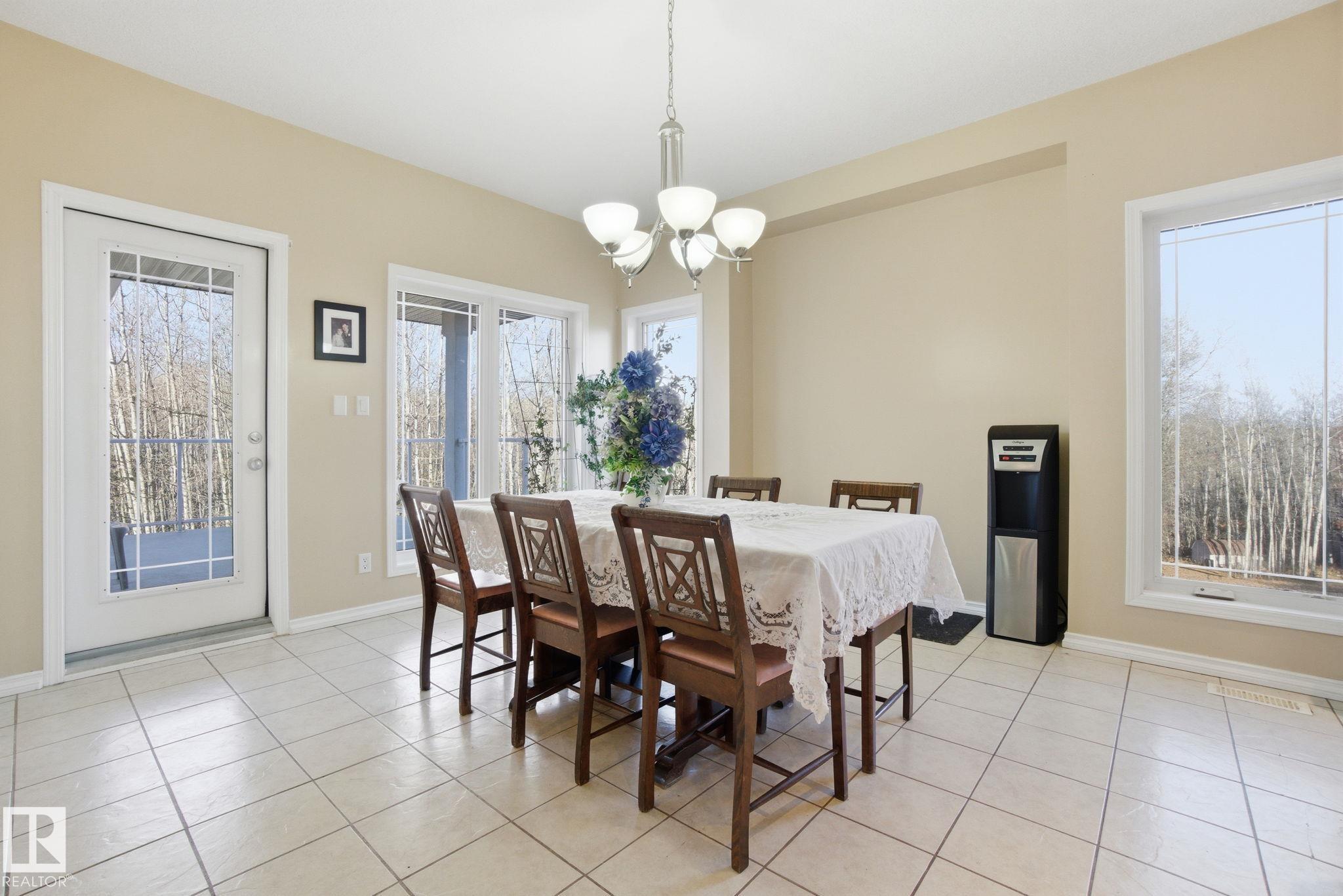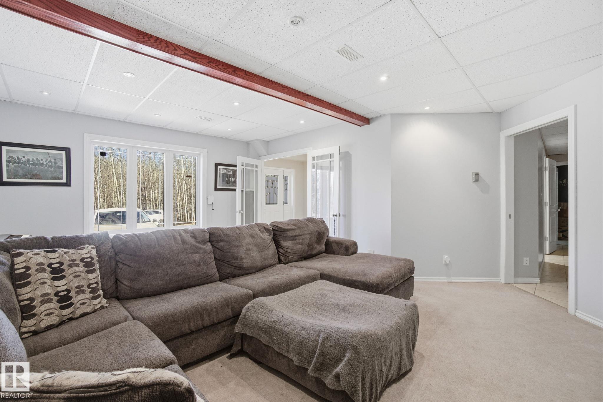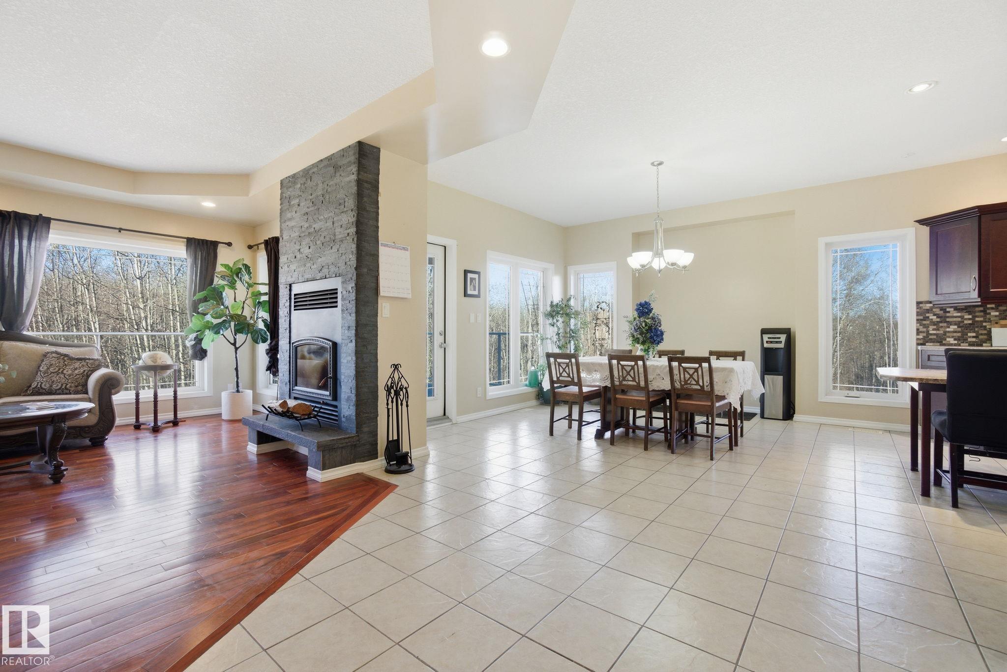 Gorgeous 3.5 acre property in Mayfair Heights 12 min from Stony Plain. 1650 sf bungalow with a walkout basement. Beautifully finished inside with 9' ceillings, hardwood floors & ceramic tile upstairs. The kitchen has dark cabinets, mosaic backsplash, big island with drop down seating area, tons of storage & counter space, walk-in pantry. A nice dining area adjacent surrounded by windows with views of the forest surrounding the property & rolling hills. The living room is a great size with a wood burning fireplace to cozy up over the winter. A massive wrap around deck is mostly covered, with vinyl & aluminum and glass railing. 3 bedrooms upstairs & 2 full baths. The primary has a large walk-in closet with built-in organizers & ensuite has soaking tub & shower! The basement is finished with a large media room, a 4th bedroom & unfinished 5th bedroom, 3rd full bath, storage, utilities & garage access. The grounds are beautiful with a hill leading down to the fire pit area, sheds & TREE HOUSE!