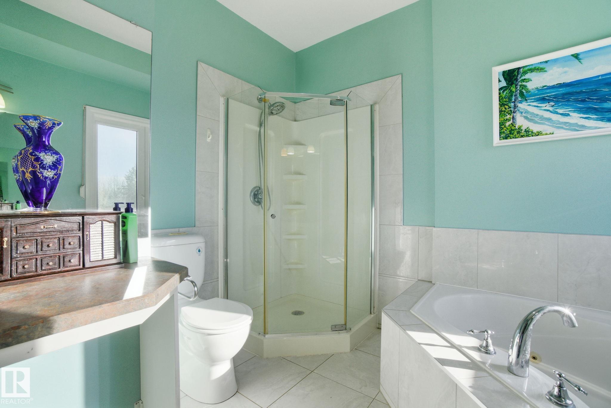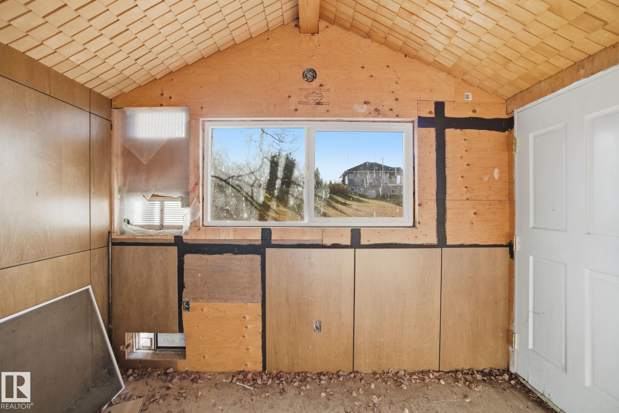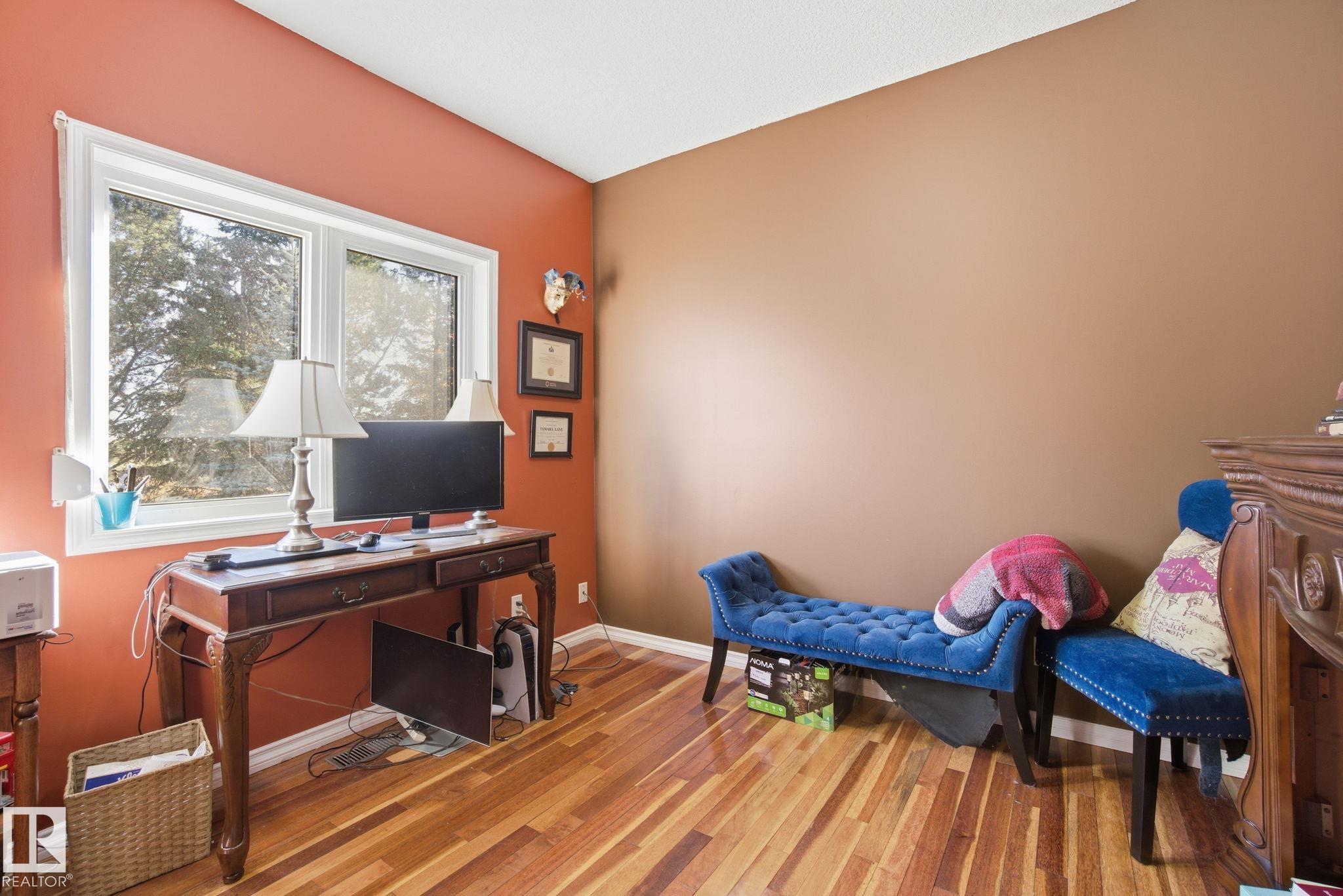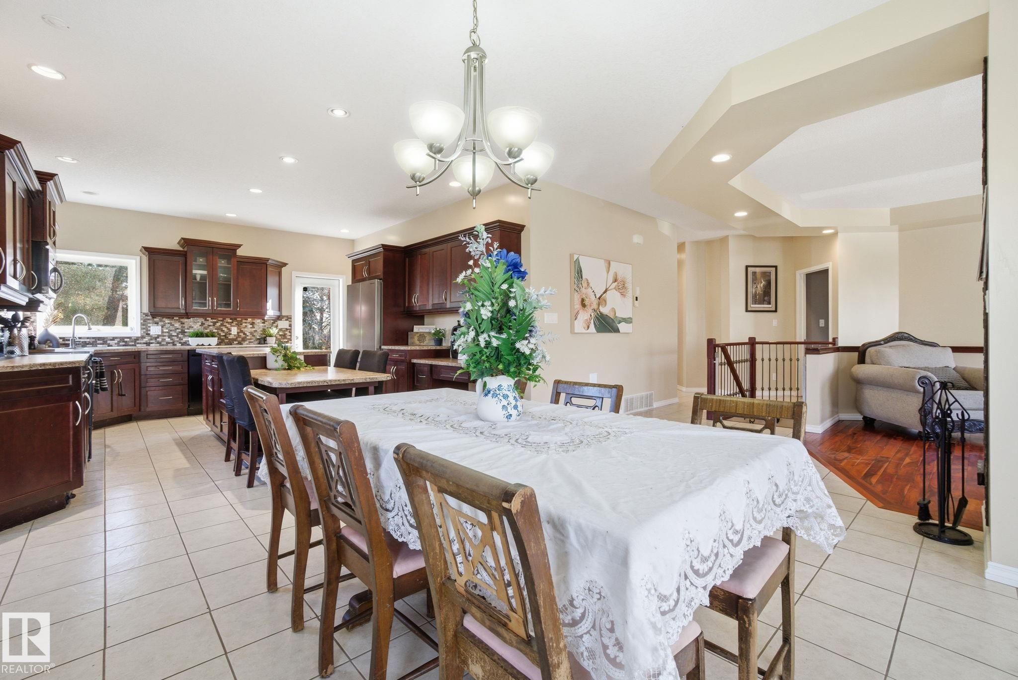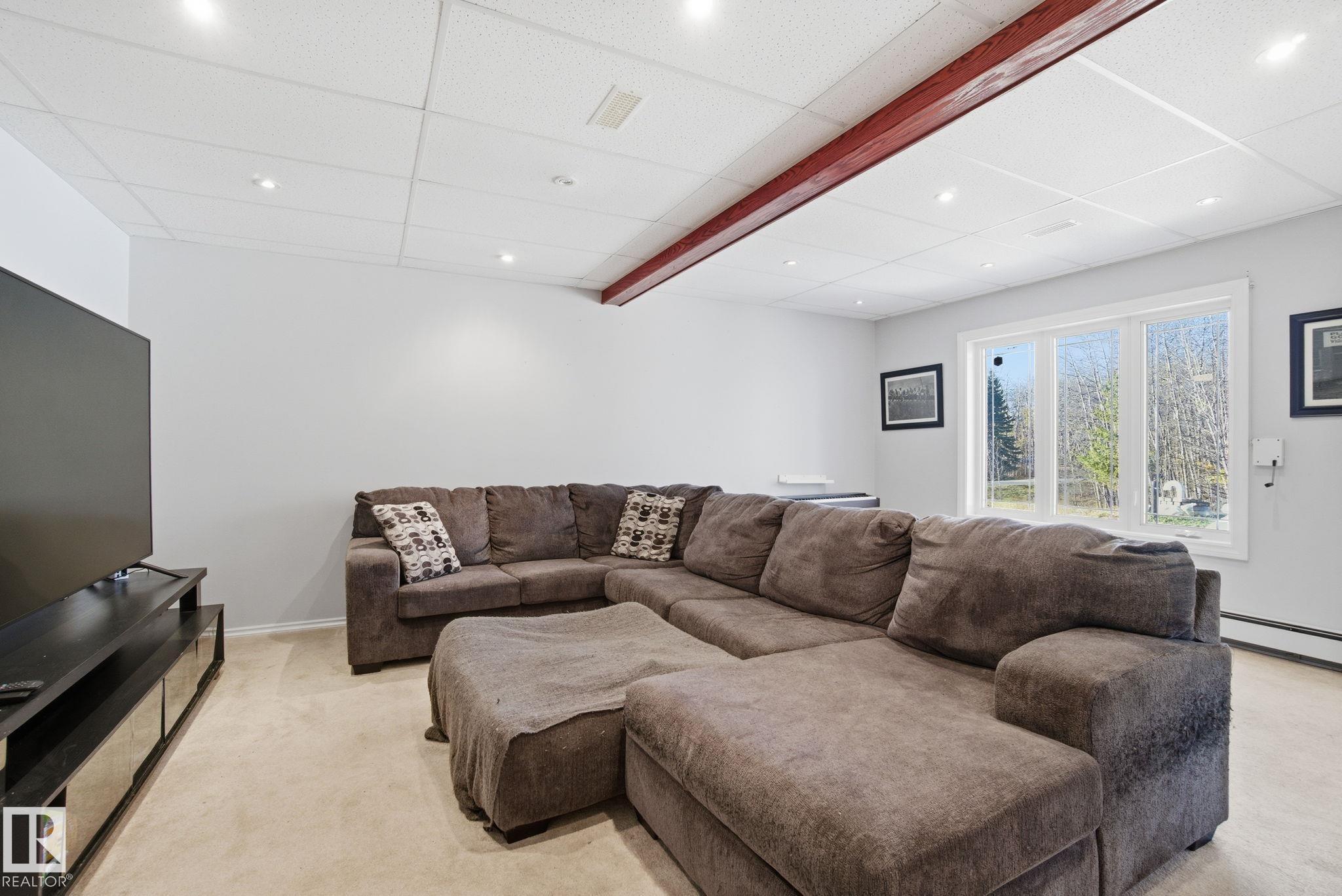 Gorgeous 3.5 acre property in Mayfair Heights 12 min from Stony Plain. 1650 sf bungalow with a walkout basement. Beautifully finished inside with 9' ceillings, hardwood floors & ceramic tile upstairs. The kitchen has dark cabinets, mosaic backsplash, big island with drop down seating area, tons of storage & counter space, walk-in pantry. A nice dining area adjacent surrounded by windows with views of the forest surrounding the property & rolling hills. The living room is a great size with a wood burning fireplace to cozy up over the winter. A massive wrap around deck is mostly covered, with vinyl & aluminum and glass railing. 3 bedrooms upstairs & 2 full baths. The primary has a large walk-in closet with built-in organizers & ensuite has soaking tub & shower! The basement is finished with a large media room, a 4th bedroom & unfinished 5th bedroom, 3rd full bath, storage, utilities & garage access. The grounds are beautiful with a hill leading down to the fire pit area, sheds & TREE HOUSE!
