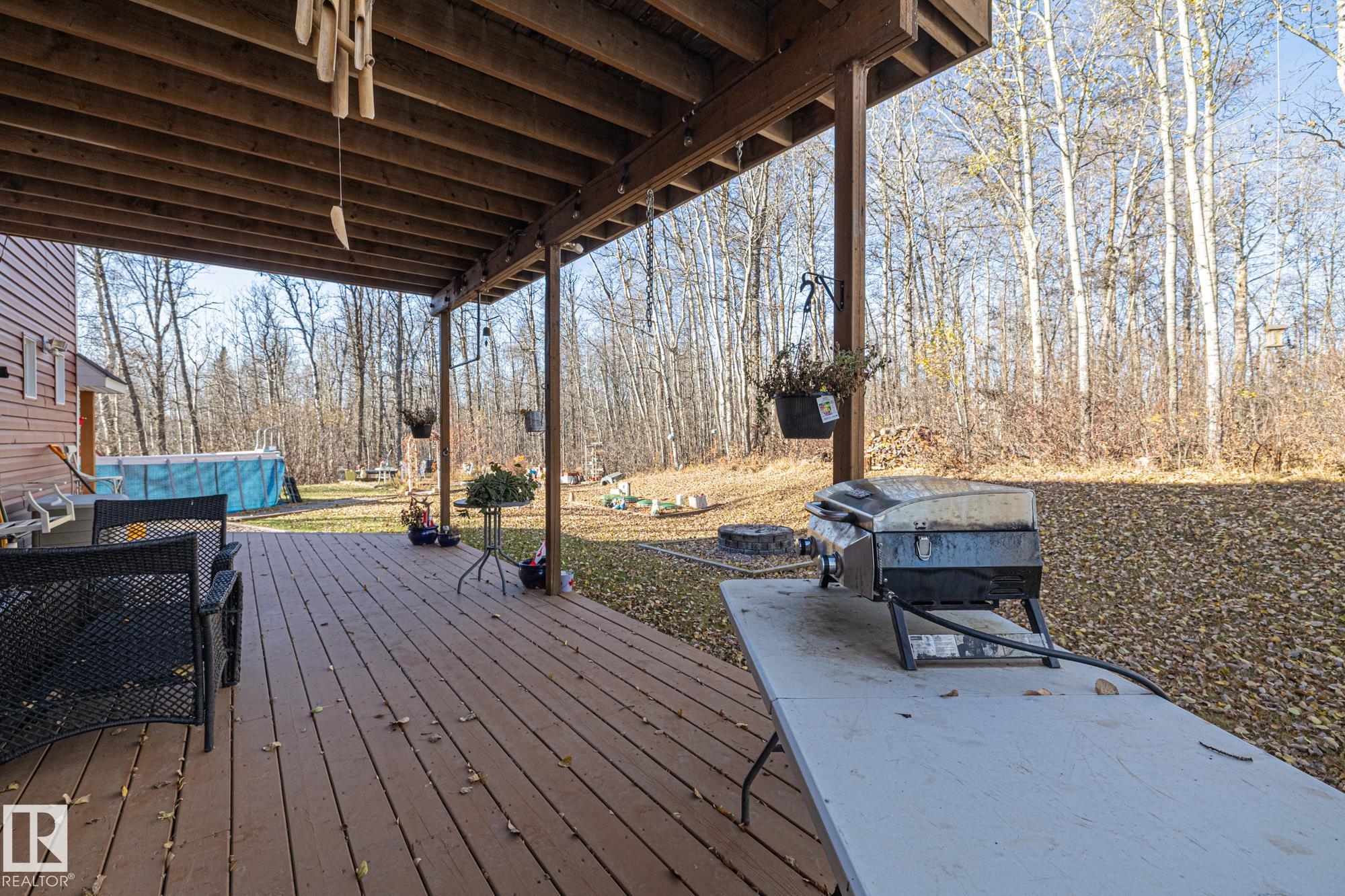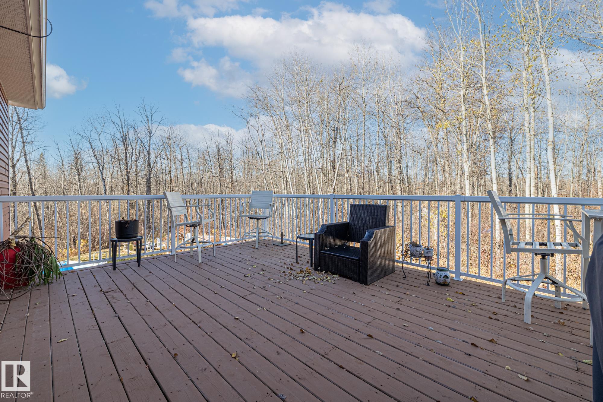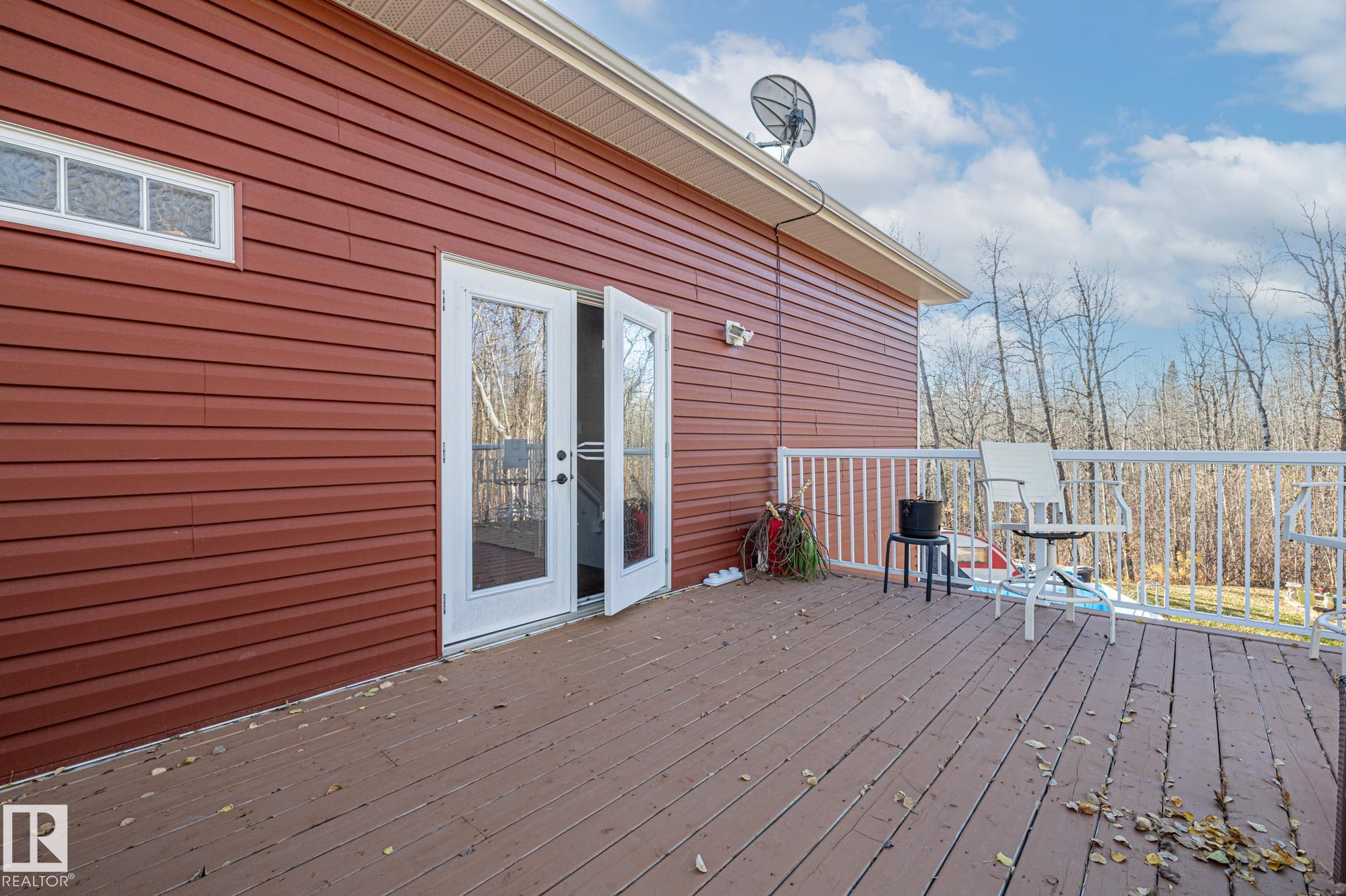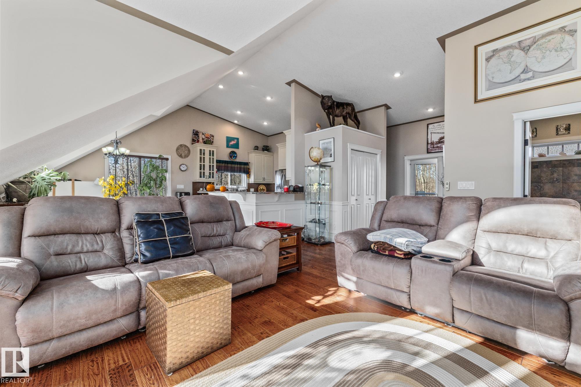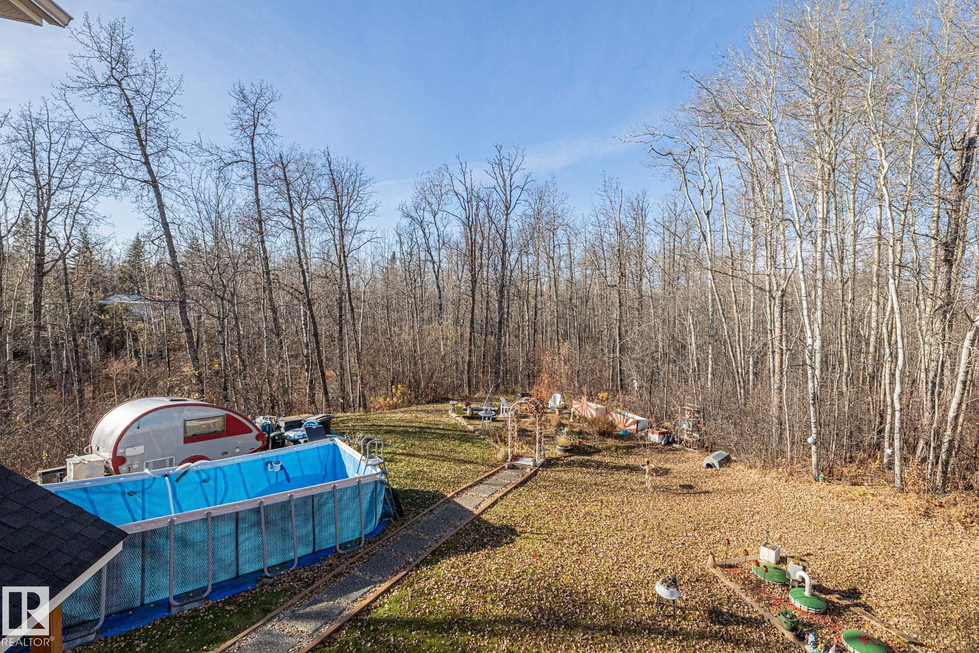 Experience peaceful country living in Meso West, just north of Hwy 16 at RR30--only 10 minutes to Stony Plain and less than 3 km from Cougar Creek Golf Course. Set high on a private, treed lot with ravine views, this 2011 custom-built home is ideal for those seeking space, privacy, and room for vehicles, toys, and projects. The highlight is the heated triple garage with in-floor heat, finished interior, and a full bath--perfect for a serious garage setup, workshop, or hobby space. The upper level features a bright 2-bedroom living area with engineered flooring, vaulted ceilings, and an open-concept layout. The custom country kitchen includes stainless steel appliances and a pantry, flowing into a comfortable living space with in-floor heating and central A/C. Step onto the private upper deck and enjoy the natural surroundings, or unwind outside with an above-ground pool in a quiet country setting. Fully serviced with a drilled well and septic filtration system. A well-kept property with no smoking or pets