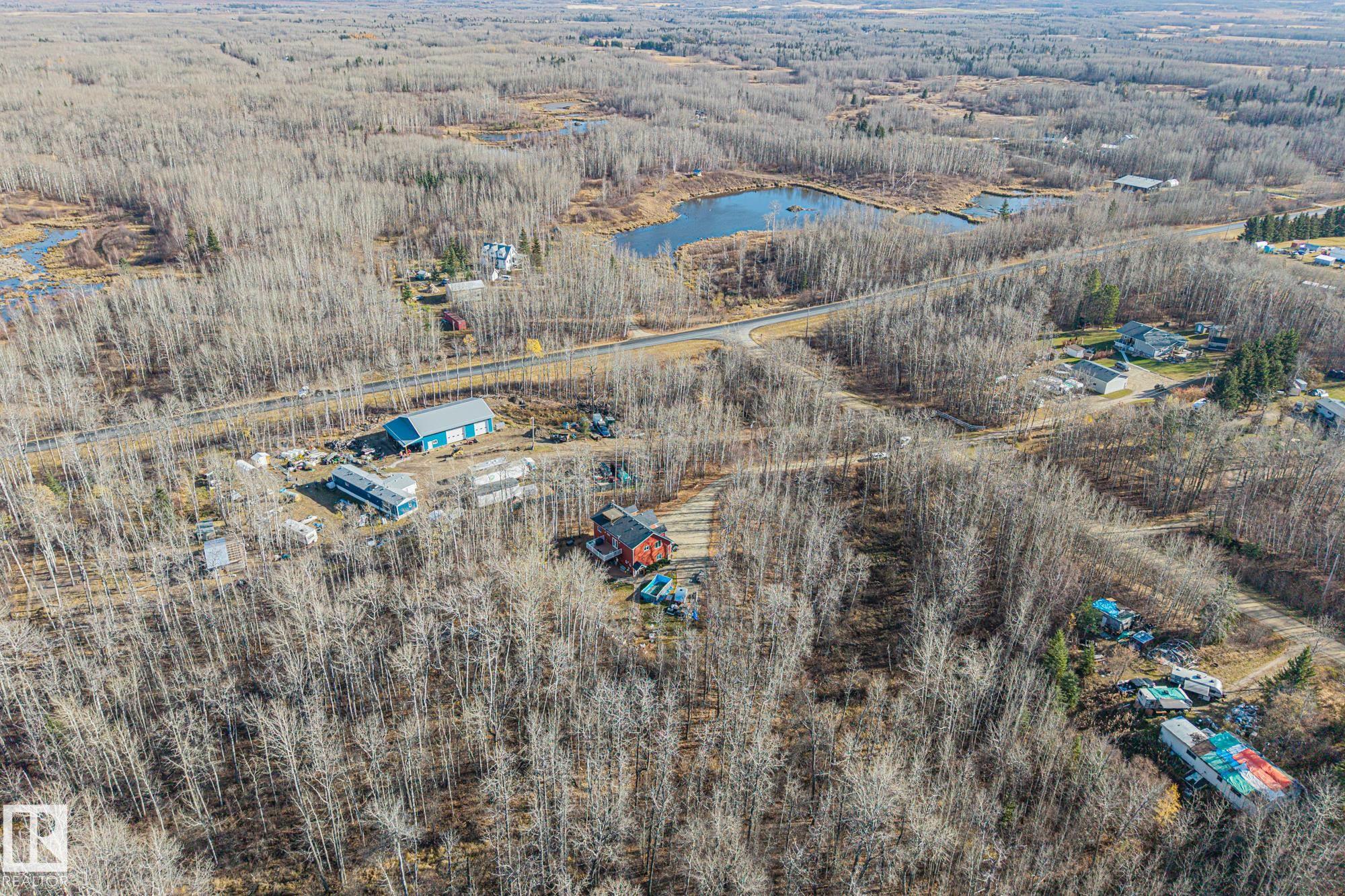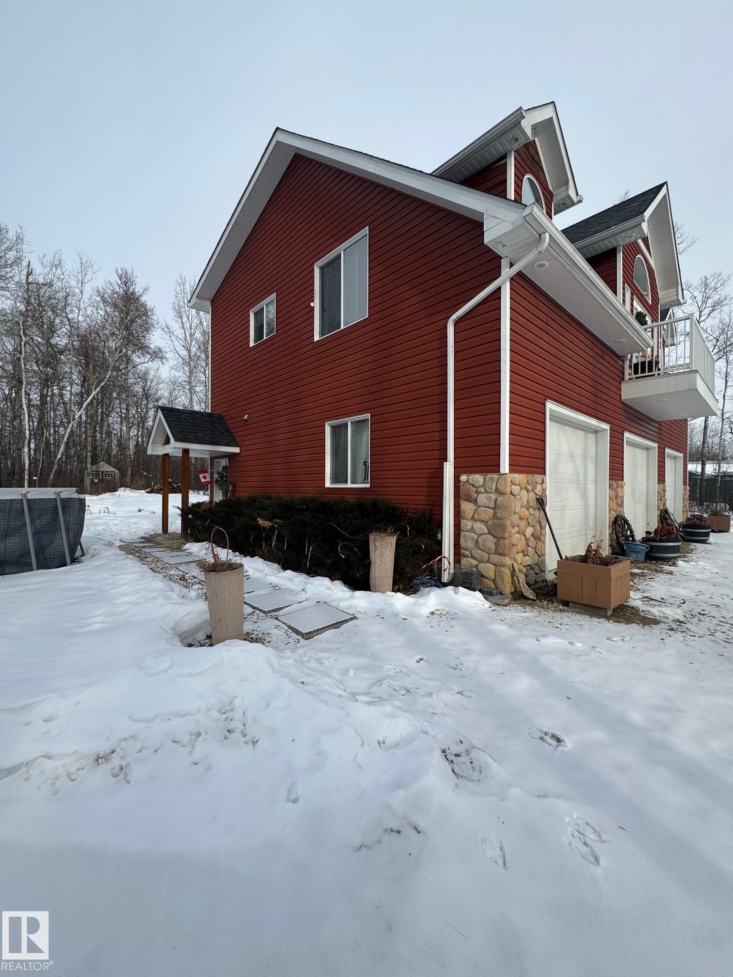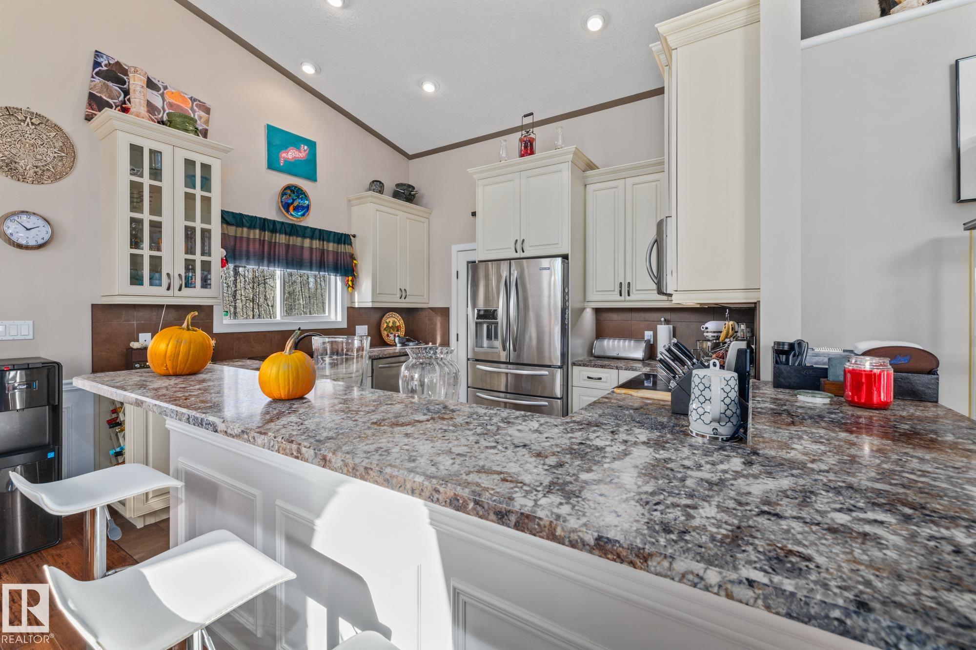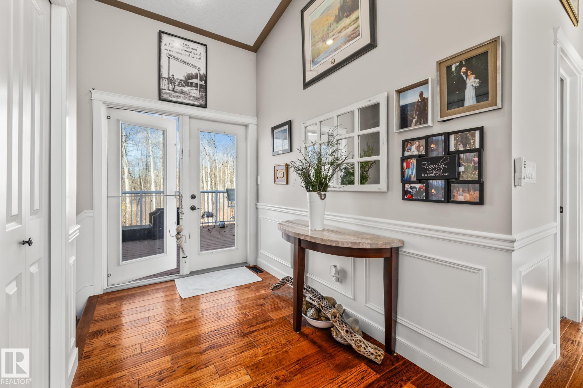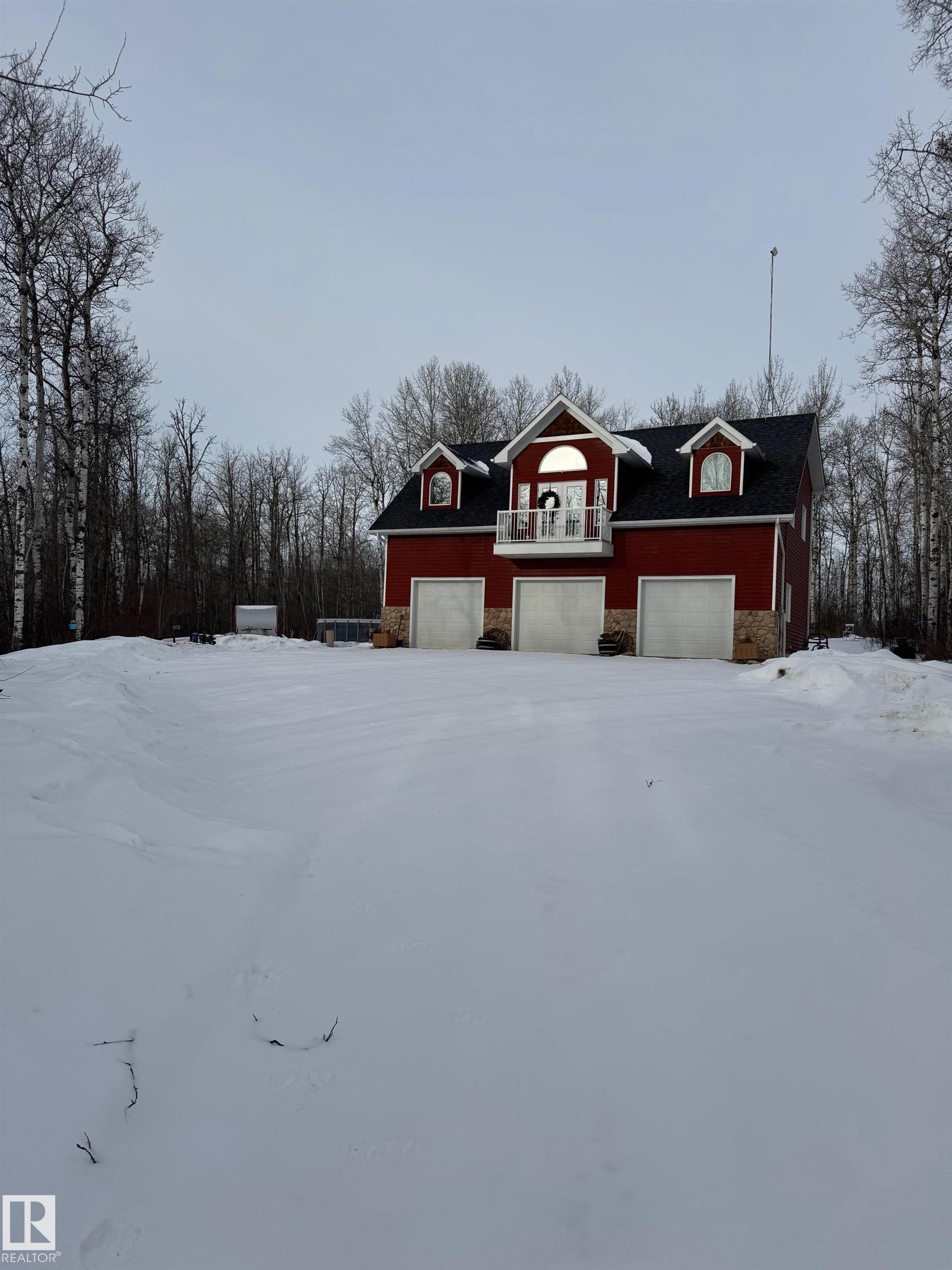 Experience peaceful country living in Meso West, just north of Hwy 16 at RR30--only 10 minutes to Stony Plain and less than 3 km from Cougar Creek Golf Course. Set high on a private, treed lot with ravine views, this 2011 custom-built home is ideal for those seeking space, privacy, and room for vehicles, toys, and projects. The highlight is the heated triple garage with in-floor heat, finished interior, and a full bath--perfect for a serious garage setup, workshop, or hobby space. The upper level features a bright 2-bedroom living area with engineered flooring, vaulted ceilings, and an open-concept layout. The custom country kitchen includes stainless steel appliances and a pantry, flowing into a comfortable living space with in-floor heating and central A/C. Step onto the private upper deck and enjoy the natural surroundings, or unwind outside with an above-ground pool in a quiet country setting. Fully serviced with a drilled well and septic filtration system. A well-kept property with no smoking or pets