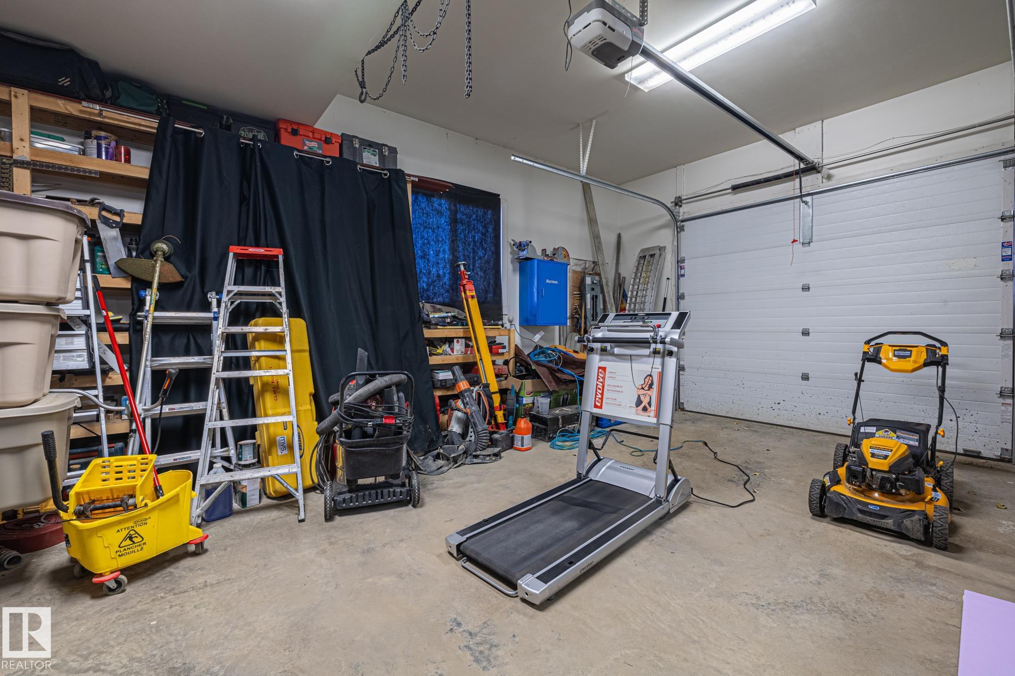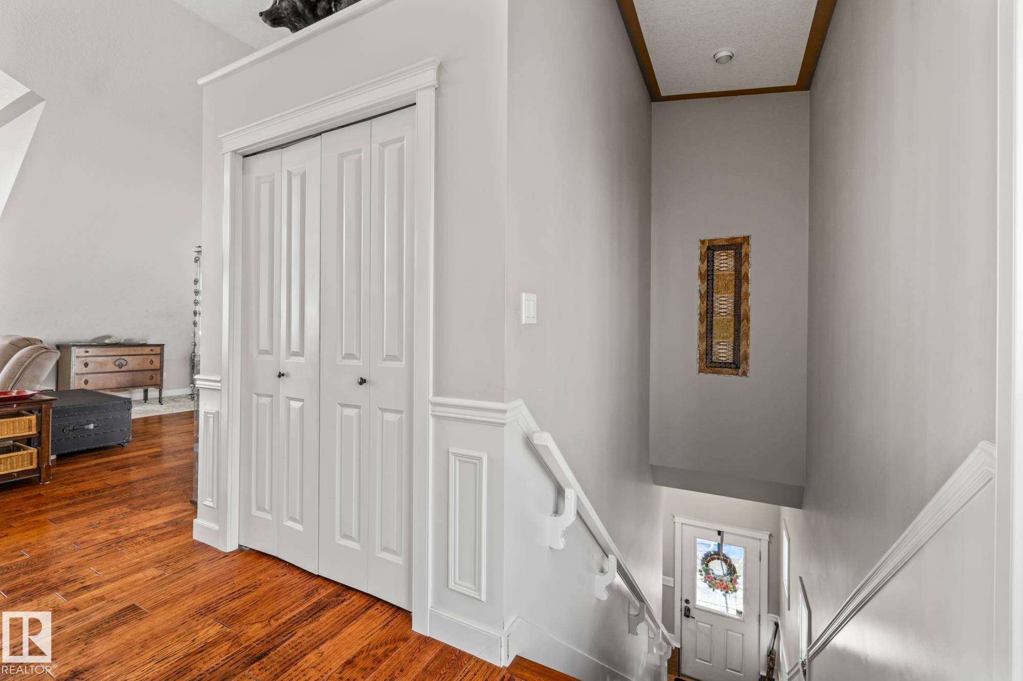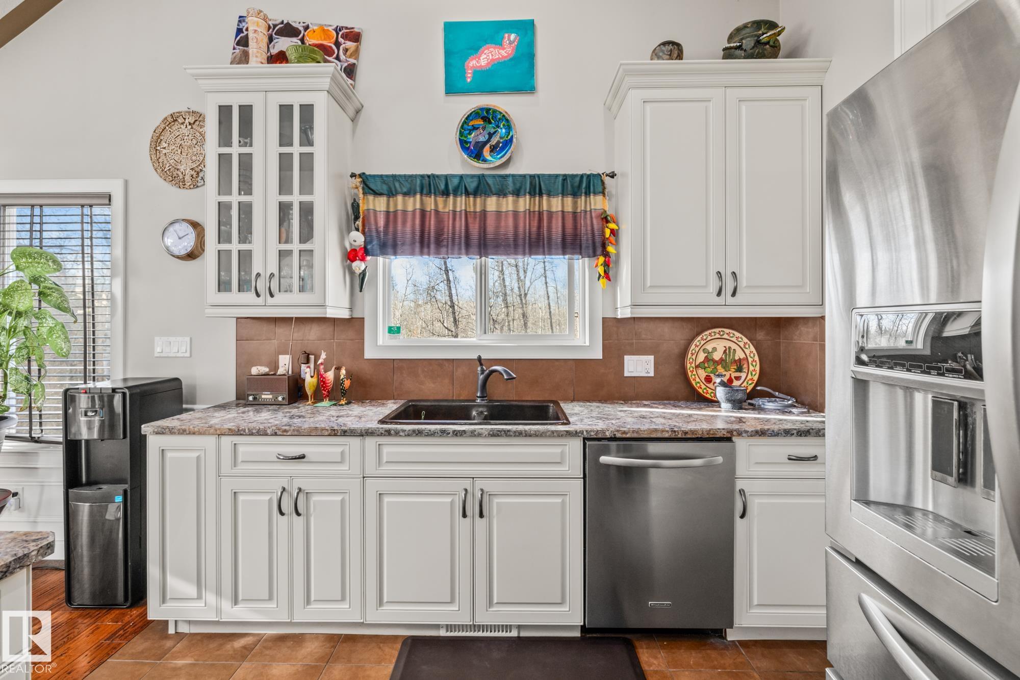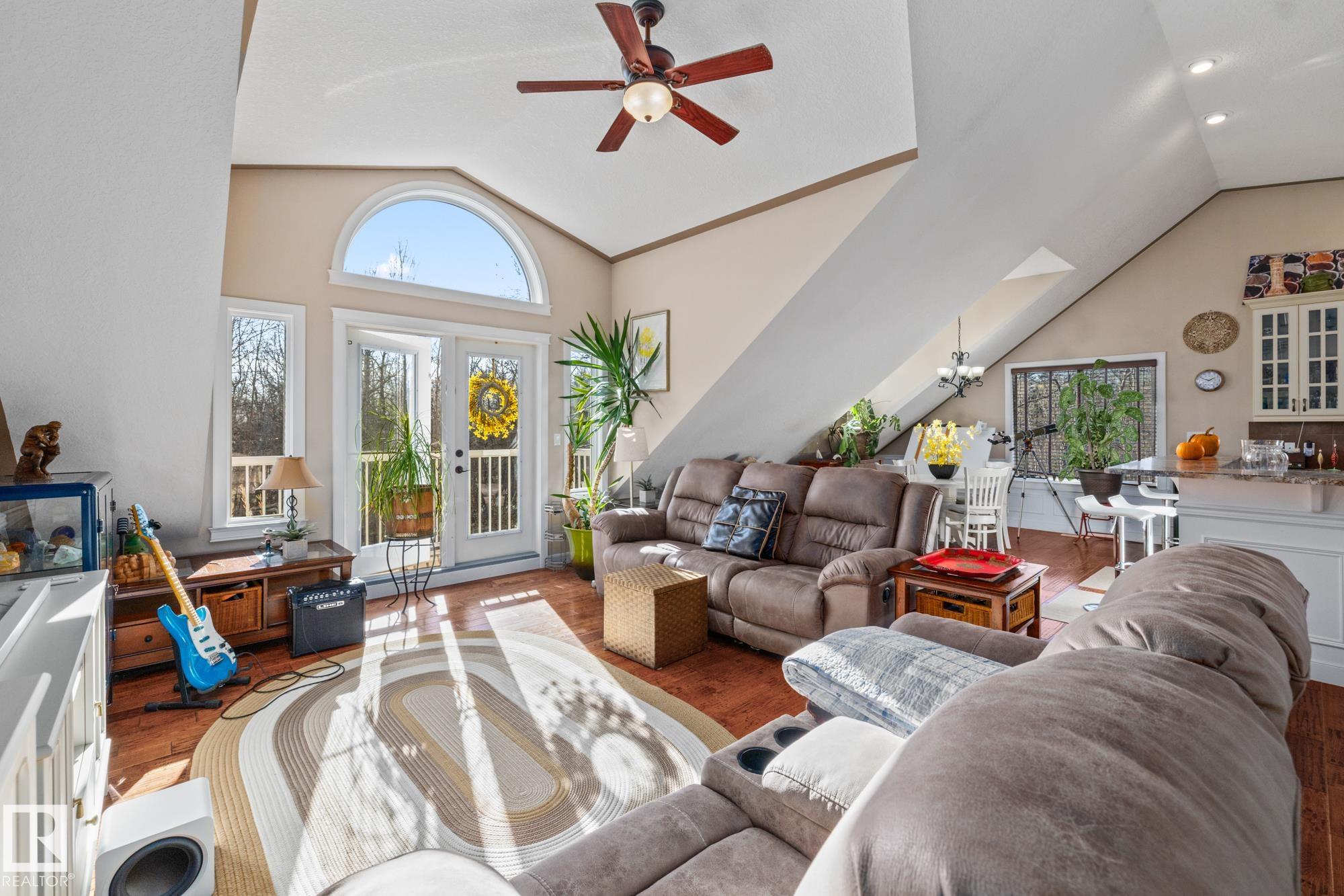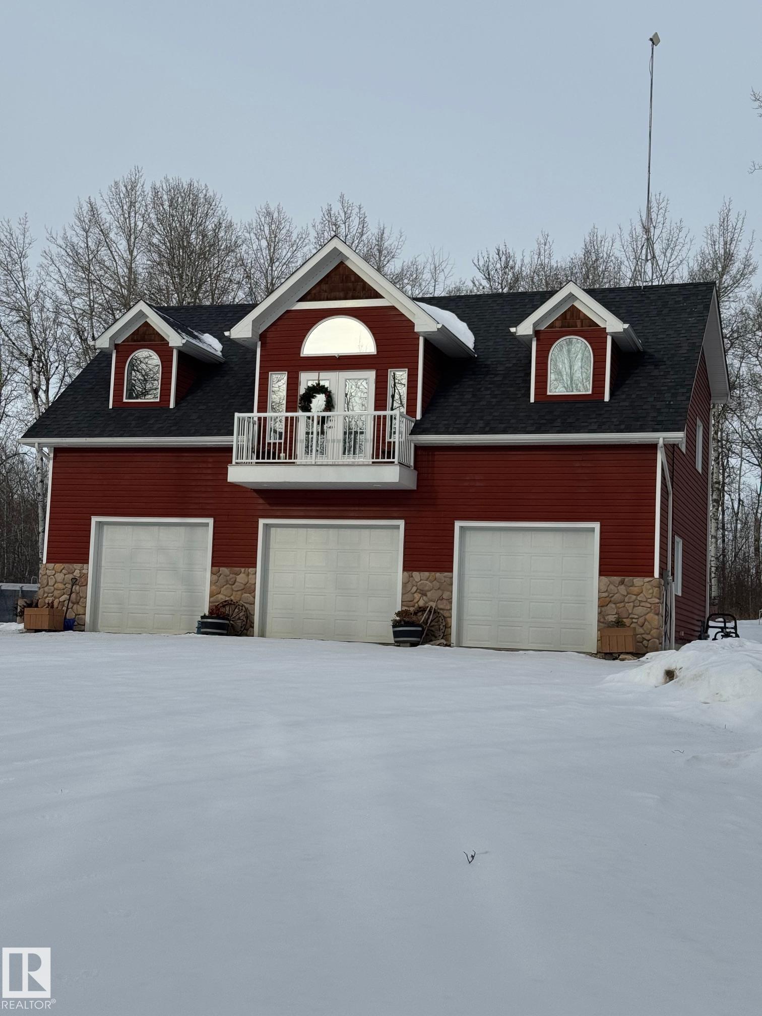Experience peaceful country living in Meso West, just north of Hwy 16 at RR30--only 10 minutes to Stony Plain and less than 3 km from Cougar Creek Golf Course. Set high on a private, treed lot with ravine views, this 2011 custom-built home is ideal for those seeking space, privacy, and room for vehicles, toys, and projects. The highlight is the heated triple garage with in-floor heat, finished interior, and a full bath--perfect for a serious garage setup, workshop, or hobby space. The upper level features a bright 2-bedroom living area with engineered flooring, vaulted ceilings, and an open-concept layout. The custom country kitchen includes stainless steel appliances and a pantry, flowing into a comfortable living space with in-floor heating and central A/C. Step onto the private upper deck and enjoy the natural surroundings, or unwind outside with an above-ground pool in a quiet country setting. Fully serviced with a drilled well and septic filtration system. A well-kept property with no smoking or pets