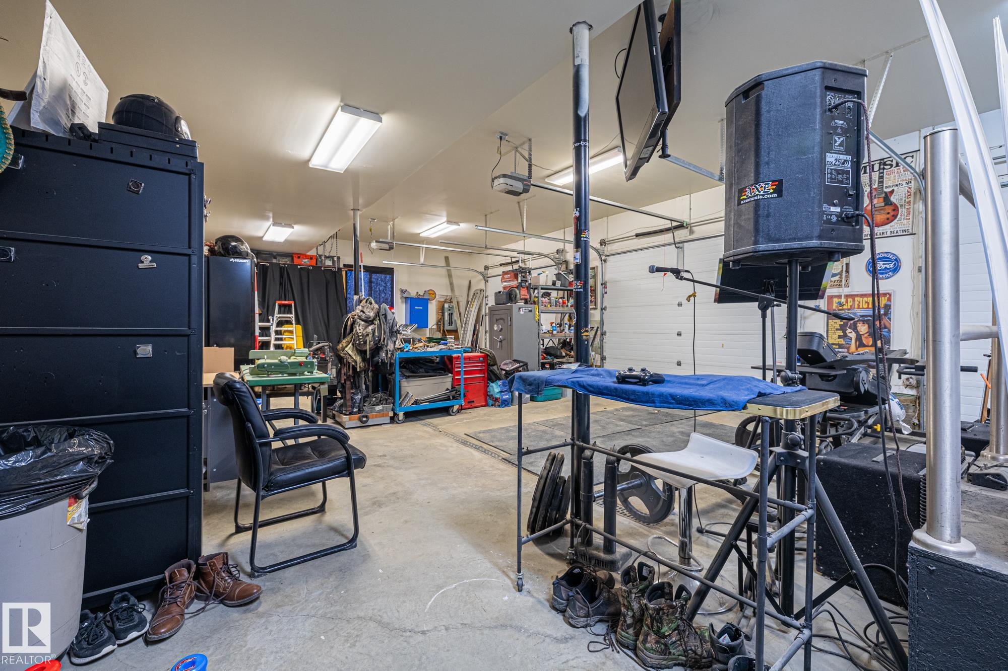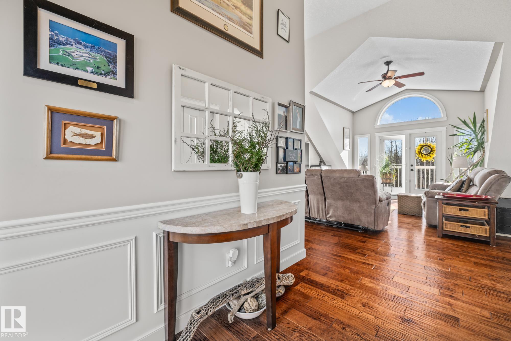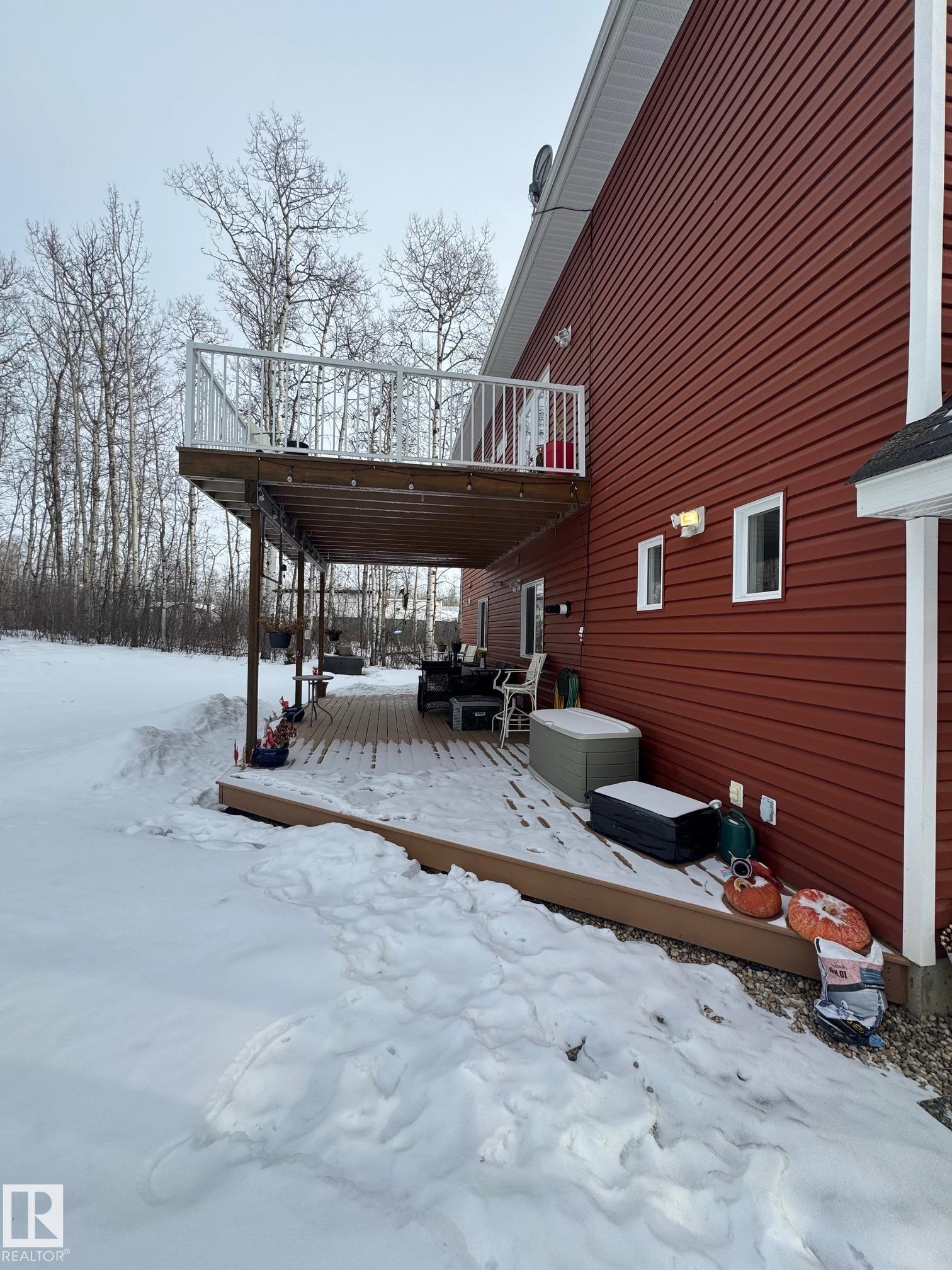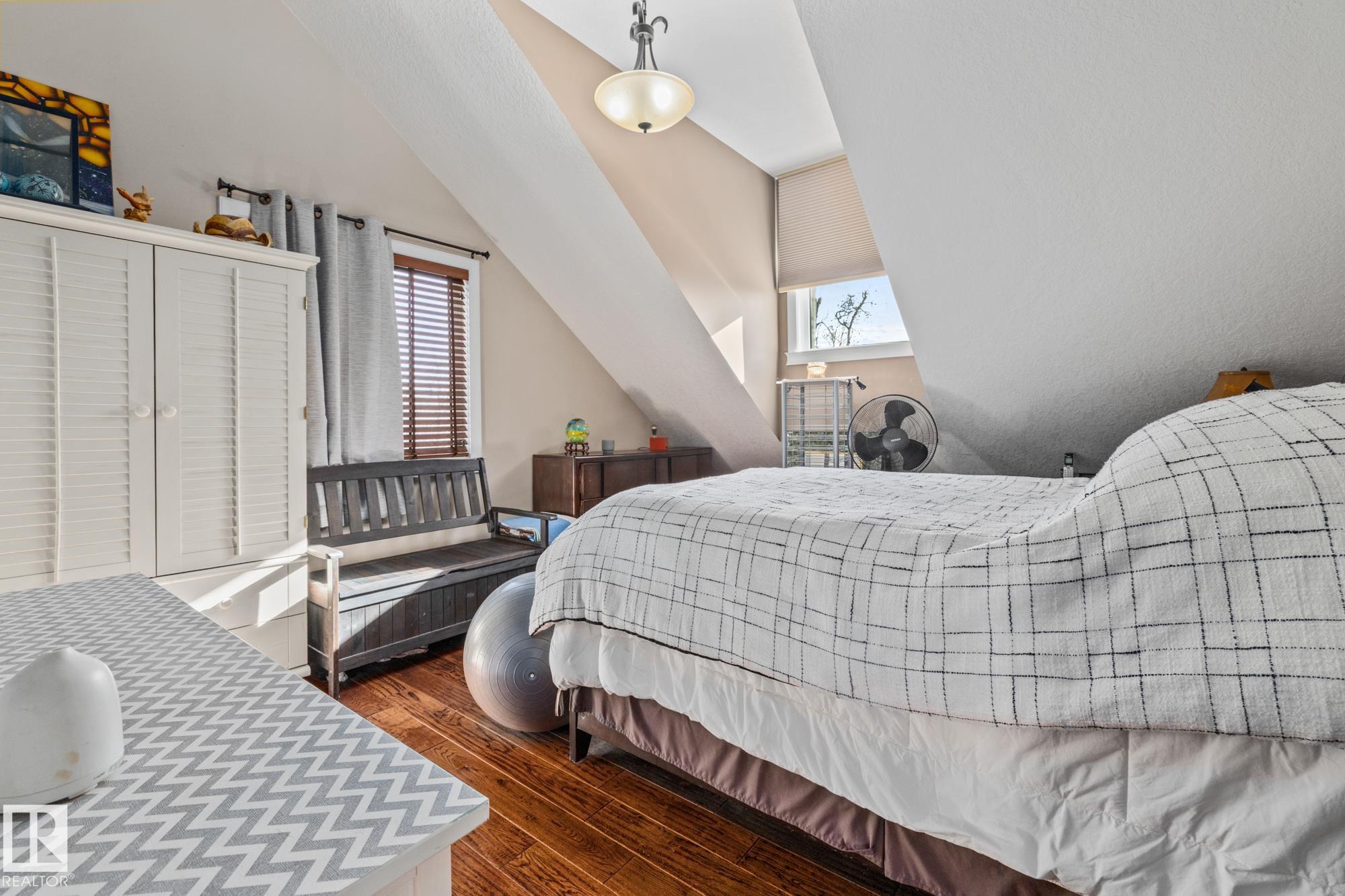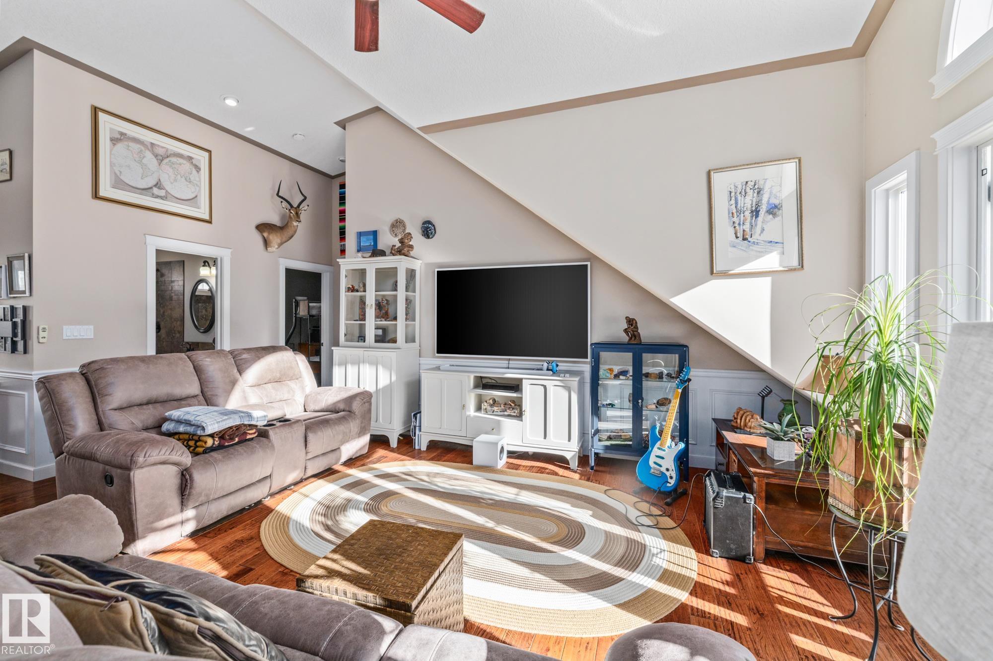 Experience peaceful country living in Meso West, just north of Hwy 16 at RR30--only 10 minutes to Stony Plain and less than 3 km from Cougar Creek Golf Course. Set high on a private, treed lot with ravine views, this 2011 custom-built home is ideal for those seeking space, privacy, and room for vehicles, toys, and projects. The highlight is the heated triple garage with in-floor heat, finished interior, and a full bath--perfect for a serious garage setup, workshop, or hobby space. The upper level features a bright 2-bedroom living area with engineered flooring, vaulted ceilings, and an open-concept layout. The custom country kitchen includes stainless steel appliances and a pantry, flowing into a comfortable living space with in-floor heating and central A/C. Step onto the private upper deck and enjoy the natural surroundings, or unwind outside with an above-ground pool in a quiet country setting. Fully serviced with a drilled well and septic filtration system. A well-kept property with no smoking or pets