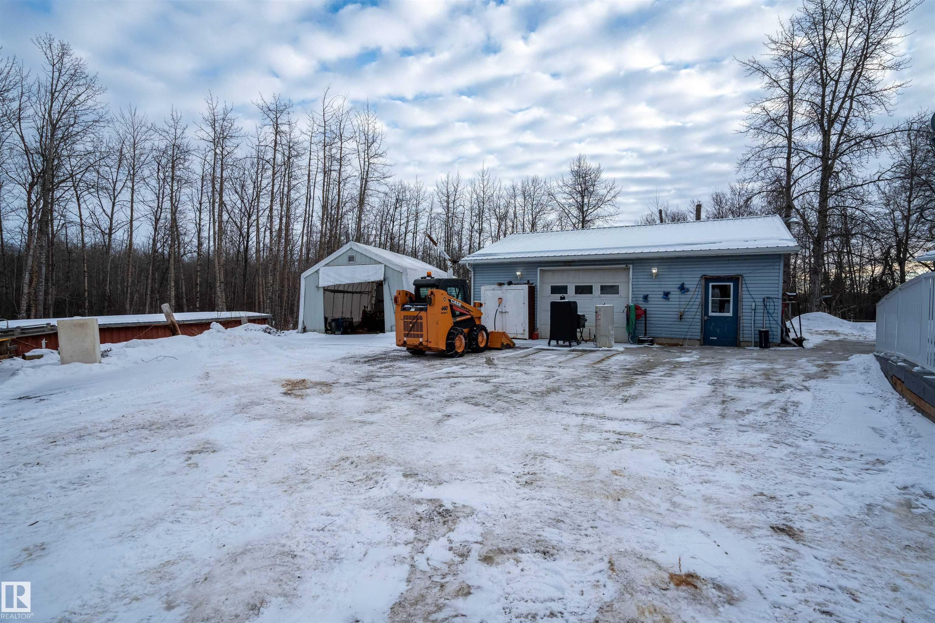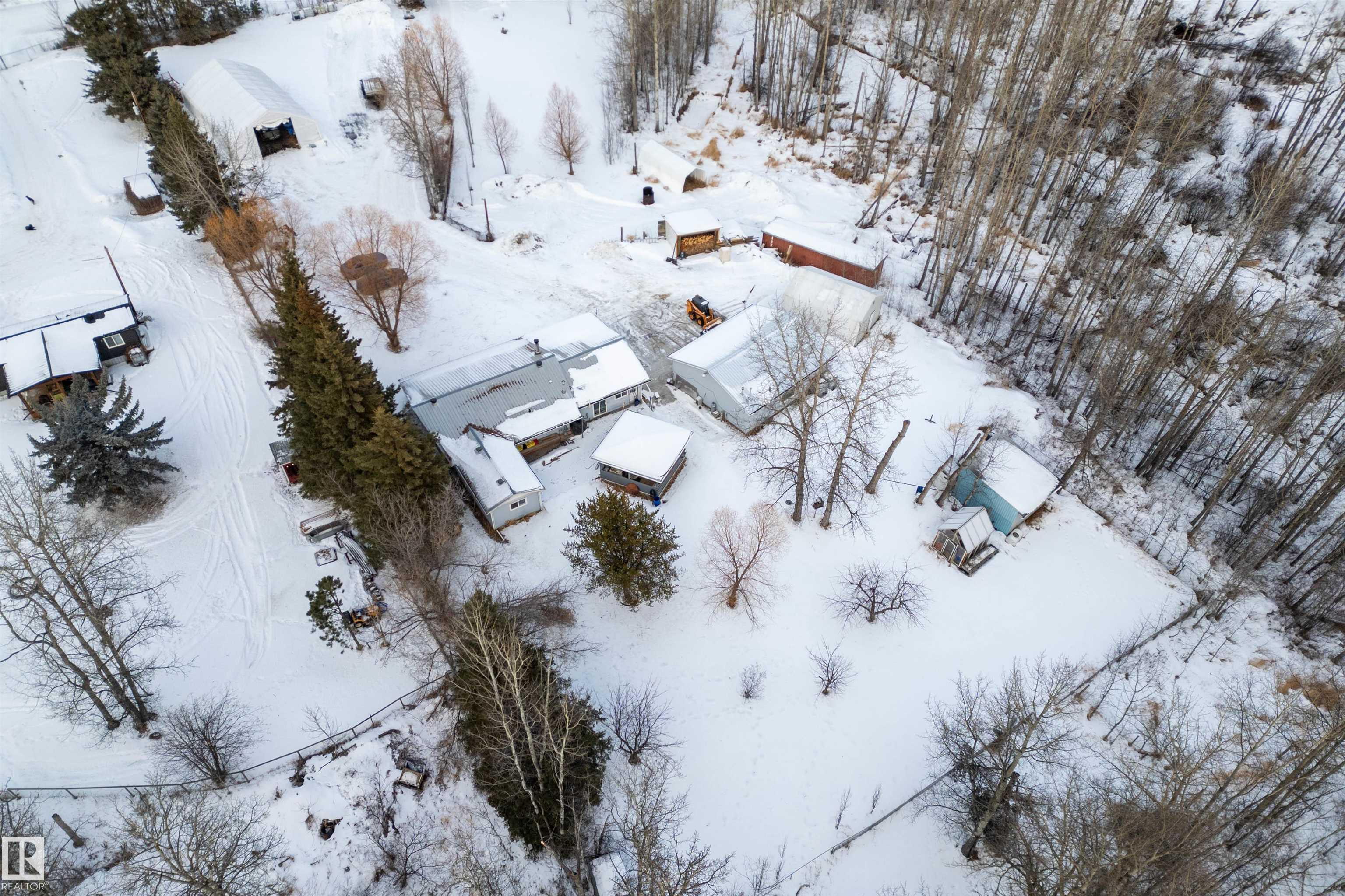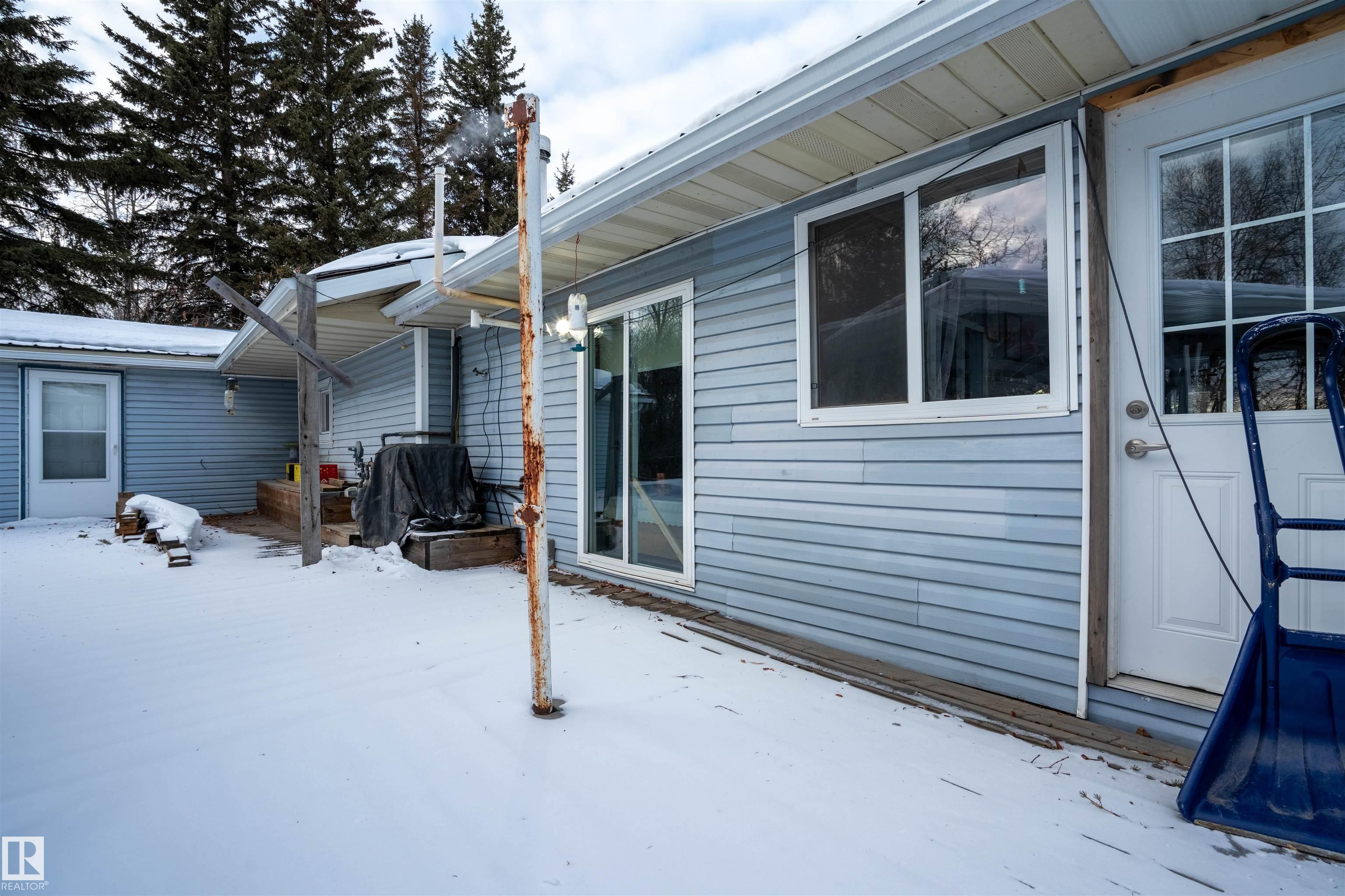 Welcome to your country paradise! Located in scenic Parkland County, this charming 2-bedroom home sits on 4 fully fenced acres, to the east is a park/reserve, offering exceptional privacy and natural surroundings. The property features a peaceful 10-ft pond, spacious gazebo, and small greenhouse, creating the perfect setting to relax and enjoy outdoor living. Inside, the home offers a bright sunroom, cozy wood-burning fireplace, and air conditioning for year-round comfort. Recent updates include a new boiler for the in-floor heated double car garage, an approximately 7-year-old well, hot water tank, tin roof on both the home and garage, and an electric gate for added security. Additional storage is available with three tarp sheds. Garage includes a 3 piece bathroom. Conveniently located near Cougar Creek and Grouse Nest Golf Course, Alberta Beach, and Wabamun, and just 25 minutes from Stony Plain, this property blends peaceful country living with easy access to nearby amenities.