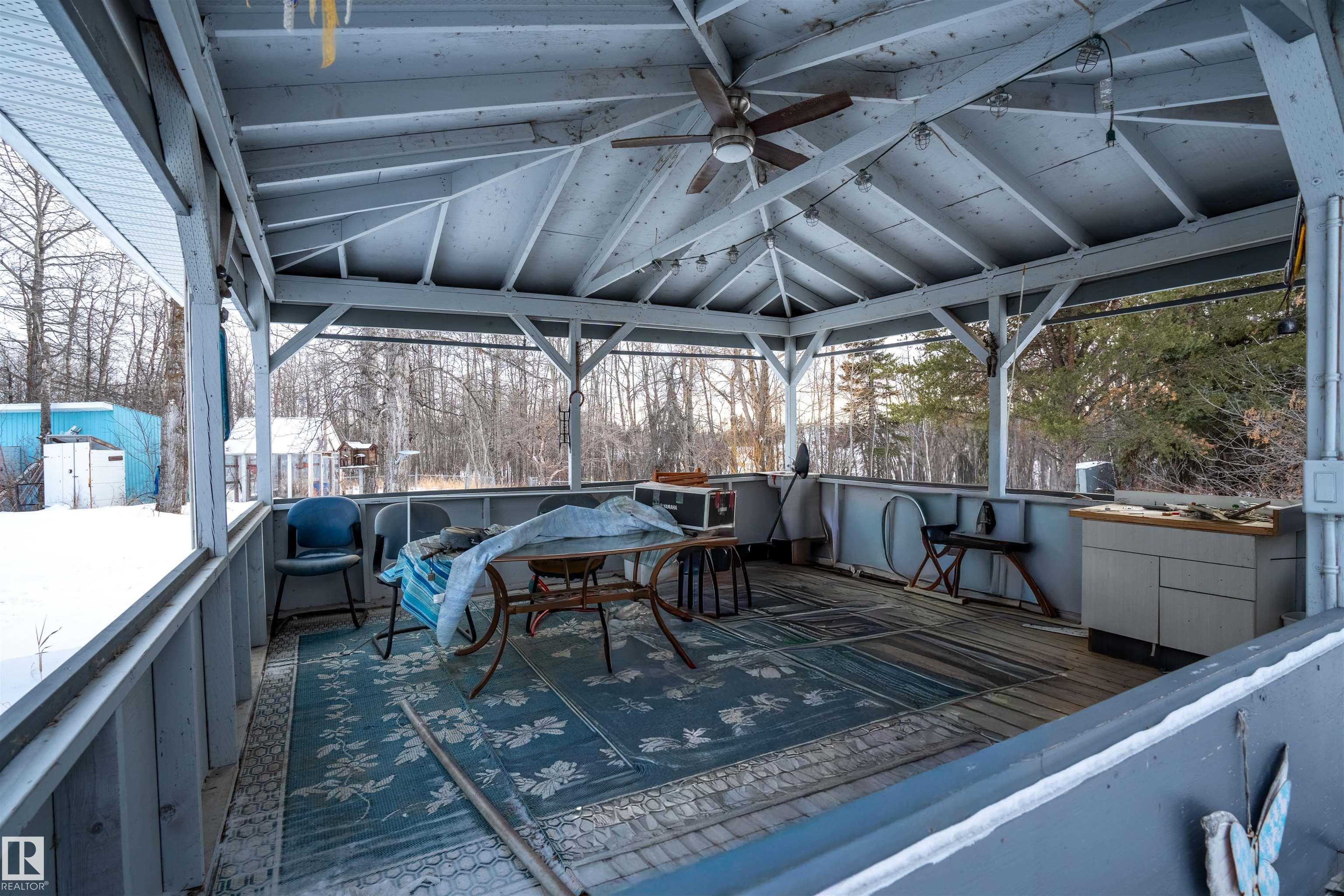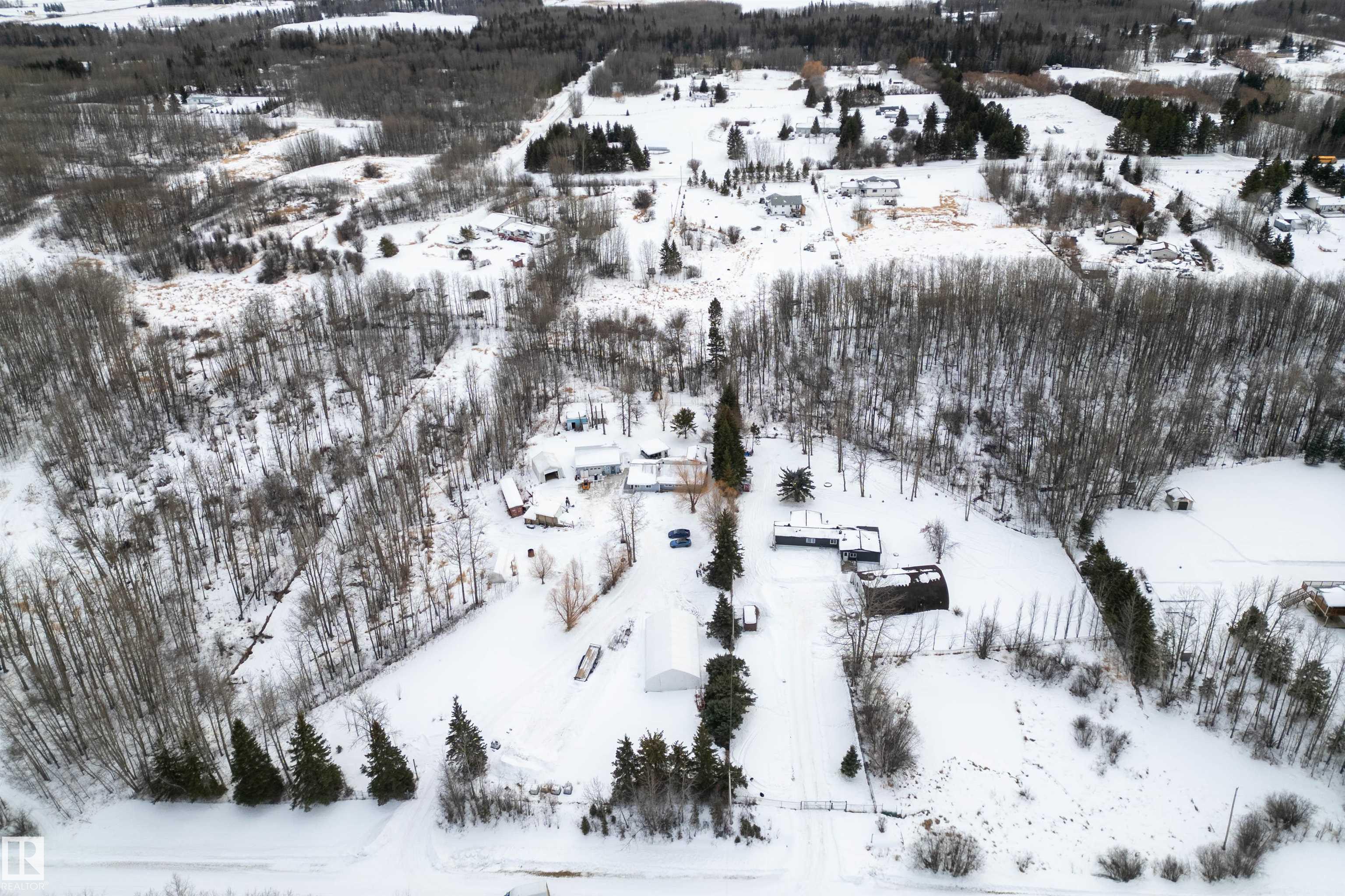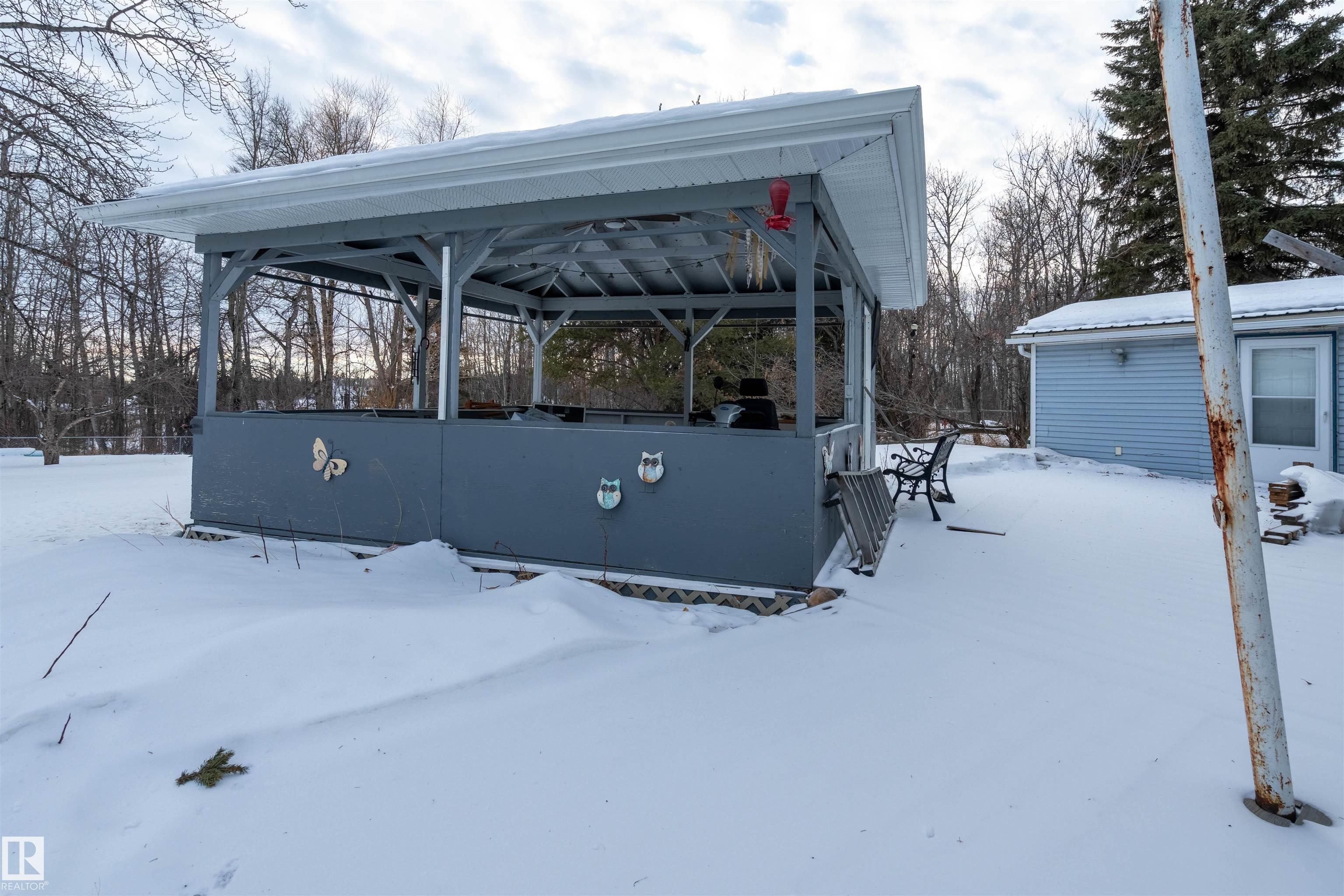 Welcome to your country paradise! Located in scenic Parkland County, this charming 2-bedroom home sits on 4 fully fenced acres, to the east is a park/reserve, offering exceptional privacy and natural surroundings. The property features a peaceful 10-ft pond, spacious gazebo, and small greenhouse, creating the perfect setting to relax and enjoy outdoor living. Inside, the home offers a bright sunroom, cozy wood-burning fireplace, and air conditioning for year-round comfort. Recent updates include a new boiler for the in-floor heated double car garage, an approximately 7-year-old well, hot water tank, tin roof on both the home and garage, and an electric gate for added security. Additional storage is available with three tarp sheds. Garage includes a 3 piece bathroom. Conveniently located near Cougar Creek and Grouse Nest Golf Course, Alberta Beach, and Wabamun, and just 25 minutes from Stony Plain, this property blends peaceful country living with easy access to nearby amenities.