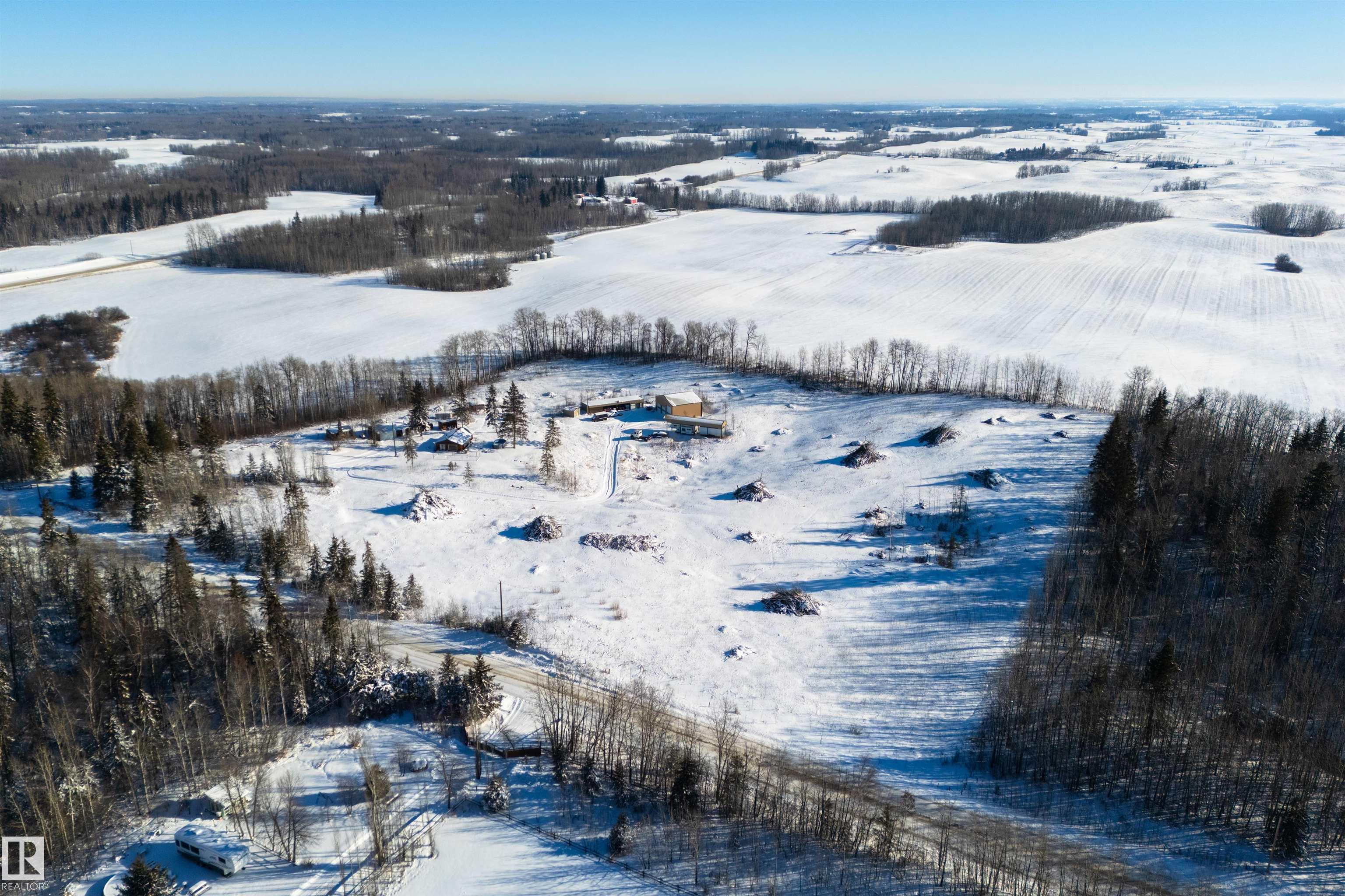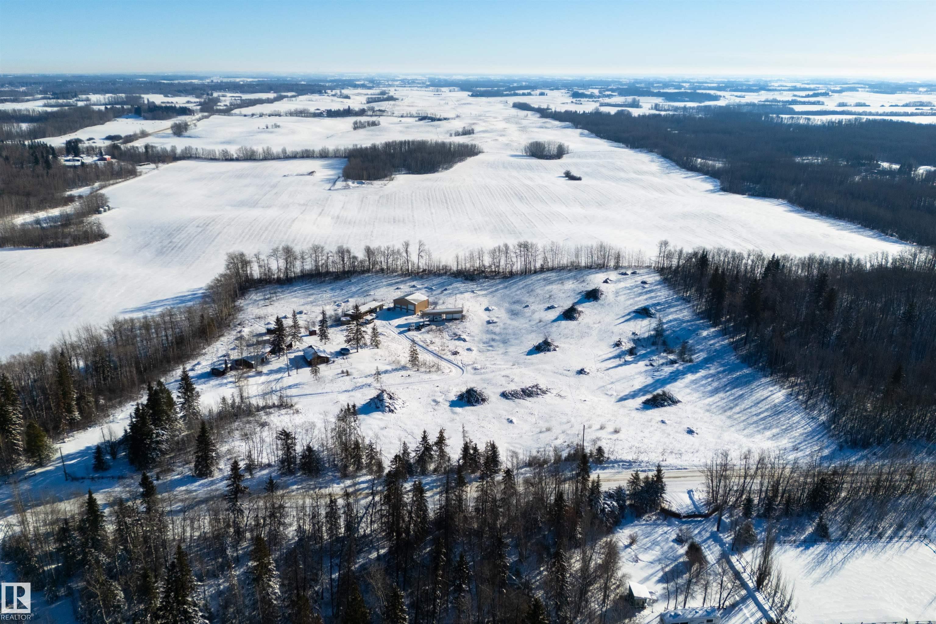 See the vision... build the dream... keep the infrastructure. This is a rare opportunity for the buyer who needs land and serious outbuildings, and is looking to build their dream home. This 9.71 acre parcel in Parkland County offers gently rolling terrain, has been recently cleared (perimeter trees remain) and is ready for a future custom-build. The existing 900 sqft 1-bedroom bungalow is clean, functional and ideal to live in or rent while you plan next steps, while the exterior outbuildings hold real value: a heated 40'x34' shop with 220V power, 12'x60' covered RV parking, 24'x64' bar/storage building with covered storage area, detached 29'x23' garage, powered 19'x11' bunkhouse, chicken coops & sheds. Located out of subdivision and minutes to Jackfish, Mink & Hasse Lakes, this property offers you privacy, flexibility and the space to build out your acreage dream.