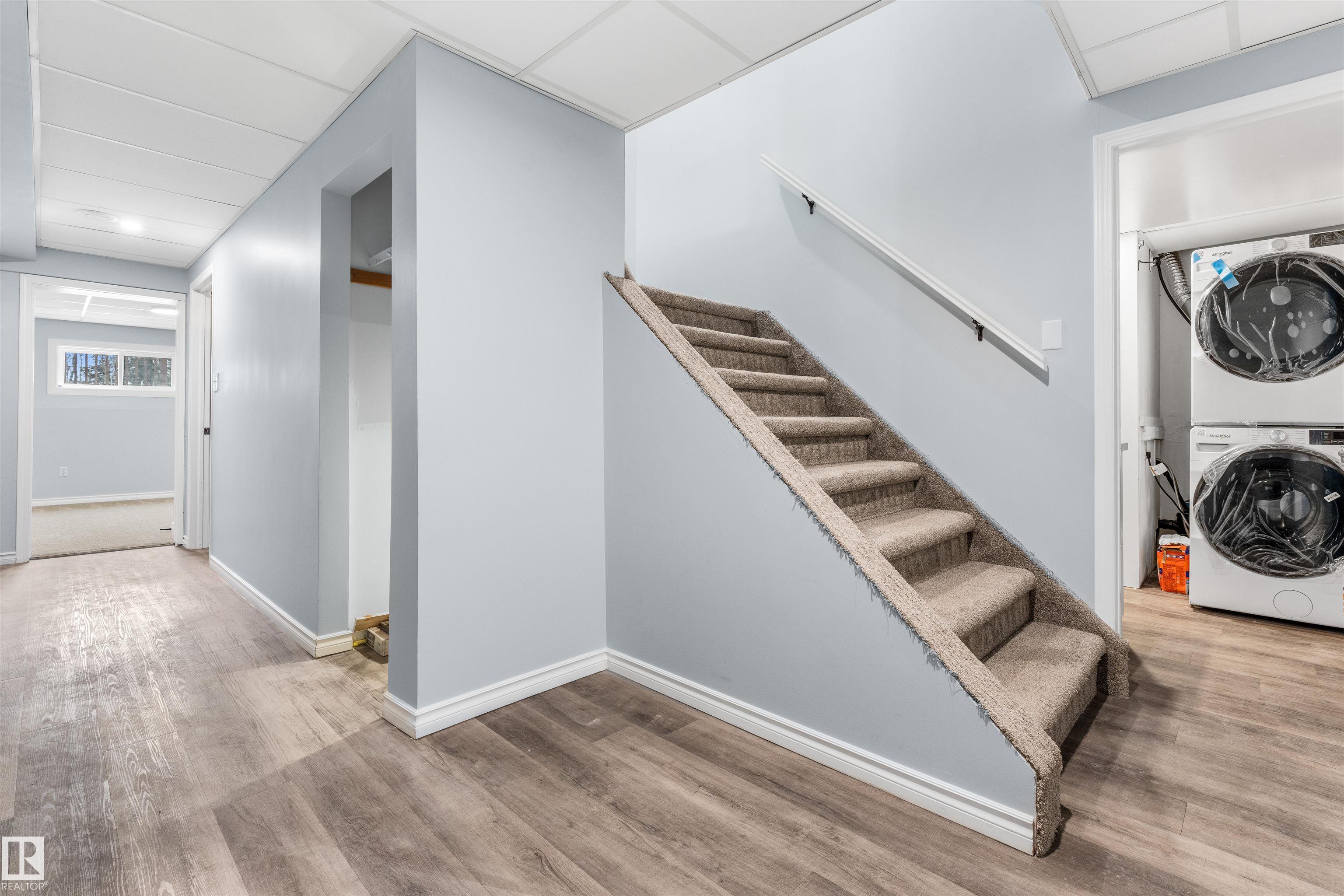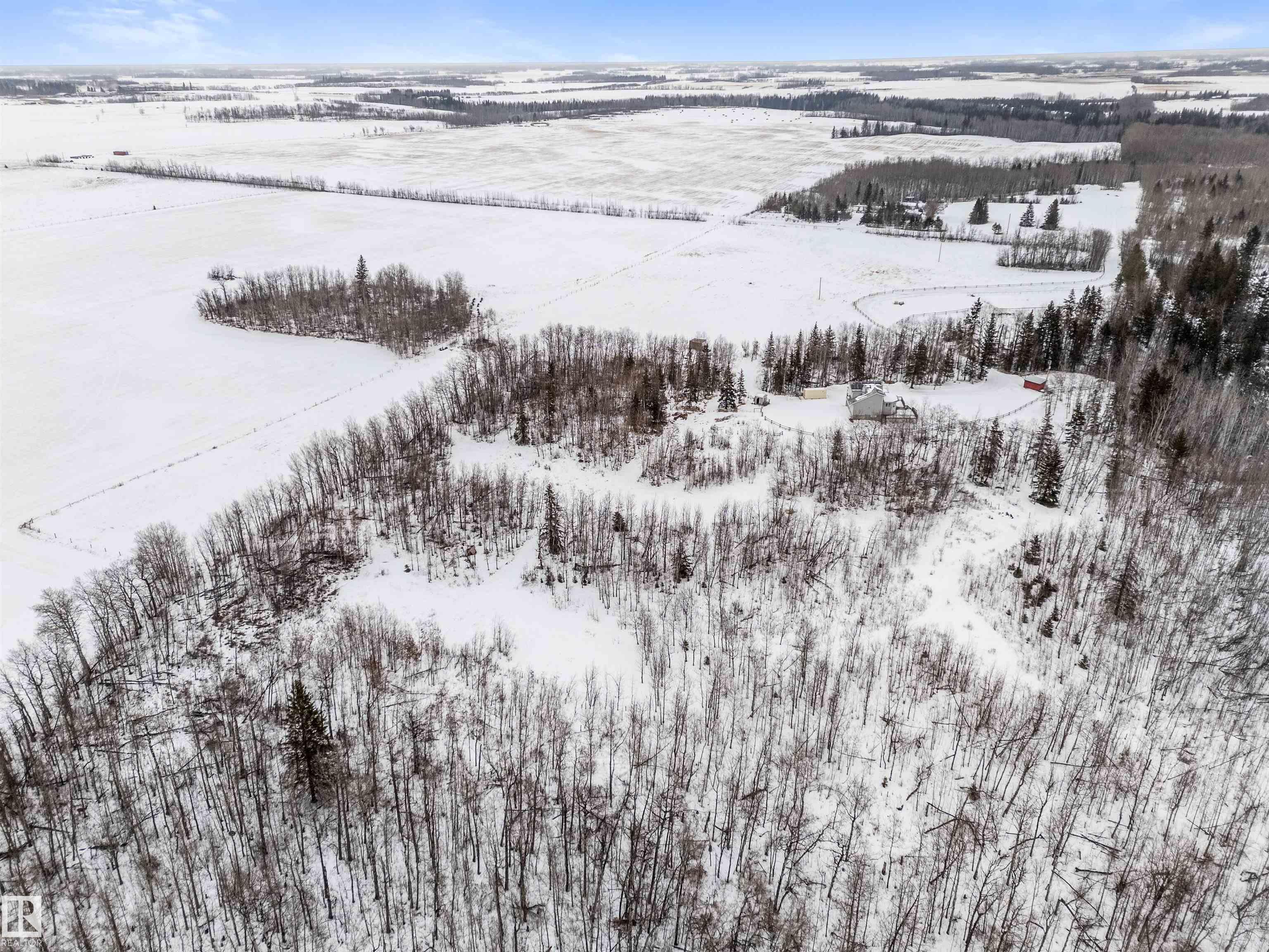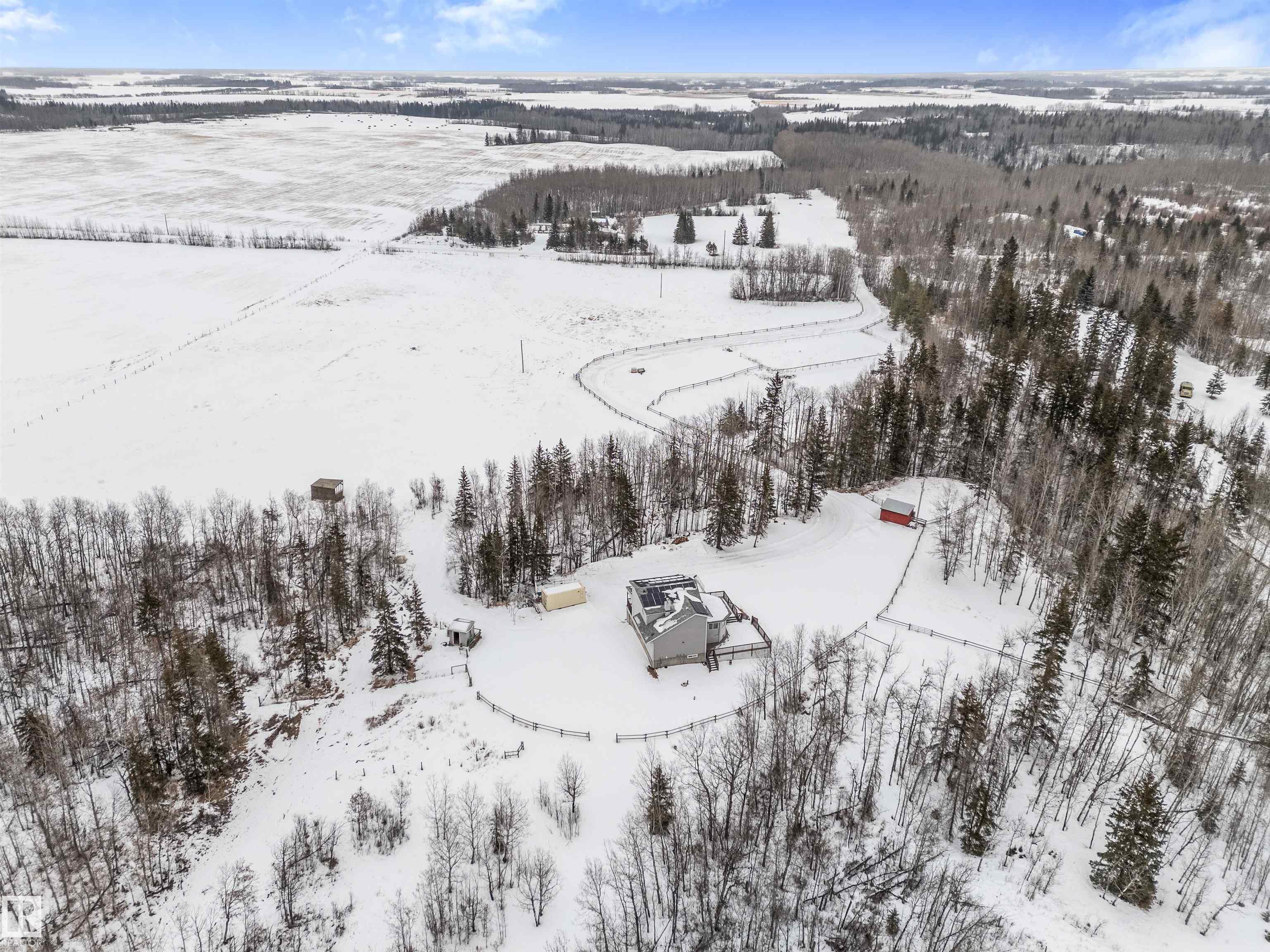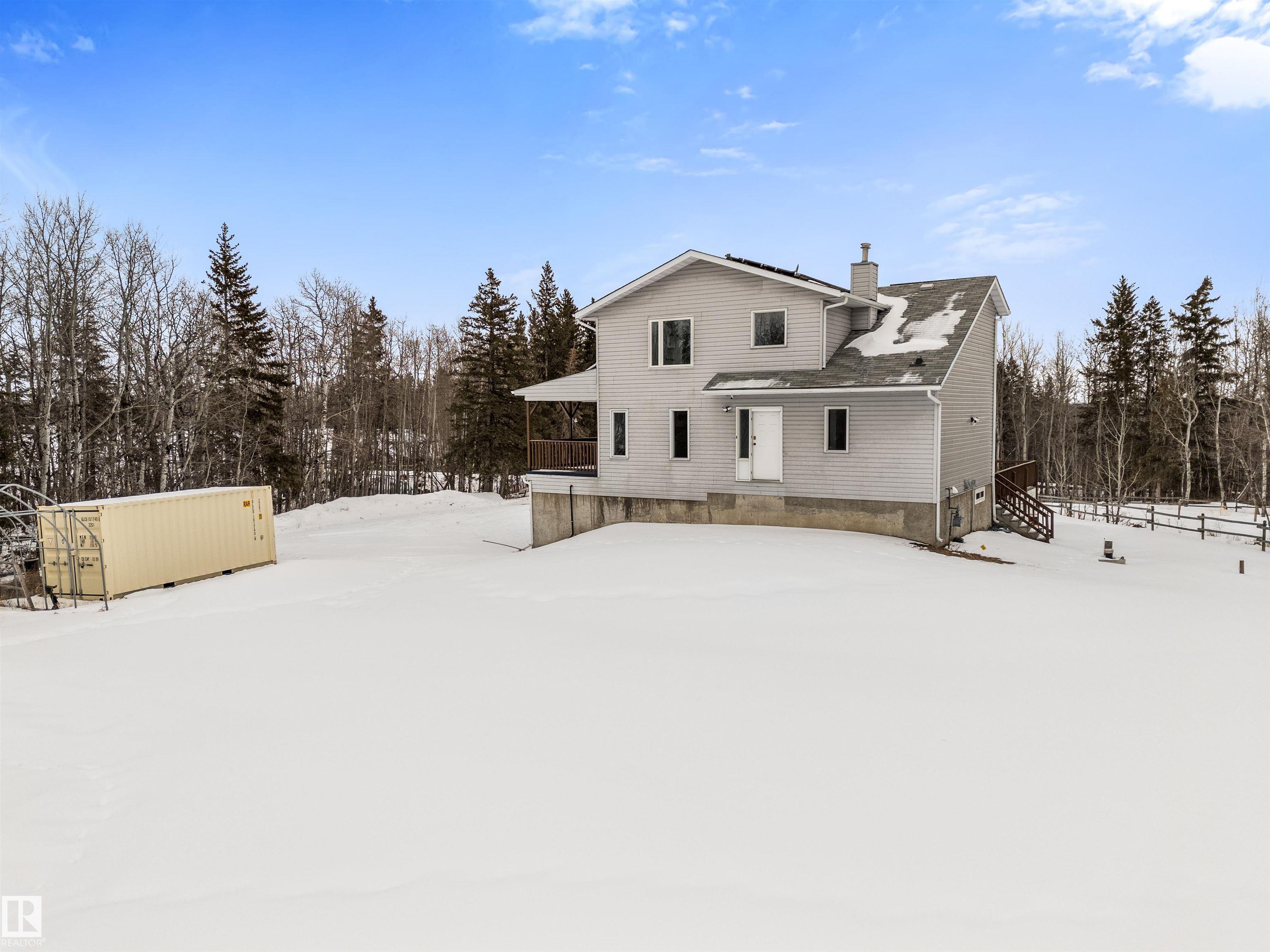 If you want peace and quiet? Enjoy nature on this 9.99 acre parcel just 20 minutes from Stony Plain. Nicely upgraded thru-out is this two storey walk out basement. Brand new kitchen cabinets, and back splash, freshly painted thru-out, new carpets, newer septic and filtration system, All new appliances, central vacuum system, Covered wrap around deck with new carpeting. House has 60 amp service with solar panels. Cistern holds approximately. 3000 gallons. Lots of room for a great hobby farm. Smaller attached garage with new epoxy floor. Property was recently subdivided so taxes to be determined. Were approx. $4221.30 in 2025. Located just minutes from the N. Sask River. Adjacent 10 acres may be purchased separately . MLS#E4476253