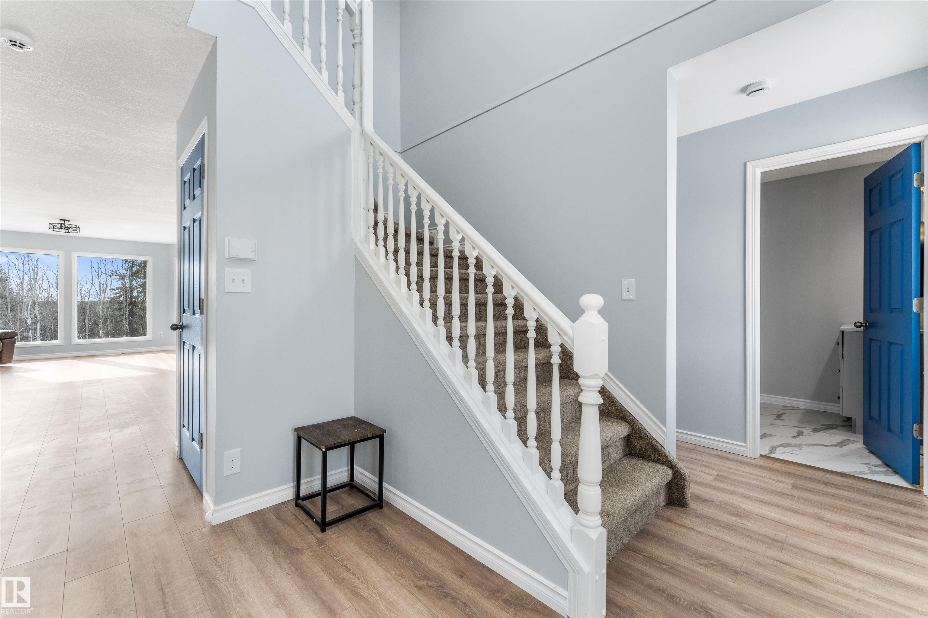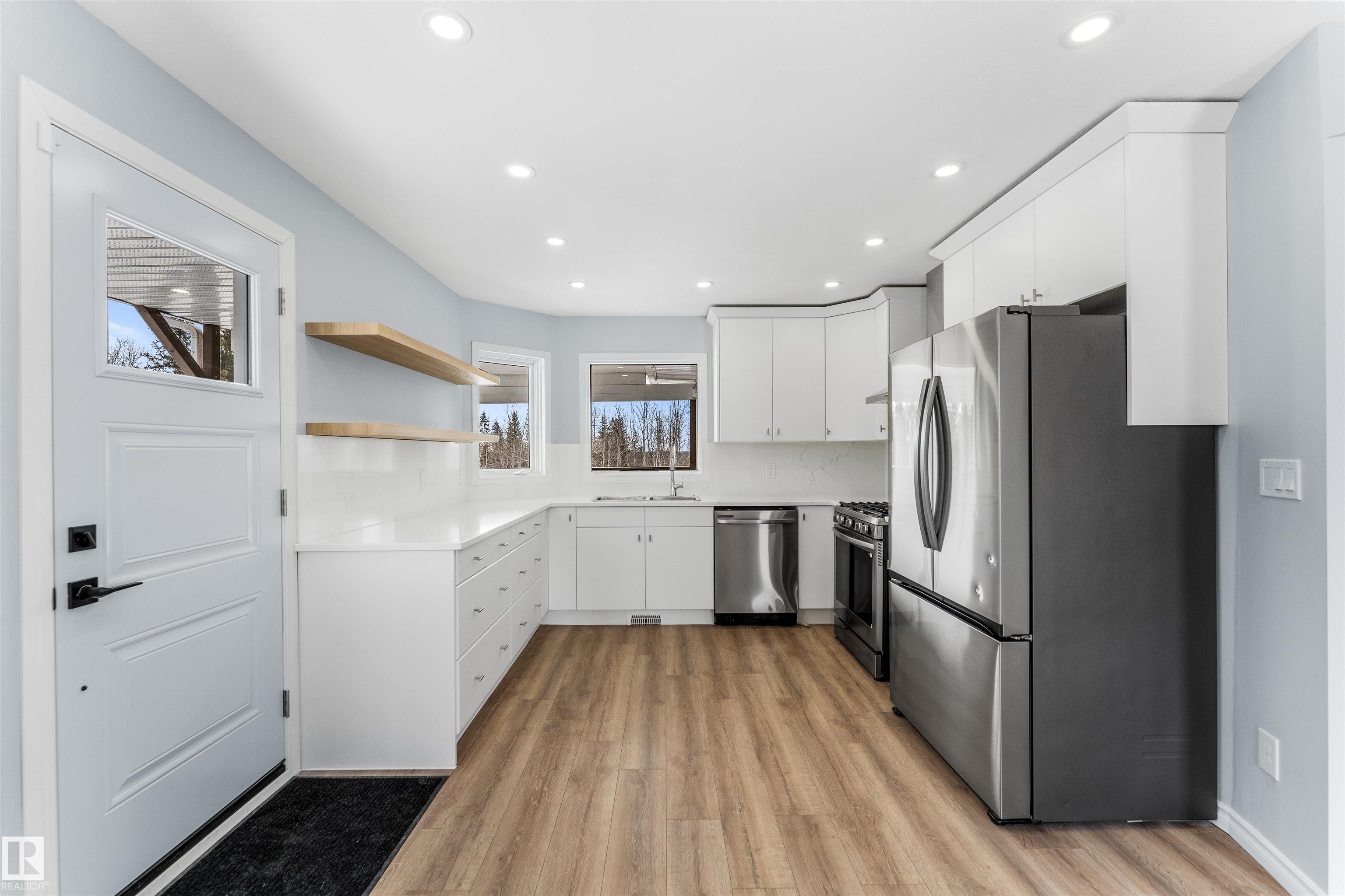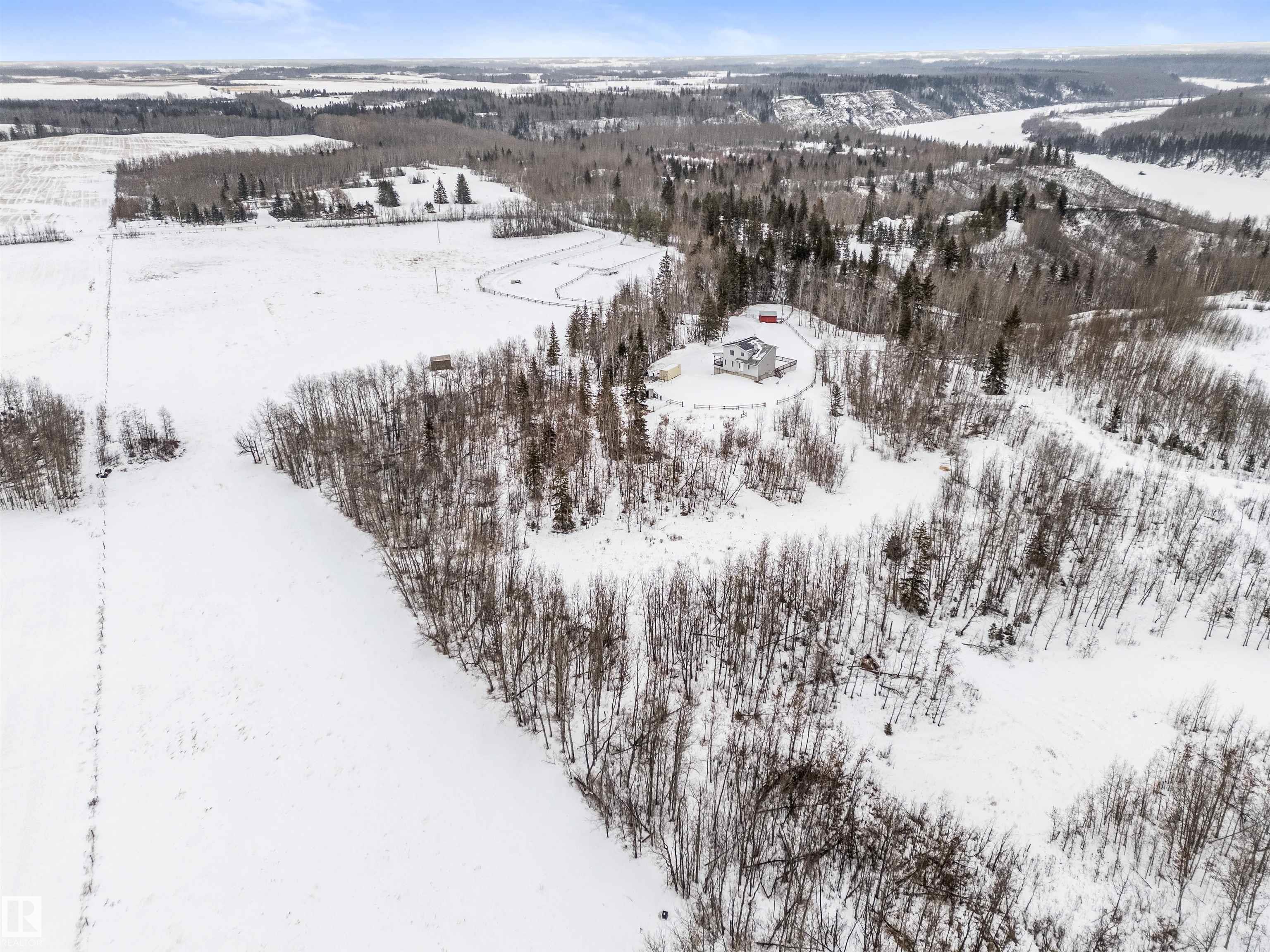 If you want peace and quiet? Enjoy nature on this 9.99 acre parcel just 20 minutes from Stony Plain. Nicely upgraded thru-out is this two storey walk out basement. Brand new kitchen cabinets, and back splash, freshly painted thru-out, new carpets, newer septic and filtration system, All new appliances, central vacuum system, Covered wrap around deck with new carpeting. House has 60 amp service with solar panels. Cistern holds approximately. 3000 gallons. Lots of room for a great hobby farm. Smaller attached garage with new epoxy floor. Property was recently subdivided so taxes to be determined. Were approx. $4221.30 in 2025. Located just minutes from the N. Sask River. Adjacent 10 acres may be purchased separately . MLS#E4476253