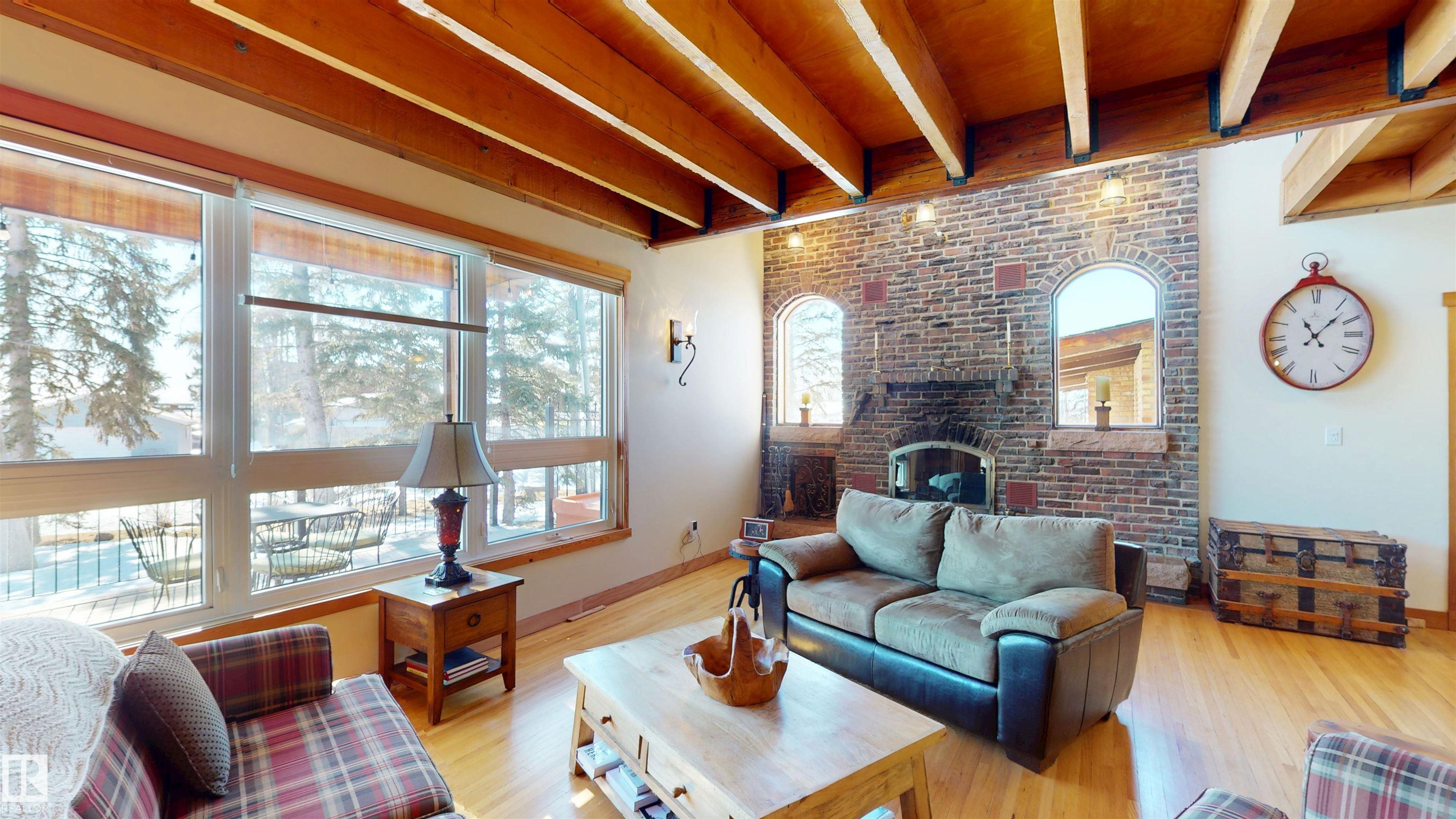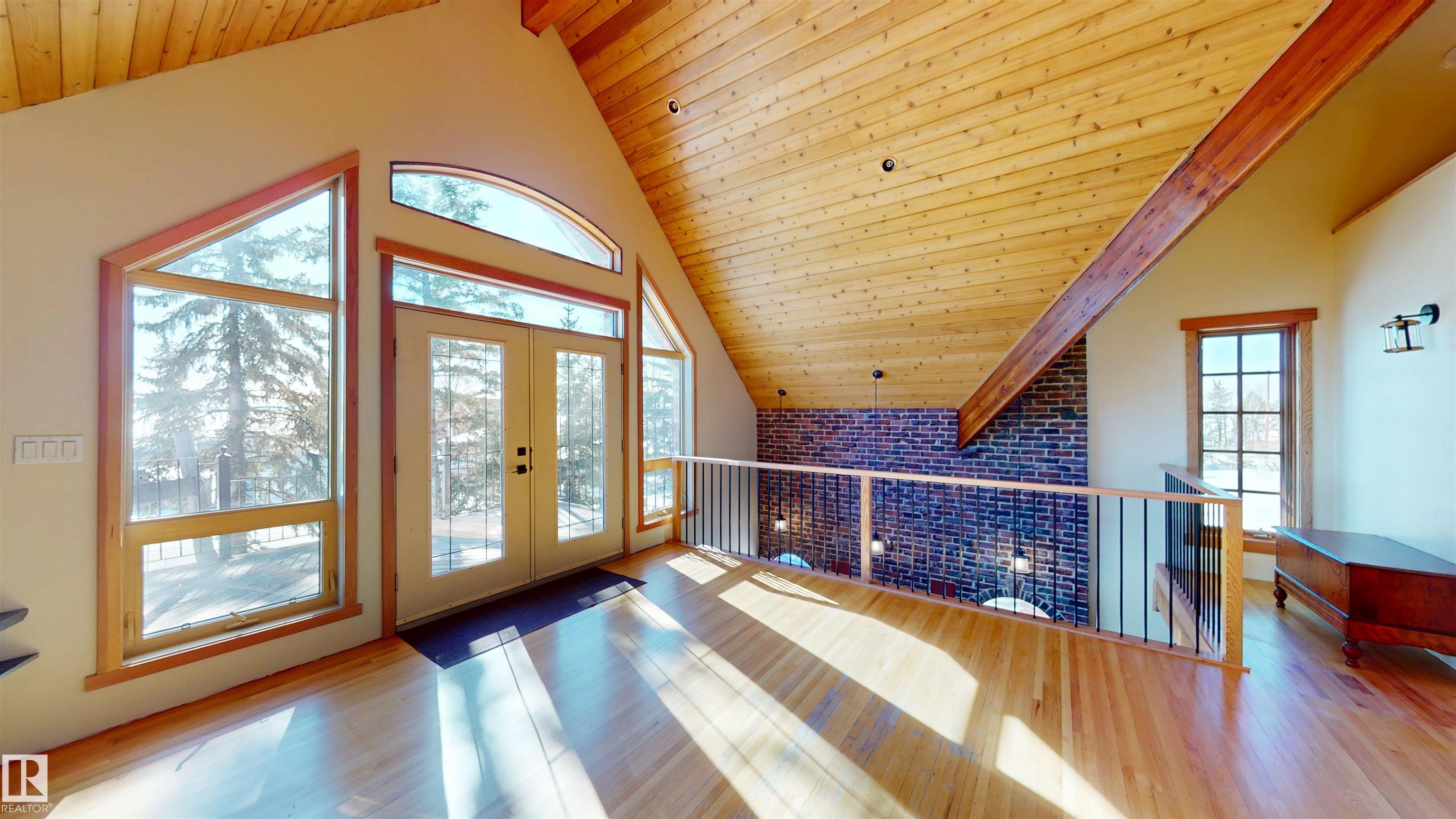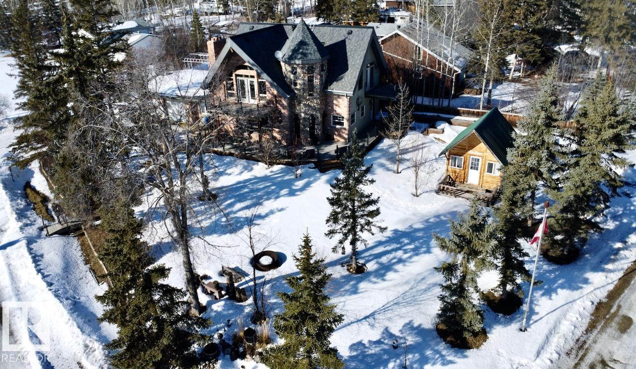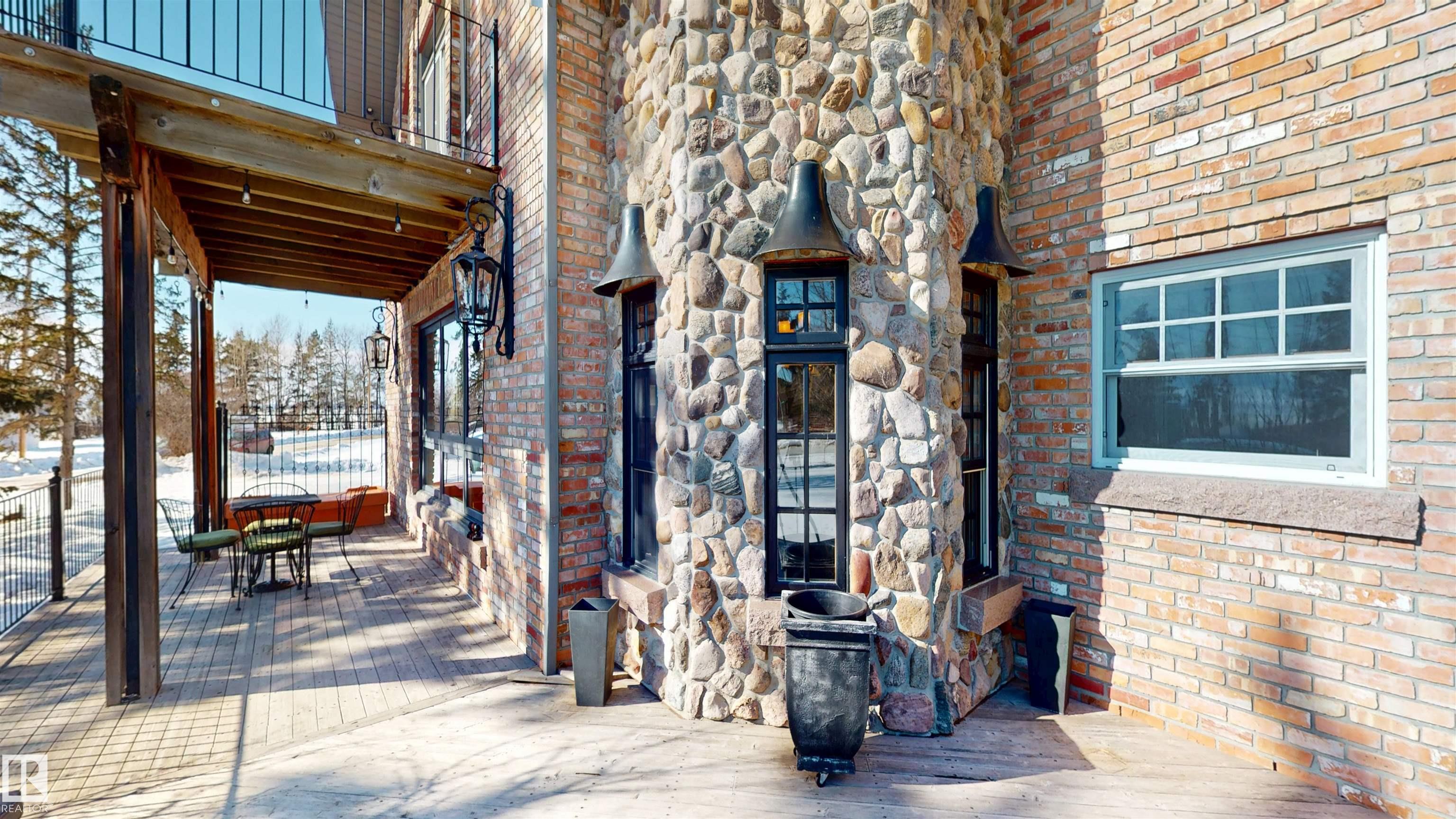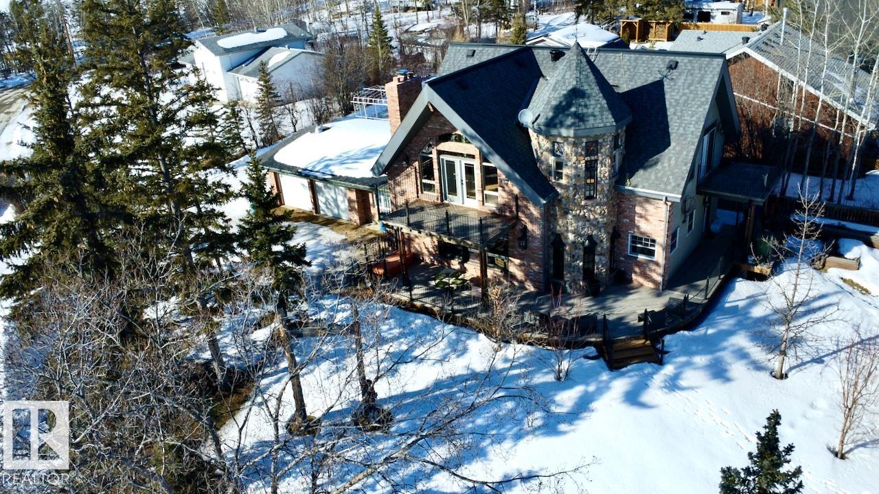 This striking home blends timeless character with standout design in a private, nature filled setting. Rich brickwork, dramatic rooflines, and a signature turret create unforgettable curb appeal, while expansive windows and upper balconies capture natural light and scenic lake views. Step inside from the beautifully landscaped yard into a truly one of a kind interior. The kitchen features custom wood cabinetry, granite countertops, a grand piano shaped island with bar seating, and premium appliances. The octagonal dining area impresses with vaulted ceilings, copper detailing, and wraparound windows. A stunning floor to ceiling brick fireplace anchors the living space. Upstairs offers a bright loft with vaulted pine ceilings, custom railings, and access to two balconies. The upper turret level, plumbed for a wet bar, doubles as a cozy retreat with incredible views. Complete with a spacious primary suite, ensuite bath, and refined finishes throughout, this home truly comes with all the bells and whistles!