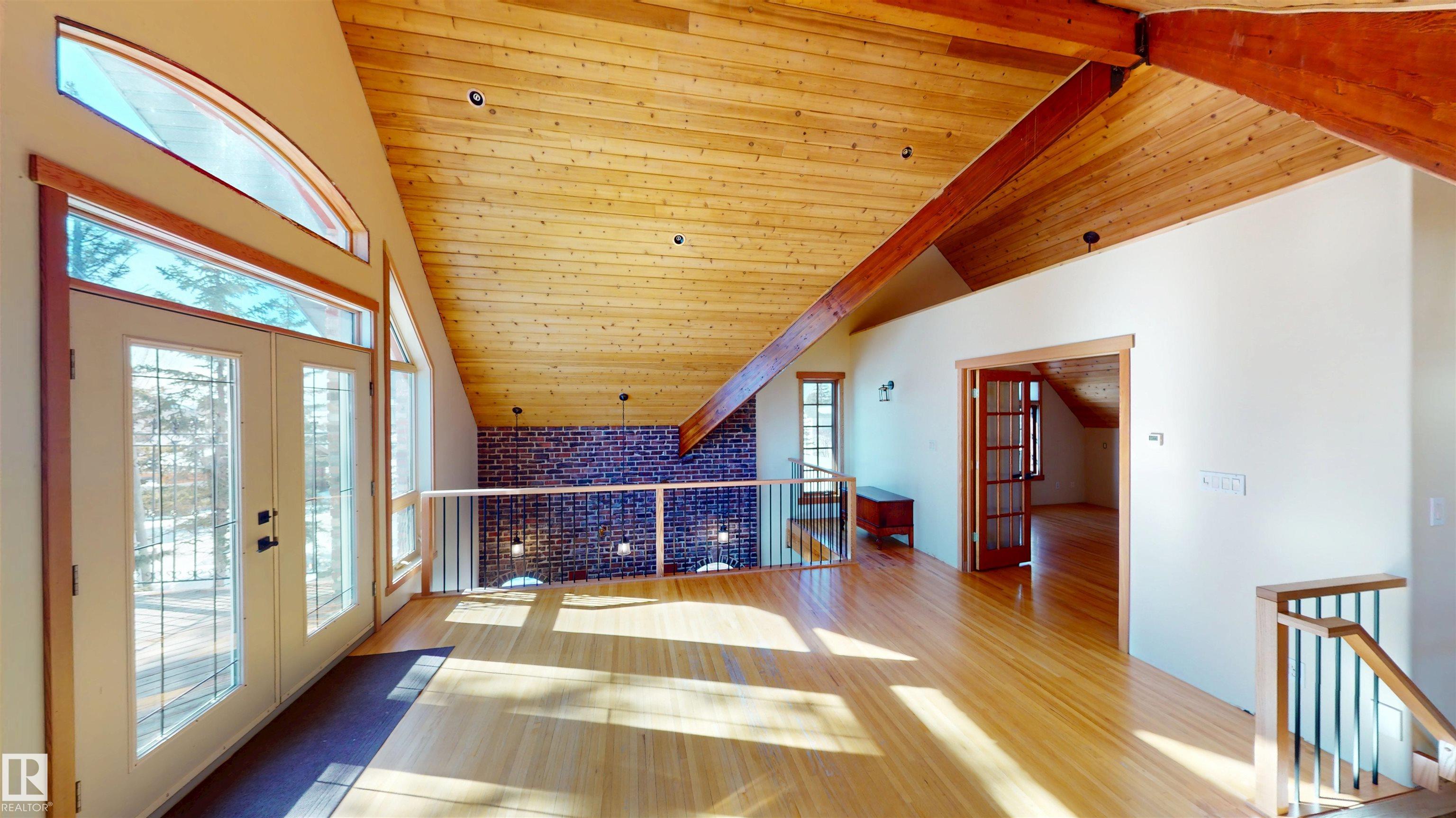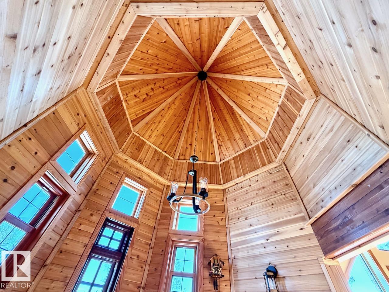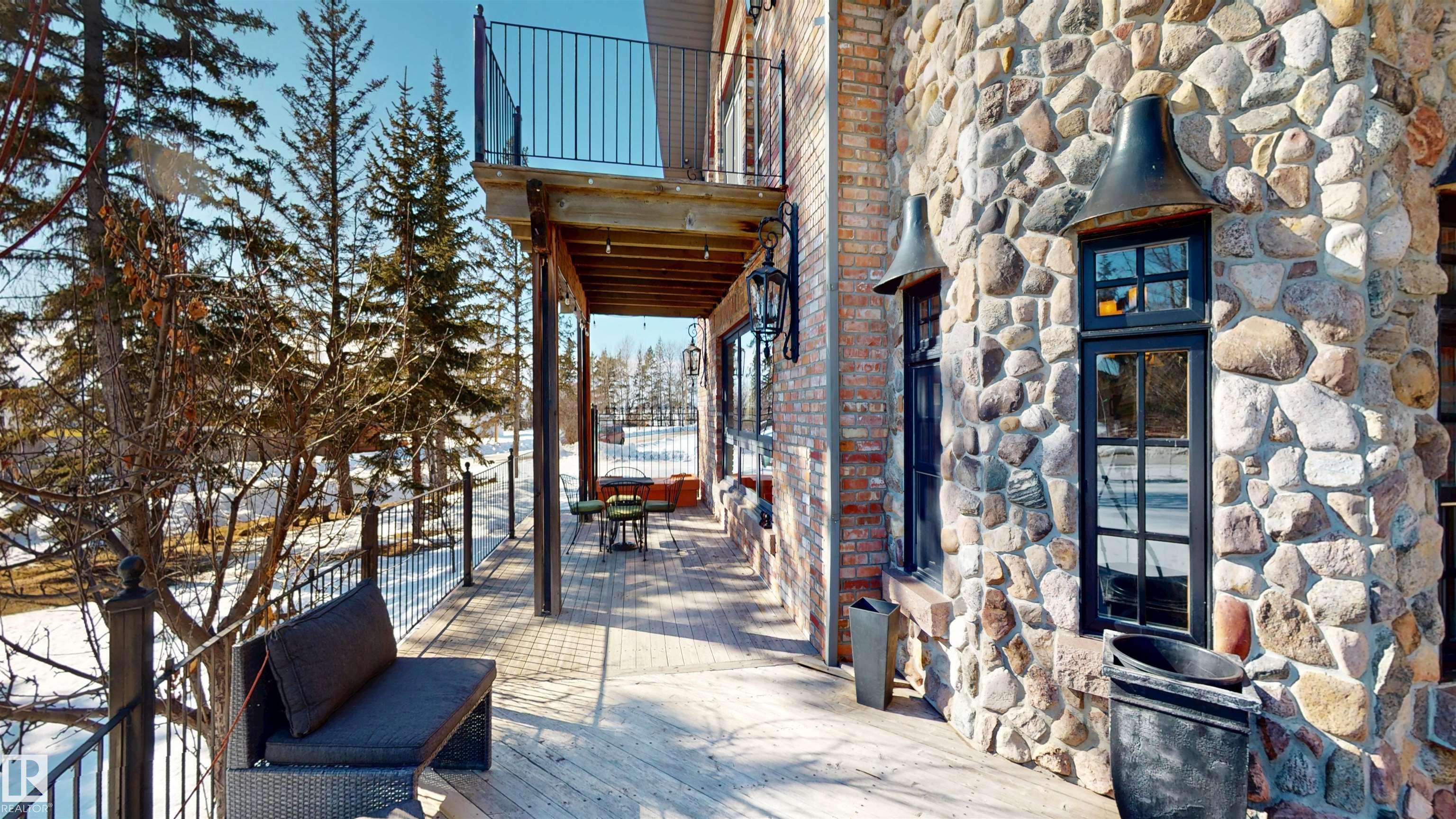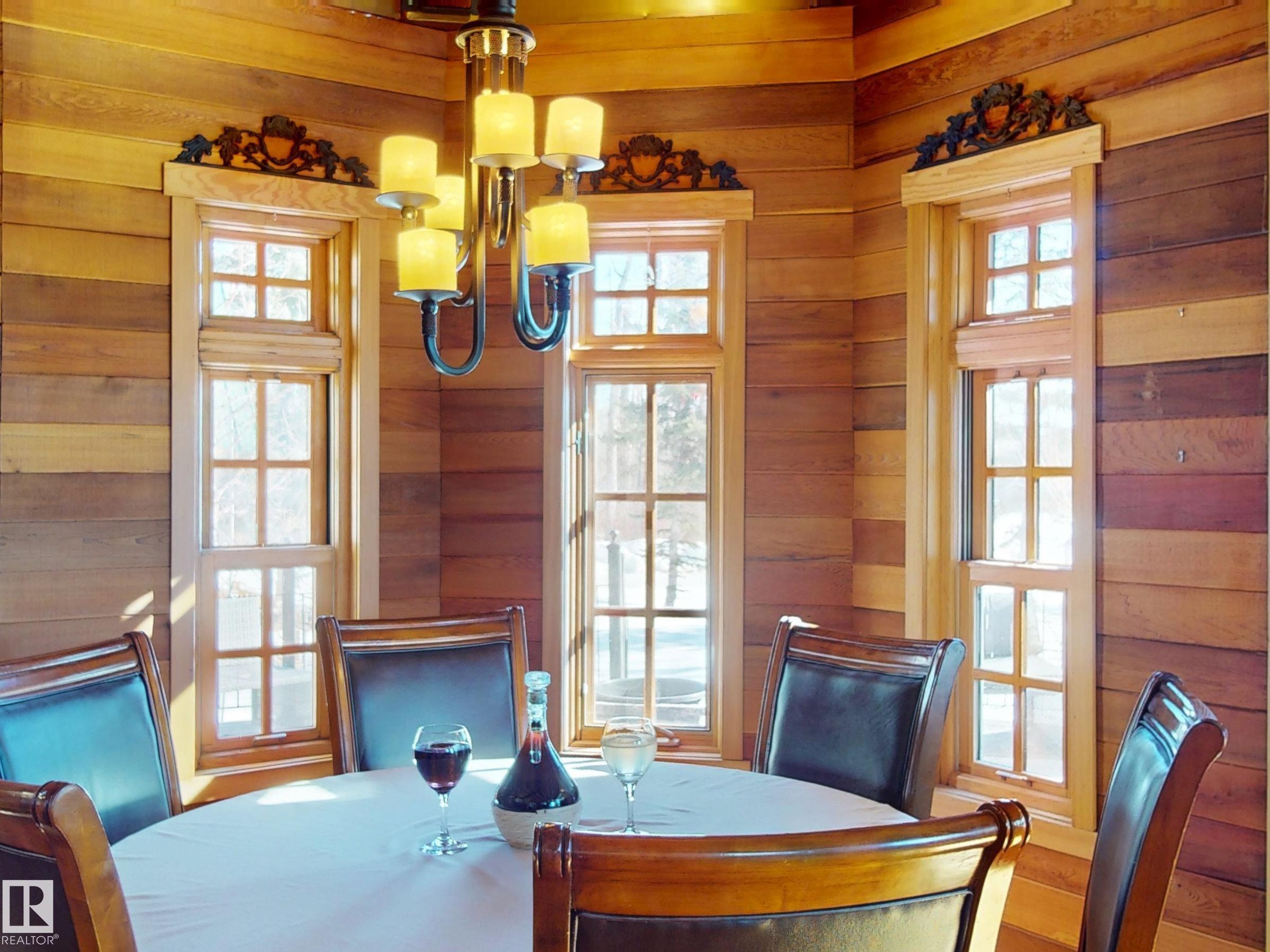 This striking home blends timeless character with standout design in a private, nature filled setting. Rich brickwork, dramatic rooflines, and a signature turret create unforgettable curb appeal, while expansive windows and upper balconies capture natural light and scenic lake views. Step inside from the beautifully landscaped yard into a truly one of a kind interior. The kitchen features custom wood cabinetry, granite countertops, a grand piano shaped island with bar seating, and premium appliances. The octagonal dining area impresses with vaulted ceilings, copper detailing, and wraparound windows. A stunning floor to ceiling brick fireplace anchors the living space. Upstairs offers a bright loft with vaulted pine ceilings, custom railings, and access to two balconies. The upper turret level, plumbed for a wet bar, doubles as a cozy retreat with incredible views. Complete with a spacious primary suite, ensuite bath, and refined finishes throughout, this home truly comes with all the bells and whistles!