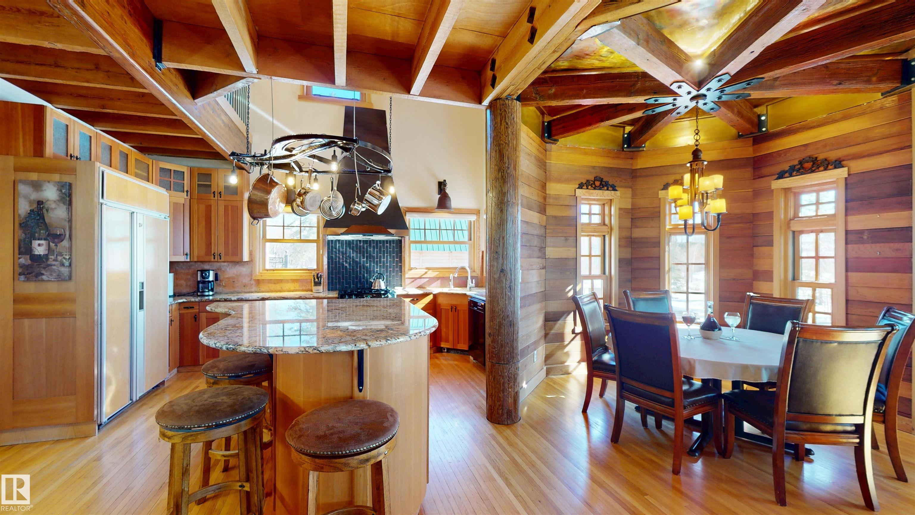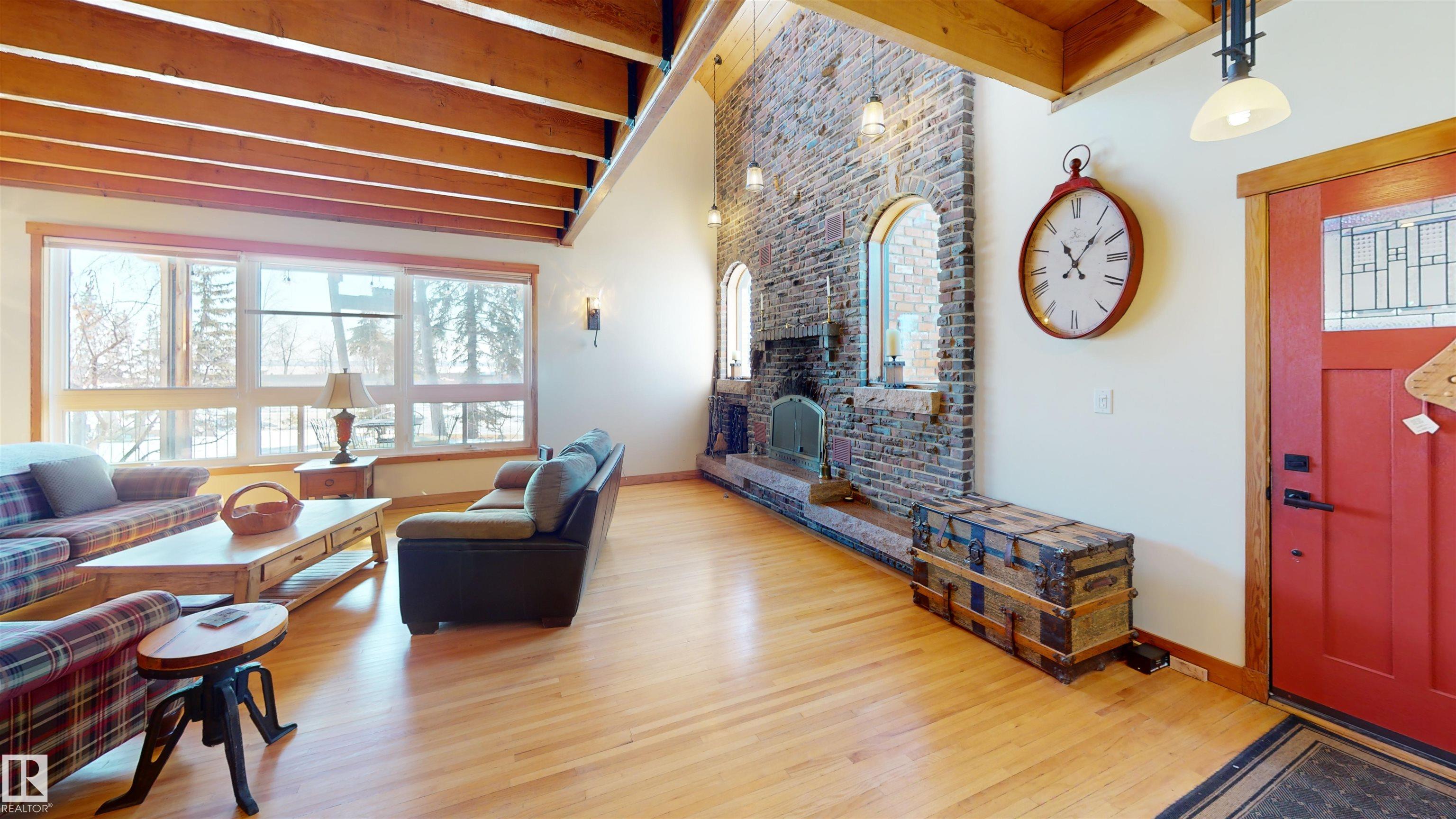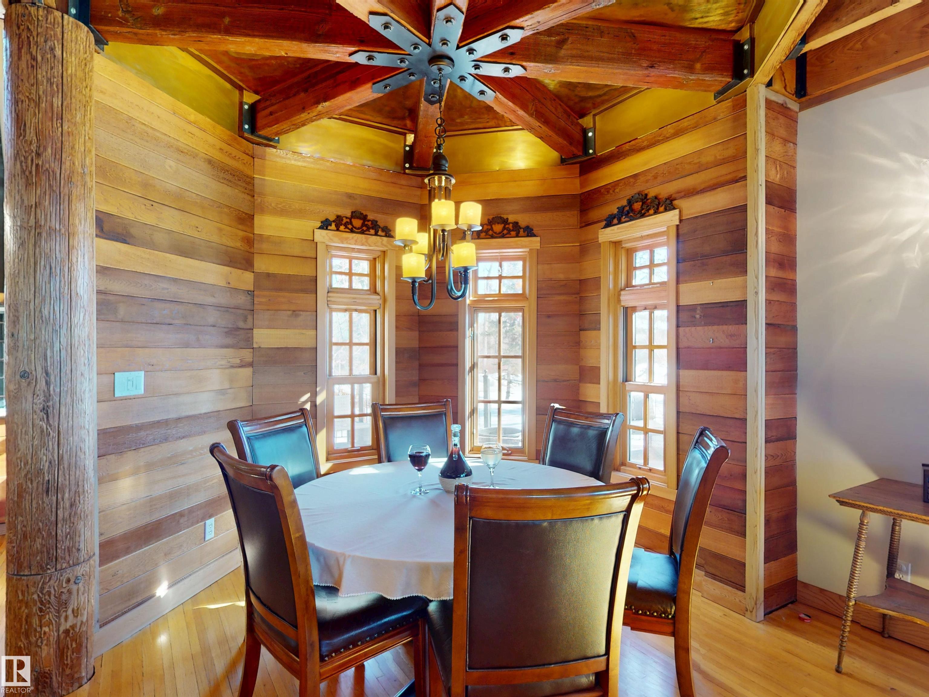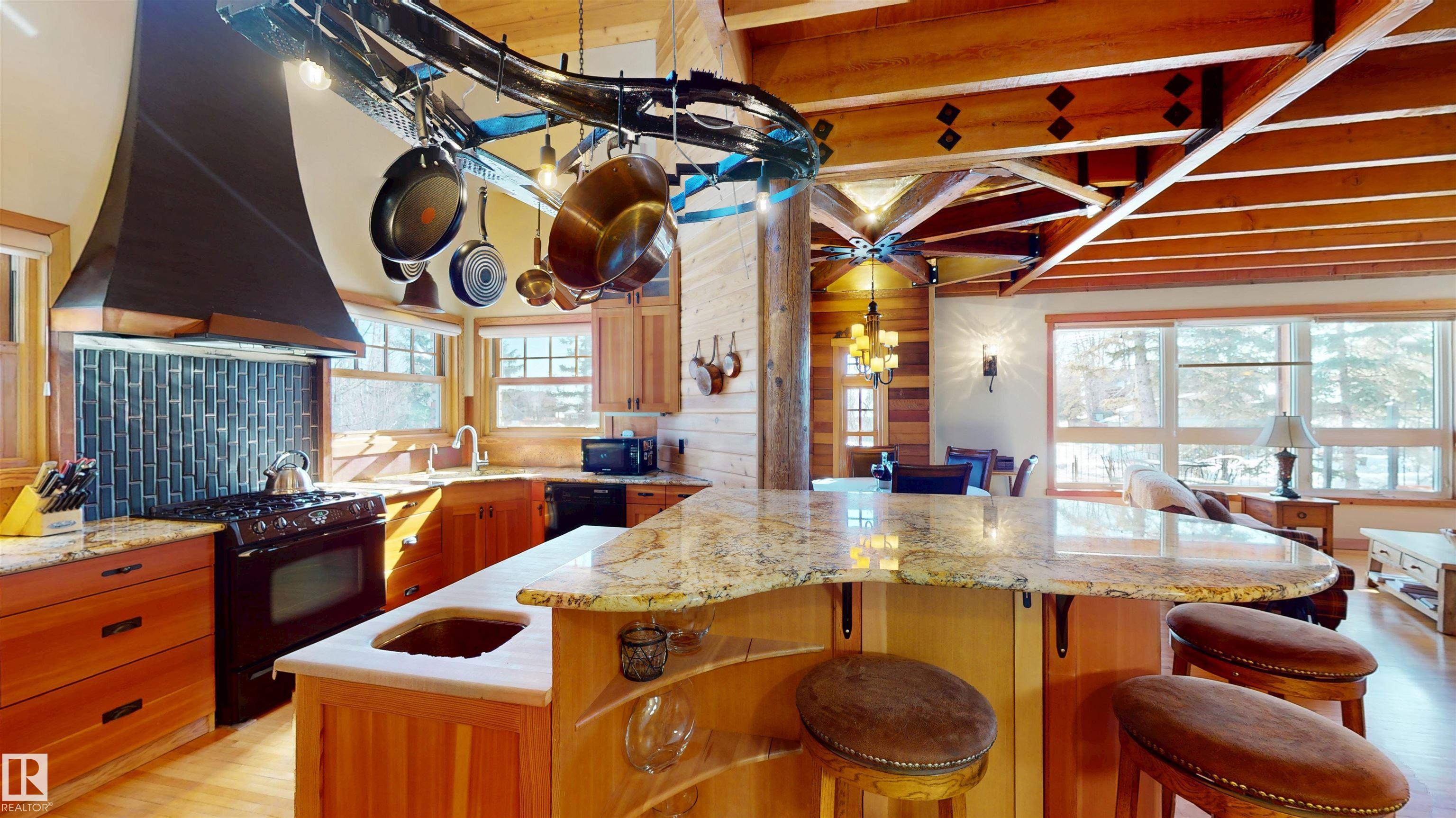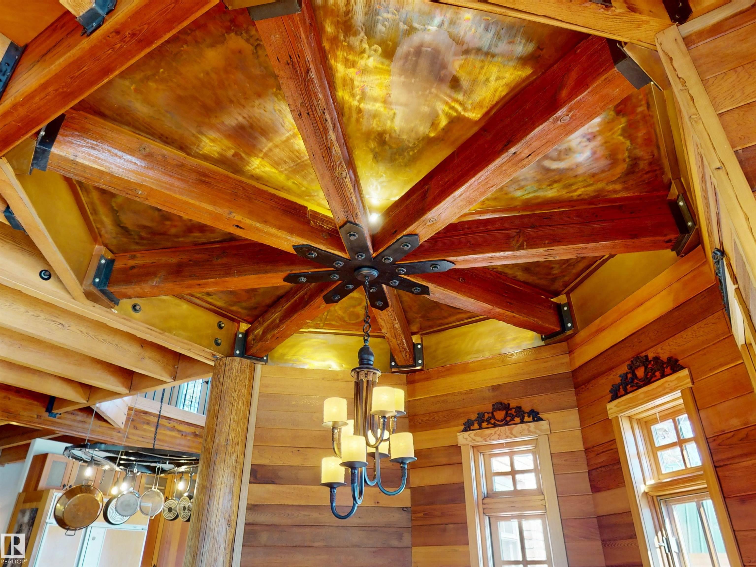 This striking home blends timeless character with standout design in a private, nature filled setting. Rich brickwork, dramatic rooflines, and a signature turret create unforgettable curb appeal, while expansive windows and upper balconies capture natural light and scenic lake views. Step inside from the beautifully landscaped yard into a truly one of a kind interior. The kitchen features custom wood cabinetry, granite countertops, a grand piano shaped island with bar seating, and premium appliances. The octagonal dining area impresses with vaulted ceilings, copper detailing, and wraparound windows. A stunning floor to ceiling brick fireplace anchors the living space. Upstairs offers a bright loft with vaulted pine ceilings, custom railings, and access to two balconies. The upper turret level, plumbed for a wet bar, doubles as a cozy retreat with incredible views. Complete with a spacious primary suite, ensuite bath, and refined finishes throughout, this home truly comes with all the bells and whistles!