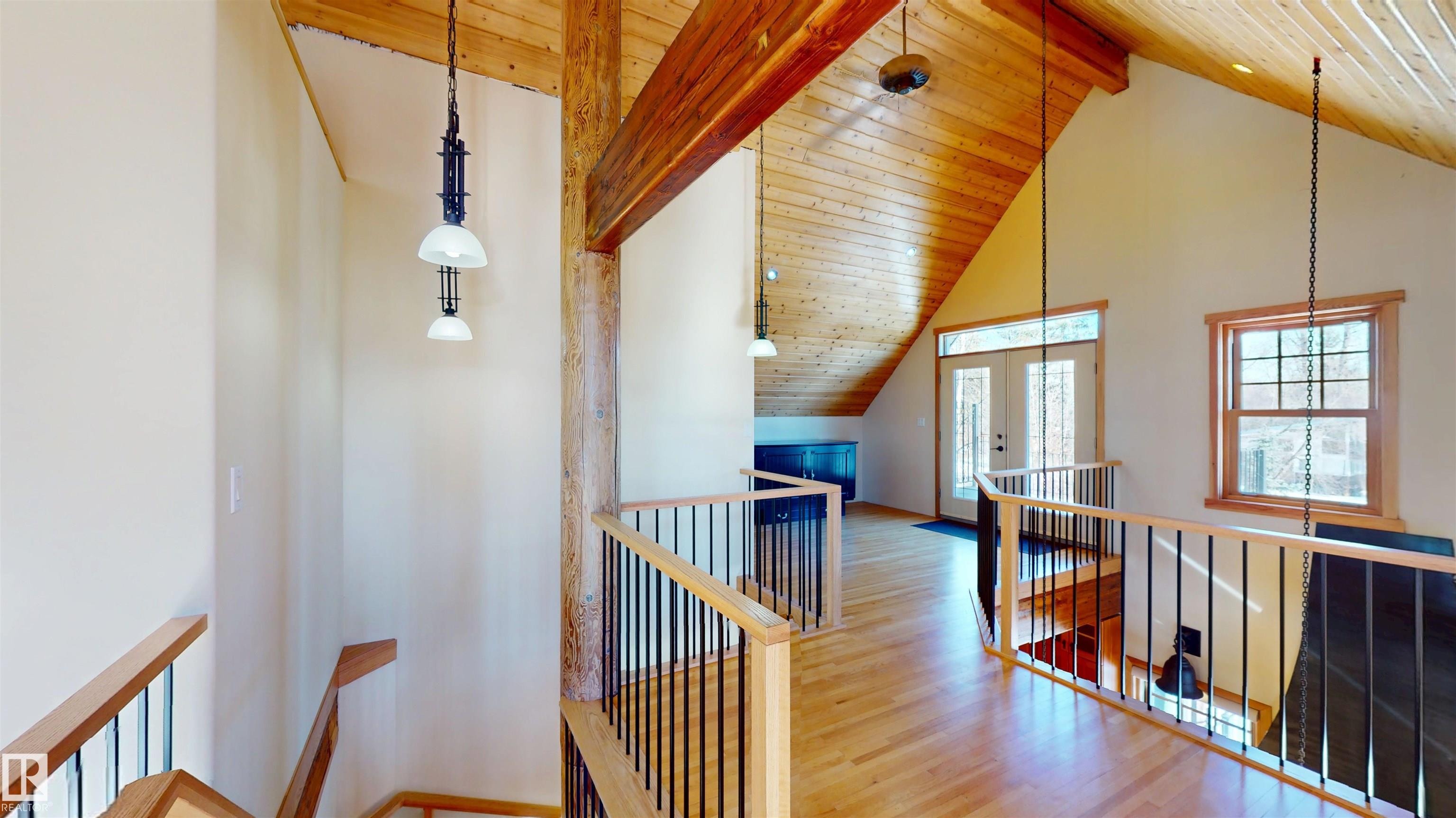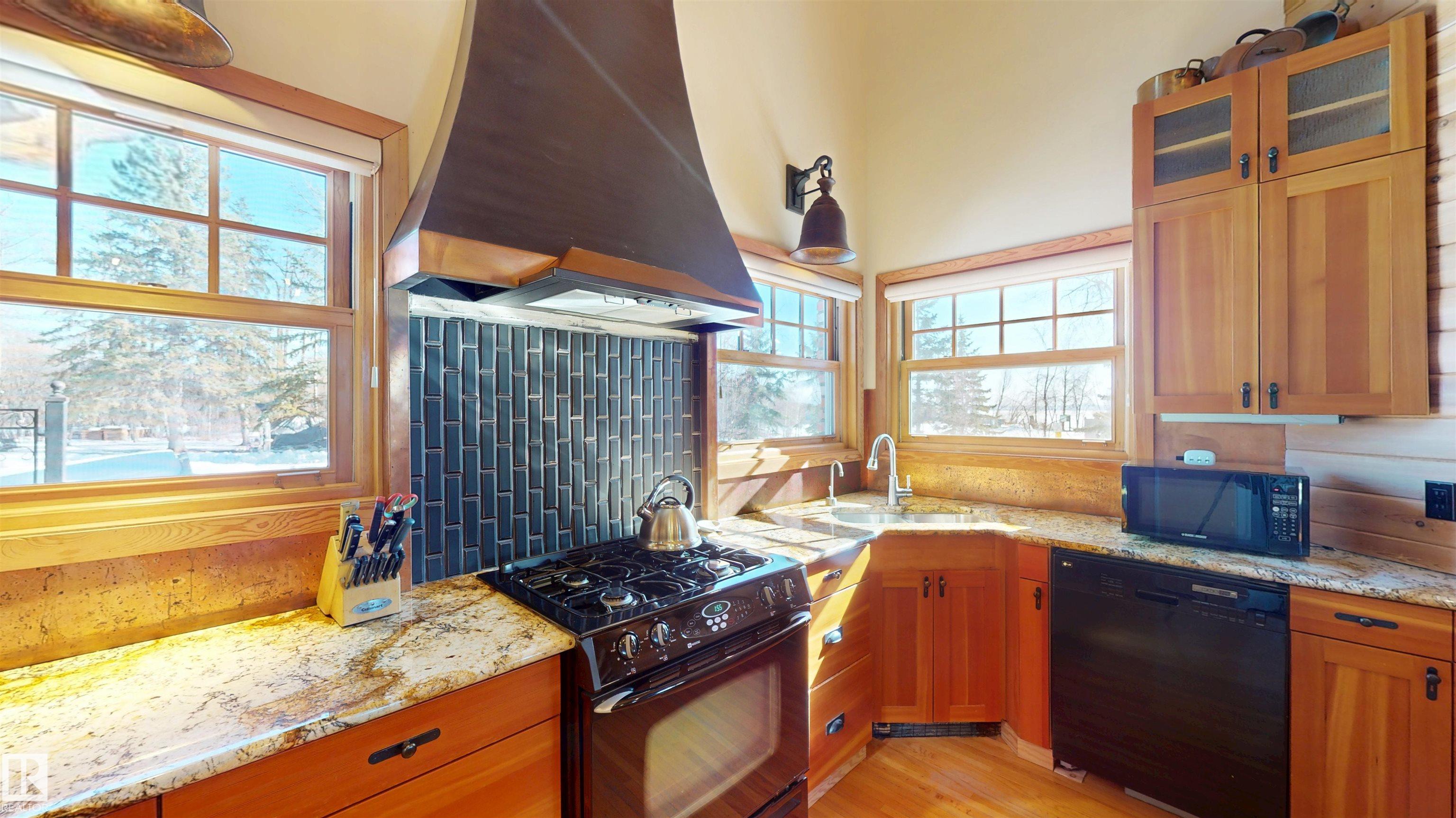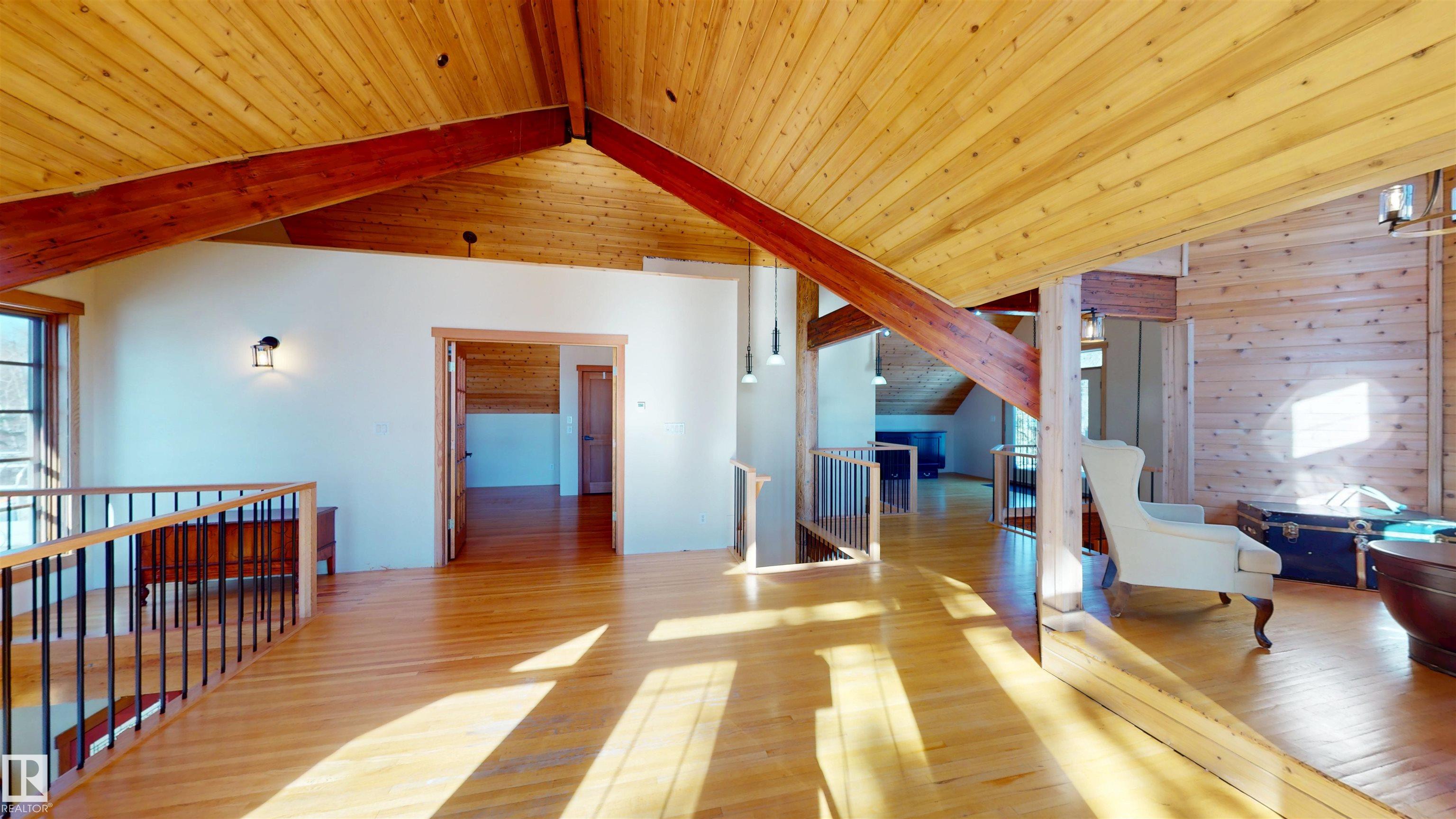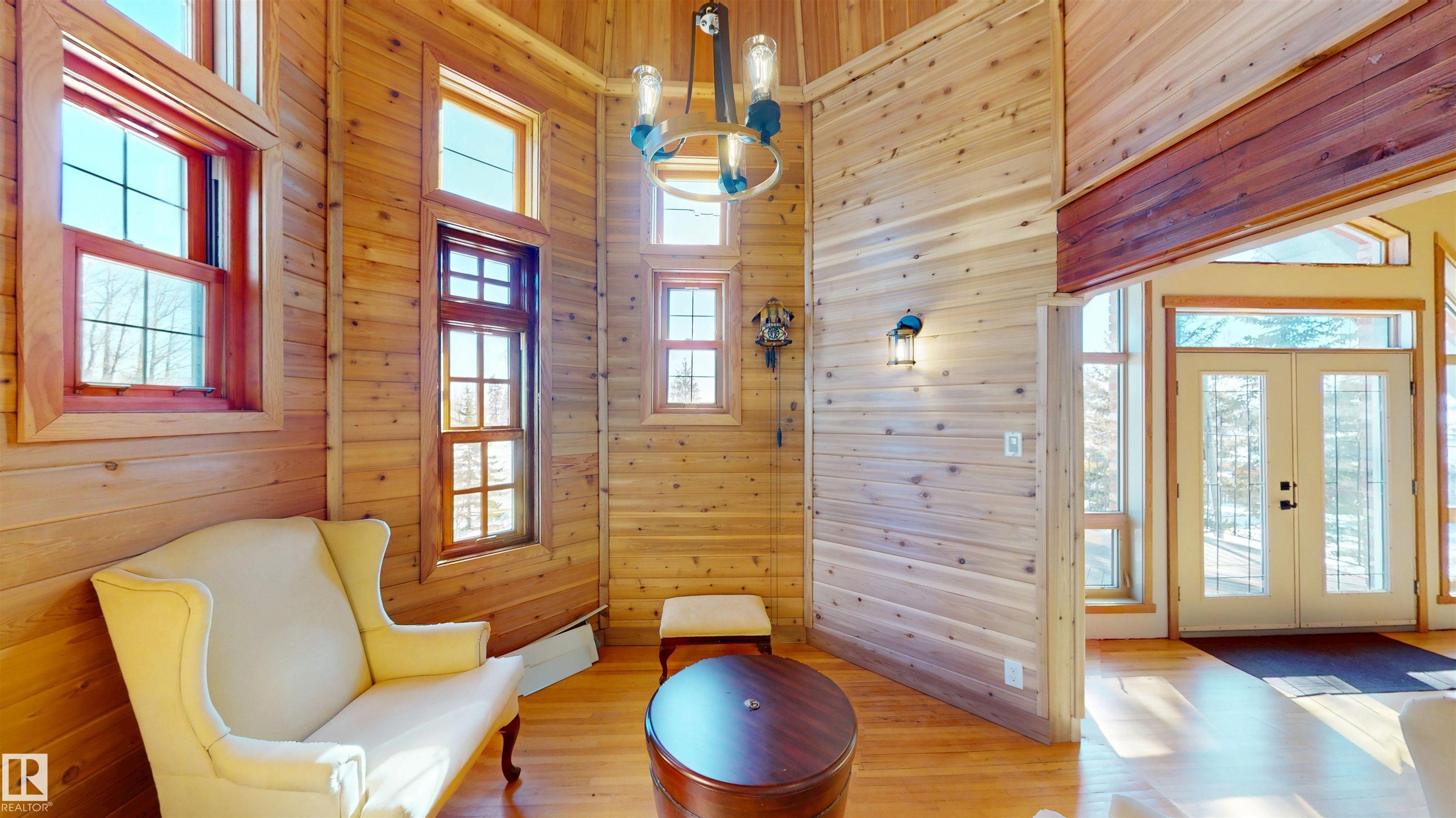 This striking home blends timeless character with standout design in a private, nature filled setting. Rich brickwork, dramatic rooflines, and a signature turret create unforgettable curb appeal, while expansive windows and upper balconies capture natural light and scenic lake views. Step inside from the beautifully landscaped yard into a truly one of a kind interior. The kitchen features custom wood cabinetry, granite countertops, a grand piano shaped island with bar seating, and premium appliances. The octagonal dining area impresses with vaulted ceilings, copper detailing, and wraparound windows. A stunning floor to ceiling brick fireplace anchors the living space. Upstairs offers a bright loft with vaulted pine ceilings, custom railings, and access to two balconies. The upper turret level, plumbed for a wet bar, doubles as a cozy retreat with incredible views. Complete with a spacious primary suite, ensuite bath, and refined finishes throughout, this home truly comes with all the bells and whistles!